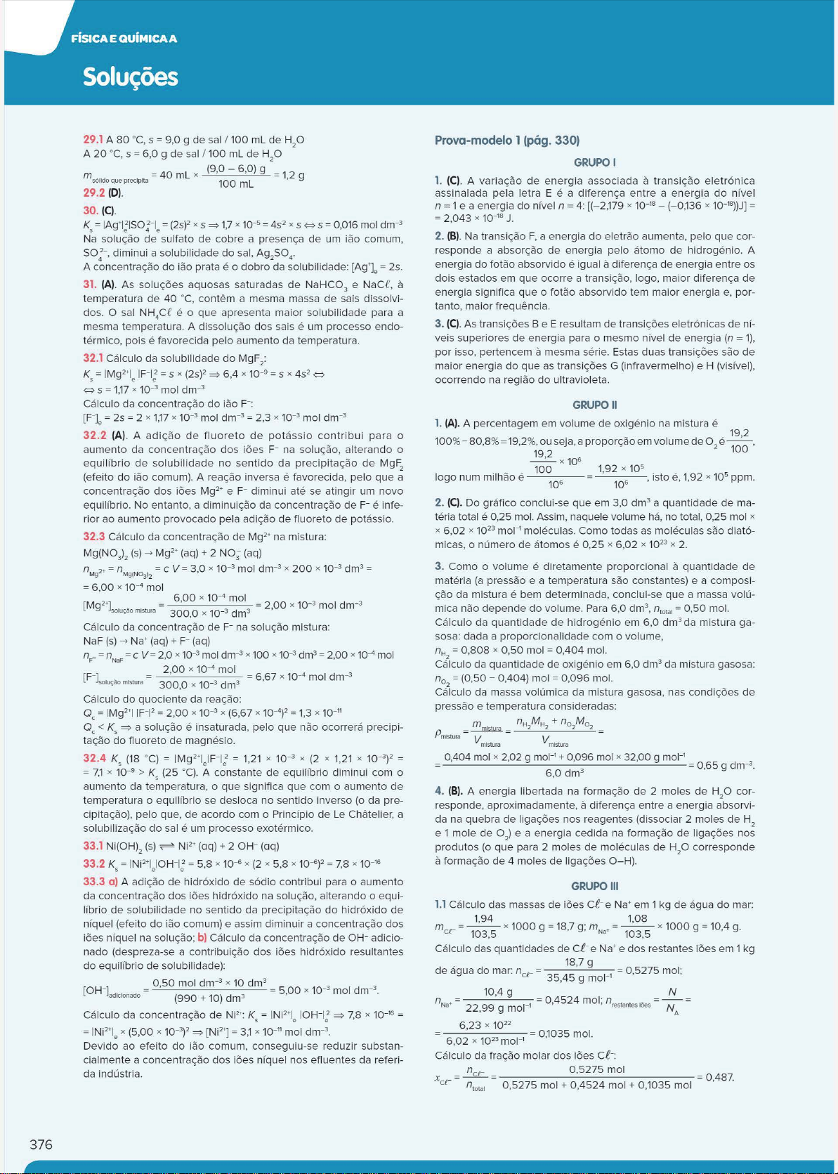 376 29.1 A 80 ºC, 5 = 9,0 g de sal / 100 ml de H2O A 20 ºC, 5 = 6,0 g de sal / 100 ml de H,O m = 40 ml x (9,0 - 5 ,0) g = 1,2 g sólldo que- precipita 100 ml 29.2 (D) 30. (C). Ks = IAg+I.,2IsO ;-1. = (25)2 X 5 ⇒ 1,7 X 10-5 = 452 X 5 K, (25 ºC). A constante de equilíbrio diminui com o aumento da temperatura, o que significa que com o aumento de temperatura o equilíbrio se desloca no sentido inverso (o da pre cipitação), pelo que, de acordo com o Princípio de Le Châtelier, a solubilização do sal é um processo exotérmico. 33.1 Ni(OH)2 (s) ,==>. Ni2' (aq) + 2 OH- (aq) 33.2 K, = INi2'I.IOH-l.,2 = 5,8 X 10-• X (2 X 5,8 X 10-6)2 = 7,8 X 10-t6 33.3 a) A adição de hidróxido de sódio contribui para o aumento da concentração dos iões hidróxido na solução, alterando o equi líbrio de solubilidade no sentido da precipitação do hidróxido de níquel (efeito do ião comum) e assim diminuir a concentração dos iões níquel na solução; b) Cálculo da concentração de OH- adicio nado (despreza-se a contribuição dos iões hidróxido resu ltantes do equilíbrio de solubilidade): 0,50 mol dm-3 x 10 dm3 [OH-Jao1eionado = ( 990 + 10 ) dm3 - 5,00 x 10-3 mol dm-3. Cálculo da concentração de Ni2' : K, = INi2'I. IOH-I.,2 ⇒ 7,8 x 10-1 • = = INi2'I. x (5,00 x 10-3)2 ⇒ [Ni21 = 3,1 x 10-11 mol dm-3 • Devido ao efeito do ião comum, conseguiu-se reduzir substan cialmente a concentração dos iões níquel nos efluentes da referi da indústria. Prova-modelo 1 (pág. 330) GRUPOI 1. (C) . A variação de energia associada à transição eletrónica assinalada pela letra E é a diferença entre a energia do nível n = 1 e a energia do nível n = 4: [(-2,179 x 10-1• - (-0,136 x 10-'8))J] = = 2,043 X 10-ts J. 2. (B). Na transição F, a energia do eletrão aumenta, pelo que cor responde a absorção de energia pelo átomo de hidrogénio. A energia do fotão absorvido é igual à diferença de energia entre os dois estados em que ocorre a transição, logo, maior diferença de energia significa que o fotão absorvido tem maior energia e, por tanto, maior frequência. 3. (C). As transições B e E resu ltam de transições eletrónicas de ní veis superiores de energia para o mesmo nível de energia (n = 1), por isso, pertencem à mesma série. Estas duas transições são de maior energia do que as transições G (infravermelho) e H (visível), ocorrendo na região do ultravioleta. GRUPO li 1. (A). A percentagem em volume de oxigénio na mistura é 10 19,2 0%- 80,8% =19,2%, ou seja, a proporção em volume de O é--, 19 2 2 100 --'-x 106 100 1 92 X 105 logo num milhão é 106 ' 106 isto é, 1,92 x 105 ppm. 2. (C). Do gráfico conclui-se que em 3,0 dm3 a quantidade de ma téria total é 0,25 mol. Assim, naquele volume há, no total, 0,25 mol x x 6,02 x 1023 moI-' moléculas. Como todas as moléculas são diató micas, o número de átomos é 0,25 x 6,02 x 1023 x 2. 3. Como o volume é diretamente proporcional à quantidade de matéria (a pressão e a temperatura são constantes) e a composi ção da mistura é bem determinada, conclui-se que a massa volú mica não depende do volume. Para 6,0 dm3, n,0,a1 = 0,50 mol. Cálculo da quantidade de hidrogénio em 6,0 dm3 da mistura ga sosa: dada a proporcionalidade com o volume, n" 2 = 0,808 x 0,50 mol = 0,404 mol. Cálculo da quantidade de oxigénio em 6,0 dm3 da mistura gasosa: n 02 = (0,50 - 0,404) mol = 0,096 mol. Cálculo da massa volúmica da mistura gasosa, nas condições de pressão e temperatura consideradas: m n" M" + no Mo p = ~ = 2 2 2 2 mlStura V mistura V mistura 0,404 mol x 2,02 g moI-1 + 0,096 mol x 32,00 g moI-1 6 ,0 dm3 = 0,65 g dm-3. 4. (B). A energia libertada na formação de 2 moles de H,O cor responde, aproximadamente, à diferença entre a energia absorvi da na quebra de ligações nos reagentes (dissociar 2 moles de H2 e 1 mole de 0 2) e a energia cedida na formação de ligações nos produtos (o que para 2 moles de moléculas de H2O corresponde à formação de 4 moles de ligações O-H). GRUPO Ili 1.1 Cálculo das massas de iões cf-e Na+ em 1 kg de água do mar: 1,94 1,08 mct_ = 103 5 x 1000 g = 18,7 g; mNa' = --- x 1000 g = 10,4 g. , 103,5 Cálculo das quantidades de cf-e Na+ e dos restantes iões em 1 kg 18,7 g de água do mar: ncr = 0,5275 mol; 10,4 g n =---~-- Na' 22,99 g moI-l 35,45 g moI-1 N 0,4524 mol; n,estanteslÕeS = N = A 6,23 X 1022 6,02 x 1023 mol-' 0,1035 mol. Cálculo da fração molar dos iões cf-: x = .!ls:L_ = 0,5275 mol cc- 75 = 0,487. n,0 ,,, 0,52 mol + 0 ,4524 mol + 0,1035 mol