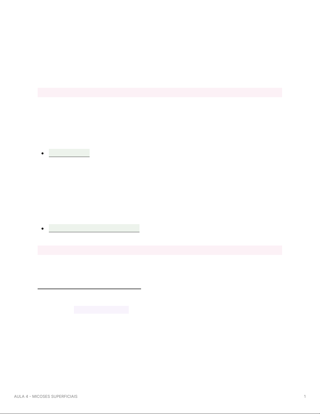 AULA 4 - MICOSES SUPERFICIAIS INTRODUÇÃO → são doenças causadas por fungos → micoses superficiais: atingem a epiderme, podendo atingir a derme superficial; o contágio inter-humano é frequente → classificadas em 2 grupos: ceratofitoses - atingem a epiderme/camada córnea, são saprófitos e geram resposta inflamatória mínima ou ausente � pitiríase versicolor � Tinea nigra � Piedra branca � Piedra preta dermatofitoses e caandidíase - atingem a derme papilar, são parasitas, atingem pelos e unhas e comumente geram resposta inflamatória CERATOFITOSES → são micoses essencialmente superficiais cujos fungos se localizam na ceratina da epiderme e dos pelos, sem provocar fenômenos inflamatórios e são saprófitas Pitiríase versicolor (pano branco) → não vem só de forma hipocrômica → etiologia: Malassezia furfur AULA 4 MICOSES SUPERFICIAIS 1 levedura lipofílica (folículo pilossebáceo) forma saprófita - células globosas e ovais forma parasitária - filamentos/ pseudohifas → fontes de infecção homem portador (lesões de PV homem sadio (portadores sãos) → fatores predisponentes clima tropical exposição solar exagerada fatores genéticos, imunológicos, hormonais dermatite seborreica → como reconhecer máculas arredondadas, bem delimitadas versicolor = hipocrômicas, acastanhadas, eritematosas localização mais comum: áreas seborreicas (tronco superior e ombros) e face AULA 4 MICOSES SUPERFICIAIS 2 → diagnóstico sinal de Zirelí - estiramento da pele ao redor da mancha, com aparecimento de descamação sinal da unha - atrito lesional, com exacerbação das escamas luz de Wood “amarelo-ouroˮ exame micológico direto - raspado de pele ou método de Porto - blastoconídios e hifas curtas, curvas e largas (espaguete com almôndegas) AULA 4 MICOSES SUPERFICIAIS 3 cultura - meio com óleo de oliva - culturas algodonosas OBS.: podem estar mascaradas pelo uso de corticoide - suspensão por 1015 dias e reavaliação das lesões → tratamento tópicos derivados imidazólicos (creme/loção) 2x ao dia p/ 15 a 30 dias - miconazol, clotrimazol, isoconazol, tioconazol, cetoconazol xampus - cetoconazol 2%, sulfeto de selênio 2,5%, piritionato de zinco 2% deixar agir por 1015 minutos, usar diariamente por 24 semanas oral (casos extensos) cetoconazol 200mg/dia, durante 10 dias - evitar devido à hepatotoxicidade itraconazol 200mg/dia durante 5 dias fluconazol 300mg/sem por 2 semanas OBS.: alteração da coloração da pele pode levar 12 meses ou mais para se resolver sinal de Zirelí - = não há atividade fúngica casos recidivantes xampus 1x/ semana fluconazol 300 mg 1x/mês ou itraconazol 400mg 1x/mês AULA 4 MICOSES SUPERFICIAIS 4 Tinea nigra → agente etiológico: Hortacea werneckii (fungo do solo) → fatores predisponentes → crianças que tem contato com terra e plantas → como reconhecer? mancha hipercrômica (acastanhada ou enegrecida) bem delimitada geralmente única assintomática em palmas, plantas, pescoço e tronco → tratamento tópico: miconazol 2%, clotrimazol, cetoconazol 2%, terbinafina 1% 2x ao dia por 2 a 4 semanas Piedra branca → agente etiológico: Trichosporon beigelii → infecção superficial da haste do pelo → couro cabeludo, haste dos pelos das áreas genitais, axilas, barba e bigode, também cílios e sobrancelhas → como reconhecer? nódulos moles de coloração branca, bege ou castanho claro 1 a 3 mm AULA 4 MICOSES SUPERFICIAIS 5 distribuídos de forma irregular nas hastes dos pelos assintomáticos separados das hastes com facilidade geralmente o paciente relata que as lesões são mais visíveis quando o cabelo está molhado → tratamento cortar o cabelo quando possível xampus com ação antifúngica (cetoconazol 2%, sulfeto de selênio 2,5%, piritionato de zinco 2% tratamento sistêmico nos casos refratários (itraconazol, fluconazol, terbinafina) não dormir ou prender o cabelo molhado Piedra preta → agente etiológico → Piedraie hortae → infecção superficial da haste do pelo → como reconhecer? AULA 4 MICOSES SUPERFICIAIS 6 nódulos que variam de marrom a preto distribuídos de maneira irregular na haste as concreções podem ser fusiformes e duras, com aparência de pequenas pedras firmemente presos ao cabelo e, portanto, não deslizam ou se movem ao longo da haste do cabelo assintomáticos → tratamento cortar o cabelo quando possível tópicos - terbinafina ou cetoconzaol 2% xampu oral - terbinafina DERMATOFITOSES Tineas) → são infecções fúngicas dos tecidos queratinizados (cabelos, pele e unhas) → agentes etiológicos Trichophyton spp Microsporum spp AULA 4 MICOSES SUPERFICIAIS 7 Epidermophyton spp → fontes de infeção antropofílicos (homem) - reação inflamatória geralmente menor geofílicos (solo) zoofílicos (animais) → formas clínicas � Tinea capitis comum em crianças 3 a 7 anos) placas de alopecia com descamação e pelos tonsurados em diferentes tamanhos Trichopyton faz lesões únicas (antropofílico) Microsporum faz múltiplas lesões (zoofílico - cães) pode ocorrer reação inflamatória mais intensa com pústulas/crostas linfadenomegalia cervical/occipital tratamento medicações tópicas são inefetivas (os fungos invadem os folículos pilosos) → xampus podem ser usados para diminuir descamação e disseminação AULA 4 MICOSES SUPERFICIAIS 8 medicação oral é mandatória Griseofulvina 1015 mg/kg/dia por 8 semanas Terbinafina 250mg/dia Itraconazol/ fluconazol � Tinea corporis lesões eritematosas, anulares ou circinadas PRURIGINOSAS bordas ativas (mais eritematosas, descamativas e com pápulas eritematosas e/ou vesículas) crescimento centrífugo com clareamento do centro da lesão � Tinea cruris AULA 4 MICOSES SUPERFICIAIS 9 placa eritematodescamativa na região inguinal avançando sobre as coxas, região pubiana ou nádegas bordas ativas, cresciemento centrífugo uni ou bilateral � Tinea pedis plantas e espaços interdigitais placa eritematodescamati