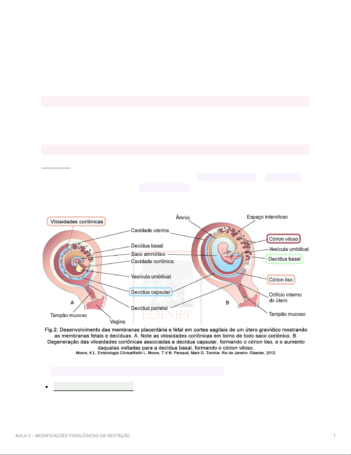 AULA 2 - MODIFICAÇÕES FISIOLÓGICAS DA GESTAÇÃO INTRODUÇÃO → durante a gravidez, o organismo feminino sofre diversas modificações com o intuito de adaptar e de preparar a mulher para o período da gestação e do parto, além de garantir condições para o desenvolvimento fetal SISTEMA GENITAL Placenta → órgão exclusivo do período gestacional, com formato discoidal, é deciduado (córion penetra na decídua) e hemocoriônico nos humanos (o sangue materno entra diretamente em contato com as células trofoblásticas) → funções exercidas pela placenta durante a gestação modulação imunológica, fazendo com que o organismo materno tolere os antígenos paternos AULA 2 MODIFICAÇÕES FISIOLÓGICAS DA GESTAÇÃO 1 produção de enzimas e hormônios passagem de nutrientes para o feto e excreção de metabólitos fetais trocas gasosas entre mãe e feto → transporte pela membrana placentária durante o termo fetal, cerca de 600 ml de sangue materno circulam pela placenta a cada minuto embora possuam duas circulações independentes, a barreira placentária não é capaz de isolar totalmente um ambiente do outro difusão simples - O2 e CO2 difusão facilitada - glicose GLUT1 e íons polares (BIC, Cl-, K, P, Mg++) transporte ativo - creatinina, ferro, cálcio, fosfatos, aminoácidos, lactato, etc pinocitose - albumina e IgG ultrafiltração (pressão hidrostática e canais) - sódio → hormônios placentários hCG - , pode apresentar reação cruzada com TSH, LH e FSH (a subunidade beta diferencia o hCG desses outros hormônios) produzida pelo sincíciotrofoblasto e depois pelas vilosidades coriônicas pode ser detectado no sangue a partir do 10º dia após a ovulação manutenção do corpo lúteo durante as primeiras semanas - produção de progesterona até a placenta assumir essa função os níveis dobram a cada 48h, atingindo o pico por volta da 8ª a 10ª semana, declinando até a 20ª semana e mantendo-se estáveis até o termo hPL (hormônio lactogênio placentário) - somatotrofina coriônica produzido pelo sincíciotrofoblasto, aumenta conforme o crescimento placentário aumenta a resistência periférica à ação da insulina - mais glicose disponível para o feto AULA 2 MODIFICAÇÕES FISIOLÓGICAS DA GESTAÇÃO 2 por isso é importante rastrear DG progesterona facilita a implantação embrionária - estimula a produção de catepsina → decomposição do colágeno e modificação das vilosidades uterinas → nidação relaxamento das fibras miometriais - inibindo as contrações uterinas (também do restante da musculatura lisa materna - TGI, vesícula e TGU) depressor do SNC - sonolência relaxamento da Mm. lisa dos brônquios - aumenta a ventilação aumento das mamas e formação dos lóbulos mamários inibição da lactogênese estrógenos (estradiol, estrona e estriol) estado hiperestrogênico ao final da gestação estimulam a produção de proteínas transportadoras de hormônios contratilidade, hiperplasia e hipertrofia endometrial aumento do fluxo sanguíneo uteroplacentário produção de prolactina e inibição da lactogênese durante a gestação aumento da contratilidade do miocárdio - aumento do DC AULA 2 MODIFICAÇÕES FISIOLÓGICAS DA GESTAÇÃO 3 retenção hídrica (embebição gravídica) hormônio tireotrófico coriônico - semelhante ao TSH (maior concentração durante o 1º trimestre) hormônio adrenocorticotrófico - semelhante ao ACTH hormônios coriônicos semelhantes aos hormônios hipotalâmicos GnRH CRH - síntese de prostaglandinas, vasodilatação, glicocorticoides fetais (maturação pulmonar 3º trimestre) Útero → o istmo se alonga 8ª12ª sem) e até a 16ª semana está incorporado ao corpo uterino = segmento inferior as artérias uterinas são transversas a esse segmento histerotomia segmentar transversa → o endométrio onde o embrião se implanta passa a se chamar decídua basal e a parte sem implantação de decídua parietal → a partir da 16ª semana, o feto passa a ocupar a cavidade uterina por completo → decídua reflexa → na gestação, o útero passa a ter um formato ovóide assimétrico - sinal de Piskacek (até 20ª semana) → sinal de Nobile-Bundin → ocupação dos fórnices vaginais laterais por embebição gravídica AULA 2 MODIFICAÇÕES FISIOLÓGICAS DA GESTAÇÃO 4 → sinal de Hegar → útero fica violáceo, amolecido e anterovertido → aumento da vascularização do colo e eversão da mucosa da endocérvice → pode haver sangramento genital → sinal de Goodell → colo fica mais macio Vagina → hiperemia e edema da parede vaginal → sinal de Kluge (arroxeamento) → sinal de Oslander → palpação dos pulsos das artérias vaginais nos fórnices laterais → aumento da elasticidade vaginal → redução do pH progesterona → aumento do glicogênio e dos lactobacilos → sinal de Jacquemier-Chadwick - mudança de coloração da vulva AULA 2 MODIFICAÇÕES FISIOLÓGICAS DA GESTAÇÃO 5 → pode haver varizes vulvares Mamas → o desenvolvimento completo das mamas só ocorre após a gestação e a amamentação → tubérculos de Montgomery - hipertrofia das glândulas sebáceas ao redor dos mamilos → rede de Haller - aumento da vascularização do tecido glandular Sinais de Indicação Clínica da Gravidez Inicial - alterações no colo do útero devido ao aumento da vascularização e circulação sanguínea. Goodell Amolecimento do colo do útero nas primeiras 48 semanas de gestação devido à hipertrofia e crescimento de novos vasos sanguíneos. Chadwick Coloração azulada ou arroxeada do colo do útero, vagina e vulva, causada pelo aumento do fluxo sanguíneo. Hegar Amolecimento do segmento inferior do útero, detectável pelo exame bimanual. AULA 2 MODIFICAÇÕES FISIOLÓGICAS DA GESTAÇÃO 6 SISTEMA CARDIOCIRCULATÓRIO E HEMATOLÓGICO Alterações hematológicas Durante a gestação, observa-se o aumento da volemia materna 30 a 50% elevação da demanda de irrigação do útero c