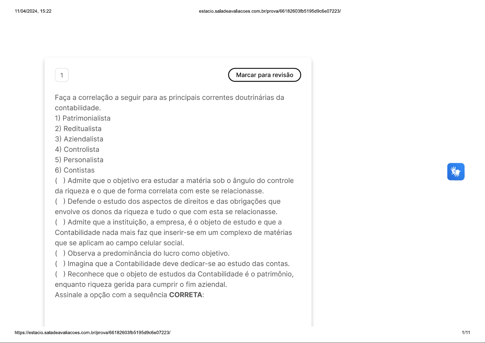 11/04/2024, 15:22 1 Marcar para revisão Faça a correlação a seguir para as principais correntes doutrinárias da contabilidade. 1) Patrimonialista 2) Reditualista 3) Aziendalista 4) Controlista 5) Personalista 6) Contistas ( ) Admite que o objetivo era estudar a matéria sob o ângulo do controle da riqueza e o que de forma correlata com este se relacionasse. ( ) Defende o estudo dos aspectos de direitos e das obrigações que envolve os donos da riqueza e tudo o que com esta se relacionasse. ( ) Admite que a instituição, a empresa, é o objeto de estudo e que a Contabilidade nada mais faz que inserir-se em um complexo de matérias que se aplicam ao campo celular social. ( ) Observa a predominância do lucro como objetivo. ( ) Imagina que a Contabilidade deve dedicar-se ao estudo das contas. ( ) Reconhece que o objeto de estudos da Contabilidade é o patrimônio, enquanto riqueza gerida para cumprir o fim aziendal. Assinale a opção com a sequência CORRETA: 1/1111/04/2024, 15:22 estacio.saladeavaliacoes.com.br/prova/66182603fb5195d9c6e07223/ A 5-3-2-6-1-4. B 6-1-4-5-3-2. C 3-2-6-1-4-5. D 4-5-3-2-6-1. E 2-6-1-4-5-3. 2 Marcar para revisão Ao longo da história da Contabilidade, a classificação das contas tem dividido os doutrinadores entre várias respostas, resultando em formas diferentes de classificação e interpretação das contas. No Brasil, a teoria usualmente utilizada é a Patrimonialista. Duas outras teorias importantes são a Materialista e a Personalista. Dadas as afirmativas a respeito dessas teorias, - - A Teoria Patrimonialista classifica as contas em dois tipos: Proprietários e de Resultado. https://estacio.saladeavaliacoes.com.br/prova/66182603fb5195d9c6e07223/ 2/1111/04/2024, 15:22 II - - A Teoria Materialista classifica as contas em dois tipos: Integrais ou Elementares e Diferenciais ou Derivadas. III - - A Teoria Personalista classifica as contas em dois tipos: Agentes Consignatários e Agentes Correspondentes. Verifica-se que está(ão) correta(s) apenas: A II. B e II. C I. D e III. E III. 3 Marcar para revisão A prática contábil, inicialmente focada no controle patrimonial, evoluiu significativamente. Com o advento das Normas Brasileiras de Contabilidade, houve um movimento em direção à transparência e https://estacio.saladeavaliacoes.com.br/prova/66182603fb5195d9c6e07223/ 3/1111/04/2024, 15:22 relevância da informação contábil. Este cenário desafiou os profissionais a se adaptarem rapidamente às mudanças normativas. Qual é um dos principais objetivos das Normas Brasileiras de Contabilidade (NBCs)? A Garantir a transparência e relevância das informações contábeis. B Promover a uniformidade de práticas contábeis entre os países. C Reduzir a carga tributária sobre as empresas. D Diminuir a complexidade dos processos de auditoria. E Centralizar o controle das operações financeiras das empresas. 4 Marcar para revisão Sobre as características da teoria positiva da Contabilidade, assinale a alternativa correta: 4/1111/04/2024, 15:22 estacio.saladeavaliacoes.com.br/prova/66182603fb5195d9c6e07223/ A Preocupa-se em descrever como a Contabilidade deve ser. B Tem foco de pesquisas qualitativas. Descreve como a Contabilidade é, por que é assim e prevê C comportamentos. D Possui caráter predominantemente subjetivo. E Tem como objetivo a construção de teorias. 5 Marcar para revisão Sobre as teorias normativa e positiva da Contabilidade, assinale a alternativa incorreta: 5/1111/04/2024, 15:22 estacio.saladeavaliacoes.com.br/prova/66182603fb5195d9c6e07223/ A teoria normativa apresenta pouca preocupação com os A métodos de evidenciação empírica. B A teoria positiva utiliza conceitos amplamente genéricos. A teoria normativa volta-se para o desenvolvimento de práticas e C normas contábeis que determinam "como deve ser feito". A teoria positiva teve início com o desenvolvimento de teorias D econômicas de mercado no final da década de 1960. A teoria positiva busca explicar como a Contabilidade é, sem E ideias preconcebidas. 6 Marcar para revisão Alguns tipos de decisões envolvendo o fornecimento de recursos para a entidade podem ser tomadas pelos investidores e credores com base nas informações financeiras contidas nas demonstrações financeiras, de acordo com a Estrutura Conceitual adotada pelo IASB. Assinale a alternativa que indica uma dessas decisões. 6/1111/04/2024, 15:22 A Decisões envolvendo a gestão dos recursos da entidade. B Decisões envolvendo a remuneração dos executivos da entidade. C Decisões envolvendo a contratação de fornecedores da entidade. Decisões envolvendo a compra, venda ou manutenção de D instrumento de patrimônio e de dívida. Decisões envolvendo a realização de investimentos em outras E empresas. 7 Marcar para revisão Uma empresa de tecnologia, após uma análise de mercado, decide alterar sua política contábil para refletir melhor as tendências atuais. Esta mudança envolve a reavaliação de ativos e ajustes nas práticas de depreciação. Qual princípio contábil é mais diretamente impactado por esta mudança? 7/1111/04/2024, 15:22 estacio.saladeavaliacoes.com.br/prova/66182603fb5195d9c6e07223/ A Materialidade. B Continuidade. C Comparabilidade. D Consistência. E Relevância. 8 Marcar para revisão Luca Pacioli publicou em Veneza a Summa de Arithmetica, geometria, proportioni et proportionalità, em 1494, texto no qual se distingue, para a história da Contabilidade, Tractatus de computis et screipturis; talvez a primeira exposição sistemática e completa do Método das Partidas Dobradas. (Adaptada de SCHMIDT, 2008.) Em relação ao Método das Partidas Dobradas, assinale a afirmativa INCORRETA: https://estacio.saladeavaliacoes.com.br/prova/66182603fb5195d9c6e07223/ 8/1111/04/2024, 15:22 Método aceito universalmente pela contabilidade; tem como A princípio fundamental que para cada aplicação de recursos corresponde uma fonte de recursos de igual valor. Método segun