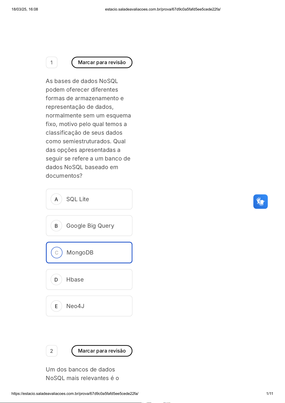 A B C D E 1 Marcar para revisão As bases de dados NoSQL podem oferecer diferentes formas de armazenamento e representação de dados, normalmente sem um esquema fixo, motivo pelo qual temos a classificação de seus dados como semiestruturados. Qual das opções apresentadas a seguir se refere a um banco de dados NoSQL baseado em documentos? SQL Lite Google Big Query MongoDB Hbase Neo4J 2 Marcar para revisão Um dos bancos de dados NoSQL mais relevantes é o 18/03/25, 16:08 estacio.saladeavaliacoes.com.br/prova/67d9c0a5fafd5ee5cede22fa/ https://estacio.saladeavaliacoes.com.br/prova/67d9c0a5fafd5ee5cede22fa/ 1/11 A B C D E MongoDB, do tipo documental, que pode ser acessado facilmente por ambientes construídos na plataforma Node.js, através da classe MongoClient. Qual a opção correta acerca do MongoDB? Permite trabalhar no modelo de grafos, da mesma forma que o Neo4J. Oferece o aplicativo gráfico MongoDB Compass para a gerência da base. Todo documento do MongoDB exige um campo identificador com o nome key. Os documentos armazenados na base utilizam sintaxe XML. Não é possível utilizar expressões regulares nas consultas aos documentos. 3 Marcar para revisão Observe o fragmento de código apresentado a seguir, parte de 18/03/25, 16:08 estacio.saladeavaliacoes.com.br/prova/67d9c0a5fafd5ee5cede22fa/ https://estacio.saladeavaliacoes.com.br/prova/67d9c0a5fafd5ee5cede22fa/ 2/11 A B um aplicativo criado na plataforma React Native. Qual será o resultado da execução desse trecho de código? Uma conexão será obtida de forma assíncrona, sendo utilizada, a seguir, para iniciar uma transação e, a partir dela, inserir um registro no banco de dados. Será efetuada uma conexão com o banco de dados, configurado para o arquivo ''Escola.db'', e na sequência a tabela ALUNOS é gerada no banco. 18/03/25, 16:08 estacio.saladeavaliacoes.com.br/prova/67d9c0a5fafd5ee5cede22fa/ https://estacio.saladeavaliacoes.com.br/prova/67d9c0a5fafd5ee5cede22fa/ 3/11 C D E Uma conexão será obtida de forma síncrona, sendo utilizada, em seguida, para gerar uma transação e, a partir dela, alterar os dados do aluno 120076. Será criada uma tabela com o nome ''Escola.db'', sendo inserido um registro com o nome ALUNOS, e valores indefinidos, devido ao uso de interrogações. Será criado um banco de dados com o nome ALUNOS, e na sequência os registros 120076 e ''Luiz Paulo'' serão removidos da tabela ''Escola.db''. 4 Marcar para revisão A linguagem SQL é muito eficaz para as consultas complexas, e boa parte do sucesso se deve ao conjunto de operadores disponibilizados para a filtragem, através da cláusula WHERE. Qual dos operadores a seguir permite 00 hora : 32 min : 49 seg Ocultar Questão 7 de 10 SM2 Programação Para Dispositivos Móveis… 18/03/25, 16:08 estacio.saladeavaliacoes.com.br/prova/67d9c0a5fafd5ee5cede22fa/ https://estacio.saladeavaliacoes.com.br/prova/67d9c0a5fafd5ee5cede22fa/ 4/11 A B C D E A B buscar os nomes iniciados por uma letra específica? IN LIKE ANY ALL NOT IN 5 Marcar para revisão O HTTP é um protocolo da camada de Aplicação do modelo OSI (acrônimo do inglês Open System Interconnection). O HTTP, base para a comunicação Web, define em sua estrutura um conjunto de métodos de requisição. Marque a opção abaixo que corresponda a um dos métodos HTTP: PUT IMAP Respondidas (10) Em branco (0) Finalizar prova 1 2 3 4 5 6 7 8 9 10 18/03/25, 16:08 estacio.saladeavaliacoes.com.br/prova/67d9c0a5fafd5ee5cede22fa/ https://estacio.saladeavaliacoes.com.br/prova/67d9c0a5fafd5ee5cede22fa/ 5/11 C D E A B C STP POP RSTP 6 Marcar para revisão Assinale, dentre as opções abaixo, a alternativa que representa o conjunto de elementos normalmente presentes em requisições realizadas com controle de acesso utilizando o framework OAuth2: Aplicativo cliente, Servidor de Recurso externo/API, Servidor de autorização, Token; Usuário, senha, e- mail; LDAP, HTTPS, SSL; 18/03/25, 16:08 estacio.saladeavaliacoes.com.br/prova/67d9c0a5fafd5ee5cede22fa/ https://estacio.saladeavaliacoes.com.br/prova/67d9c0a5fafd5ee5cede22fa/ 6/11 D E A B C D E SSO, Servidor de Criptografia, Algoritmo de Criptografia; Chave Privada, Chave Pública, Aplicativo Cliente, Servidor de Aplicação. 7 Marcar para revisão Dentre os elementos-chave em uma conexão remota, considerando o lado cliente, ou seja, o aplicativo, encontram- se: XMLHttpRequest, JSON (ou XML), Flatlist WSDL, SOAP, Rest HTML, CSS, Javascript Java, PHP, ASP.Net Webservice, API, Restful 18/03/25, 16:08 estacio.saladeavaliacoes.com.br/prova/67d9c0a5fafd5ee5cede22fa/ https://estacio.saladeavaliacoes.com.br/prova/67d9c0a5fafd5ee5cede22fa/ 7/11 A B C D E 8 Marcar para revisão Técnicas formais para execução de testes e análise de performance devem ser utilizadas para a garantia da qualidade do produto. Alguns problemas comuns estão relacionados ao tempo de resposta, outros ao consumo de memória, e há ainda os fatores de usabilidade do produto. Qual das alternativas define um problema relacionado ao consumo de memória? Memory leak Deadlock Promise rejection Format exception Starvation 9 Marcar para revisão Ao efetuar a persistência em banco de dados, pode ser necessário ocultar informações de determinados campos, com 18/03/25, 16:08 estacio.saladeavaliacoes.com.br/prova/67d9c0a5fafd5ee5cede22fa/ https://estacio.saladeavaliacoes.com.br/prova/67d9c0a5fafd5ee5cede22fa/ 8/11 A B C a possibilidade de recuperação posterior, ou seja, devem ser adotados algoritmos de criptografia simétrica, em que o AES tem sido a principal opção para as plataformas móveis mais populares. Tendo como base a biblioteca CryptoJS, como podemos utilizar o algoritmo AES no desenvolvimento com React Native? É necessário instanciar um objeto do tipo Cipher, com a passagem do algoritmo AES, chave e IV, e utilizar os métodos encrypt e decrypt do objeto. Não é possível trabalhar com o algoritmo AES no React Native, pois a biblioteca CryptoJS não fornece um gestor apr