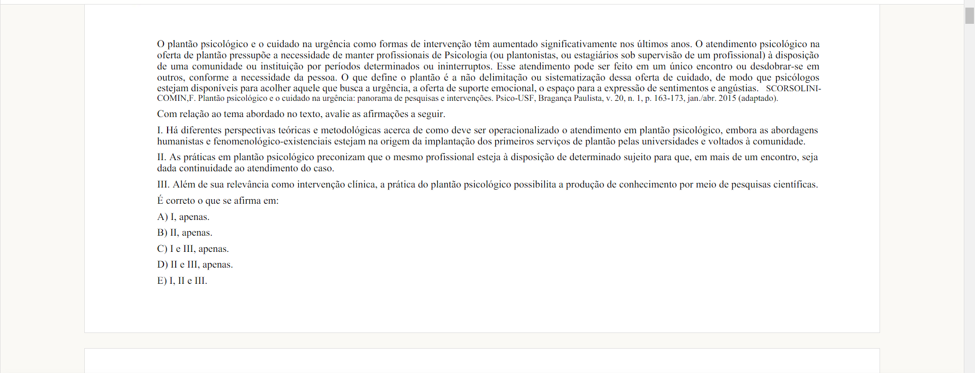 plantão psicológico e o cuidado na urgência como formas de intervenção têm aumentado significativamente nos anos. O atendimento psicológico na oferta de plantão pressupõe a necessidade de manter profissionais de Psicologia (ou plantonistas, ou estagiários sob supervisão de um profissional) à disposição de uma comunidade ou instituição por períodos determinados ou ininterruptos. Esse atendimento pode ser feito em um único encontro ou desdobrar-se em outros, conforme a necessidade da pessoa. que define o plantão é a não delimitação ou sistematização dessa oferta de cuidado, de modo que psicólogos estejam disponíveis para acolher aquele que busca a urgência, a oferta de suporte emocional, o espaço para a expressão de sentimentos e angústias. SCORSOLINI- COMIN,F. Plantão psicológico e o cuidado na urgência: panorama de pesquisas e intervenções. Bragança Paulista, V. 20, n. 1, p. 163-173, jan./abr. 2015 (adaptado). Com relação ao tema abordado no texto, avalie as afirmações a seguir I. Há diferentes perspectivas teóricas e metodológicas acerca de como deve ser operacionalizado o atendimento em plantão psicológico, embora as abordagens humanistas e fenomenológico-existenciais estejam na origem da implantação dos primeiros serviços de plantão pelas universidades e voltados à comunidade. II. As práticas em plantão psicológico preconizam que o mesmo profissional esteja à disposição de determinado sujeito para que, em mais de um encontro, seja dada continuidade ao atendimento do caso. III. Além de sua relevância como intervenção clínica, a prática do plantão psicológico possibilita a produção de conhecimento por meio de pesquisas científicas. É correto o que se afirma em: A) I, apenas. B) II, apenas. C) I e III, apenas. D) II e III, apenas. E) I, II e III.
