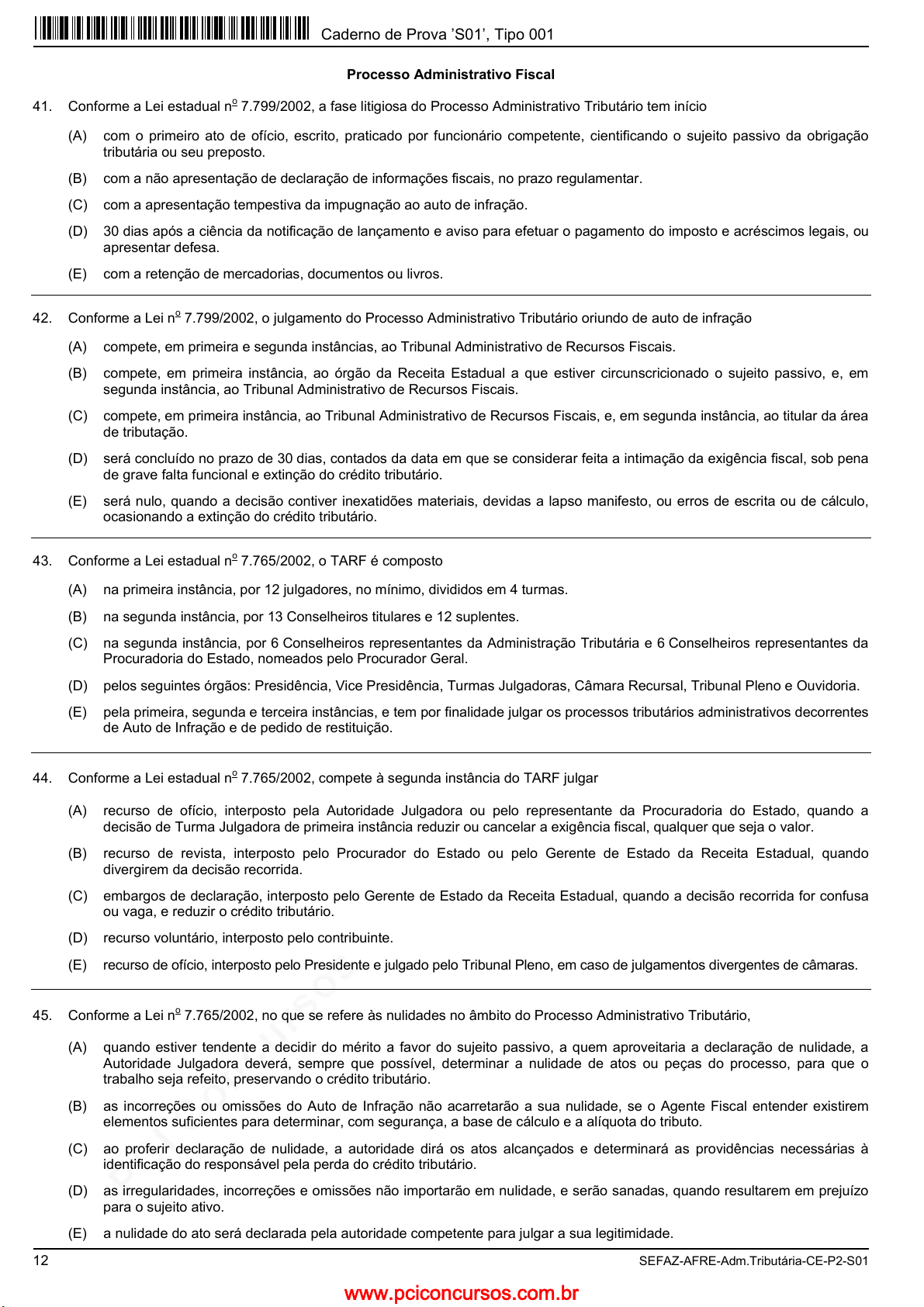 pcimarkpci MDAwMDowMDAwOjAwMDA6MDAwMDowMDAwOmZmZmY6MmRlODoyNjVi:V2VkLCAwMiBOb3YgMjAyMiAxODoyOTo0MCAtMDMwMA== www.pciconcursos.com.br 12 SEFAZ-AFRE-Adm.Tributária-CE-P2-S01 Processo Administrativo Fiscal 41. Conforme a Lei estadual n o 7.799/2002, a fase litigiosa do Processo Administrativo Tributário tem início (A) com o primeiro ato de ofício, escrito, praticado por funcionário competente, cientificando o sujeito passivo da obrigação tributária ou seu preposto. (B) com a não apresentação de declaração de informações fiscais, no prazo regulamentar. (C) com a apresentação tempestiva da impugnação ao auto de infração. (D) 30 dias após a ciência da notificação de lançamento e aviso para efetuar o pagamento do imposto e acréscimos legais, ou apresentar defesa. (E) com a retenção de mercadorias, documentos ou livros. 42. Conforme a Lei n o 7.799/2002, o julgamento do Processo Administrativo Tributário oriundo de auto de infração (A) compete, em primeira e segunda instâncias, ao Tribunal Administrativo de Recursos Fiscais. (B) compete, em primeira instância, ao órgão da Receita Estadual a que estiver circunscricionado o sujeito passivo, e, em segunda instância, ao Tribunal Administrativo de Recursos Fiscais. (C) compete, em primeira instância, ao Tribunal Administrativo de Recursos Fiscais, e, em segunda instância, ao titular da área de tributação. (D) será concluído no prazo de 30 dias, contados da data em que se considerar feita a intimação da exigência fiscal, sob pena de grave falta funcional e extinção do crédito tributário. (E) será nulo, quando a decisão contiver inexatidões materiais, devidas a lapso manifesto, ou erros de escrita ou de cálculo, ocasionando a extinção do crédito tributário. 43. Conforme a Lei estadual n o 7.765/2002, o TARF é composto (A) na primeira instância, por 12 julgadores, no mínimo, divididos em 4 turmas. (B) na segunda instância, por 13 Conselheiros titulares e 12 suplentes. (C) na segunda instância, por 6 Conselheiros representantes da Administração Tributária e 6 Conselheiros representantes da Procuradoria do Estado, nomeados pelo Procurador Geral. (D) pelos seguintes órgãos: Presidência, Vice Presidência, Turmas Julgadoras, Câmara Recursal, Tribunal Pleno e Ouvidoria. (E) pela primeira, segunda e terceira instâncias, e tem por finalidade julgar os processos tributários administrativos decorrentes de Auto de Infração e de pedido de restituição. 44. Conforme a Lei estadual n o 7.765/2002, compete à segunda instância do TARF julgar (A) recurso de ofício, interposto pela Autoridade Julgadora ou pelo representante da Procuradoria do Estado, quando a decisão de Turma Julgadora de primeira instância reduzir ou cancelar a exigência fiscal, qualquer que seja o valor. (B) recurso de revista, interposto pelo Procurador do Estado ou pelo Gerente de Estado da Receita Estadual, quando divergirem da decisão recorrida. (C) embargos de declaração, interposto pelo Gerente de Estado da Receita Estadual, quando a decisão recorrida for confusa ou vaga, e reduzir o crédito tributário. (D) recurso voluntário, interposto pelo contribuinte. (E) recurso de ofício, interposto pelo Presidente e julgado pelo Tribunal Pleno, em caso de julgamentos divergentes de câmaras. 45. Conforme a Lei n o 7.765/2002, no que se refere às nulidades no âmbito do Processo Administrativo Tributário, (A) quando estiver tendente a decidir do mérito a favor do sujeito passivo, a quem aproveitaria a declaração de nulidade, a Autoridade Julgadora deverá, sempre que possível, determinar a nulidade de atos ou peças do processo, para que o trabalho seja refeito, preservando o crédito tributário. (B) as incorreções ou omissões do Auto de Infração não acarretarão a sua nulidade, se o Agente Fiscal entender existirem elementos suficientes para determinar, com segurança, a base de cálculo e a alíquota do tributo. (C) ao proferir declaração de nulidade, a autoridade dirá os atos alcançados e determinará as providências necessárias à identificação do responsável pela perda do crédito tributário. (D) as irregularidades, incorreções e omissões não importarão em nulidade, e serão sanadas, quando resultarem em prejuízo para o sujeito ativo. (E) a nulidade do ato será declarada pela autoridade competente para julgar a sua legitimidade. Caderno de Prova ’S01’, Tipo 001 www.pciconcursos.com.br pcimarkpci MDAwMDowMDAwOjAwMDA6MDAwMDowMDAwOmZmZmY6MmRlODoyNjVi:V2VkLCAwMiBOb3YgMjAyMiAxODoyOTo0MCAtMDMwMA== www.pciconcursos.com.br SEFAZ-AFRE-Adm.Tributária-CE-P2-S01 13 Contabilidade Geral Avançada 46. Uma empresa importou um lote de mercadorias para comercialização no Brasil, sendo que a compra foi realizada em outubro de 2013 e o preço pago à vista ao fornecedor no exterior foi R$ 3.000.000,00. Os gastos descritos a seguir foram necessários para a empresa dispor das mercadorias em condições de venda, e foram todos pagos à vista: − Gasto de R$ 300.000,00 para transportar as mercadorias do país de origem até o Brasil. − Taxas e tarifas no valor de R$ 120.000,00 para o ingresso e regularização das mercadorias no Brasil. − Imposto de importação no valor de R$ 30.000,00. Este imposto é definitivo e não é compensável pela empresa. − Gasto de R$ 50.000,00 para transporte das mercadorias até o depósito da empresa. − Impostos locais no valor de R$ 45.000,00 que podem ser compensados com os impostos incidentes no momento da venda das mercadorias. Sabe-se que não havia saldo de estoque antes desta compra e que, em dezembro de 2013, a empresa vendeu oitenta por cento (80%) das mercadorias que haviam sido importadas. O valor evidenciado pela empresa no Balanço Patrimonial de 31/12/2013, exclusivamente em relação às mercadorias importadas remanescentes, foi, em reais: (A) 600.000,00. (B) 709.000,00. (C) 700.000,00. (D) 630.000,00. (E) 606.000,00 47. No dia 01/12/2014, a 