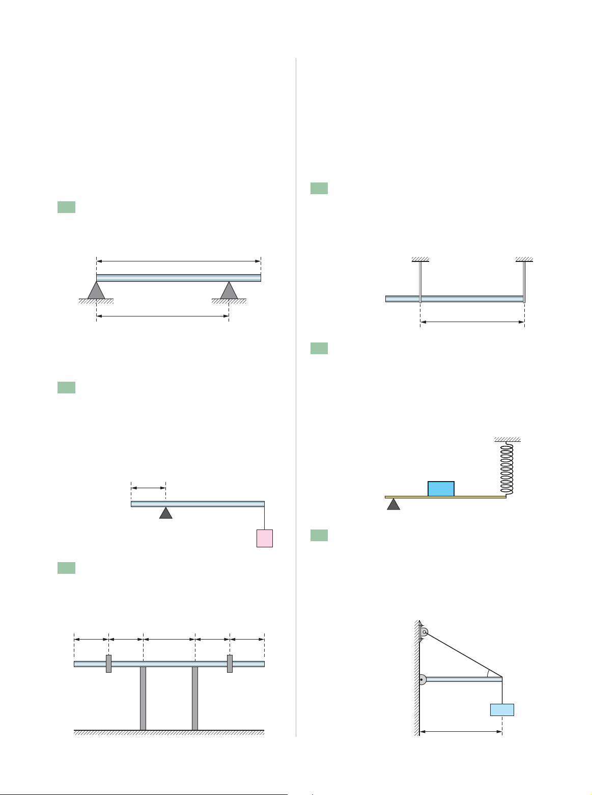 46 a) A força de atrito estático entre A e a superfície horizontal vale 196 N. b) A reação normal do plano sobre A, vale 196 N. c) Há uma força de 294 N puxando o bloco A para a direita. d) O bloco A não pode se mover porque não há for- ça puxando-o para a direita. e) O bloco B não pode se mover porque não há for- ça puxando-o para baixo. 253 (Unic-MT) A barra homogênea de peso P � 2 000 N está em equilíbrio sobre dois apoios. A força de reação no ponto B vale: a) 2 000 N c) 1 500 N e) 2 250 N b) 1 000 N d) 1 250 N 254 (Med. Catanduva-SP) Uma barra AB, homogê- nea e de secção reta e uniforme, de 80 cm de com- primento e peso 50 N, está apoiada num ponto O, como mostra a figura. O peso Q é de 100 N. Para o equilíbrio horizontal da barra AB, deve-se suspender à extremidade A um peso de: a) 150 N b) 250 N c) 350 N d) 500 N e) 400 N 255 (UEL-PR) Numa academia de ginástica, dois estu- dantes observam uma barra apoiada em dois pon- tos e que sustenta duas massas de 10 kg, uma de cada lado, conforme a figura a seguir. a) 1,0 � 102 N b) 2,0 � 102 N c) 3,0 � 102 N d) 4,0 � 102 N e) 5,0 � 102 N Após consultarem o professor, obtiveram a informa- ção de que a massa da barra era 12 kg. Dessa for- ma, concluíram que seria possível acrescentar em um dos lados da barra, junto à massa já existente e sem que a barra saísse do equilíbrio, uma outra massa de, no máximo: a) 10 kg c) 20 kg e) 30 kg b) 12 kg d) 24 kg 256 (Unitau-SP) Uma barra homogênea de 1,0 m de comprimento e peso igual a 30 N está suspensa por dois fios verticais, conforme a figura, manten- do-se na posição horizontal. As trações T1 e T2 nos fios 1 e 2 valem, respectivamente: a) 5 N; 15 N b) 10 N; 20 N c) 20 N; 20 N d) 20 N; 10 N e) 15 N; 15 N 257 (Fatec-SP) Uma tábua homogênea e uniforme de 3 kg tem uma de suas extremidades sobre um apoio e a outra é sustentada por um fio ligado a uma mola, conforme a figura. Sobre a tábua encon- tra-se uma massa m � 2 kg. Considerando a acele- ração da gravidade g � 10 m/s2, podemos afirmar que, com relação à força F → que a mola exerce: a) F � 50 N b) F � 25 N c) F � 25 N d) F 25 N e) F → ∞ 258 (Acafe-SC) A barra OP, uniforme, cujo peso é 1,0 � 102 N, pode girar livremente em torno de O. Ela sustenta, na extremidade P, um corpo de peso 2,0 � 102 N. A barra é mantida em equilíbrio, em posição horizontal, pelo fio de sustentação PQ. Qual é o valor da força de tração no fio? A B 10 m 8 m A B 20 cm Q O 40 cm 40 cm 40 cm 40 cm60 cm 0,75 m 1 2 m 1,0 m A O P 30° 2,0 � 102 N