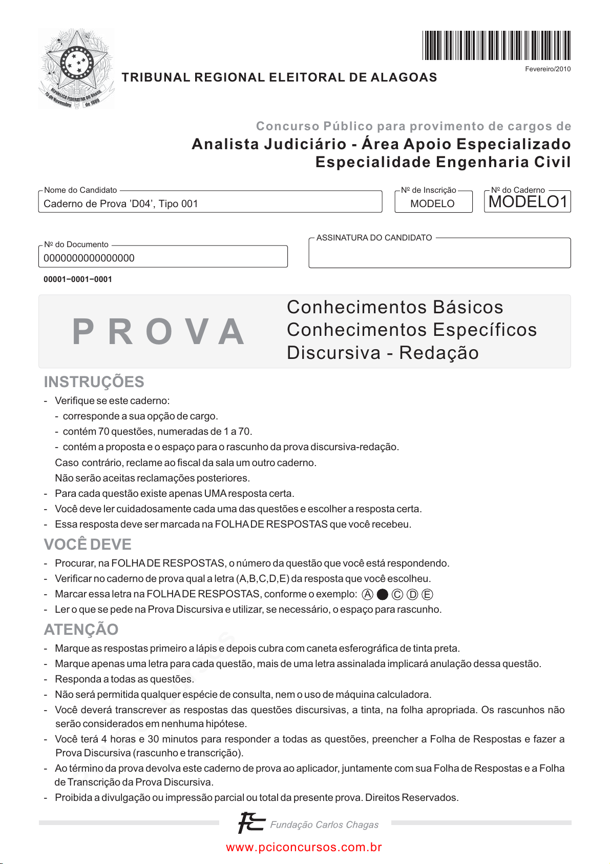 pcimarkpci MDAwMDowMDAwOjAwMDA6MDAwMDowMDAwOmZmZmY6ZDEwZTo0NjYz:V2VkLCAxOSBNYXIgMjAyNSAwMjo0NzozMyAtMDMwMA== www.pciconcursos.com.br N do CadernooN de Inscriçãoo ASSINATURA DO CANDIDATO N do Documentoo Nome do Candidato Conhecimentos Básicos Conhecimentos Específicos Discursiva - Redação P R O V A Fevereiro/2010 Analista Judiciário - Área Apoio Especializado Especialidade Engenharia Civil Concurso Público para provimento de cargos de TRIBUNAL REGIONAL ELEITORAL DE ALAGOAS INSTRUÇÕES VOCÊ DEVE ATENÇÃO - Verifique se este caderno: - corresponde a sua opção de cargo. - contém 70 questões, numeradas de 1 a 70. - contém a proposta e o espaço para o rascunho da prova discursiva-redação. Caso contrário, reclame ao fiscal da sala um outro caderno. Não serão aceitas reclamações posteriores. - Para cada questão existe apenas UMAresposta certa. - Você deve ler cuidadosamente cada uma das questões e escolher a resposta certa. - Essa resposta deve ser marcada na FOLHADE RESPOSTAS que você recebeu. - Procurar, na FOLHADE RESPOSTAS, o número da questão que você está respondendo. - Verificar no caderno de prova qual a letra (A,B,C,D,E) da resposta que você escolheu. - Marcar essa letra na FOLHADE RESPOSTAS, conforme o exemplo: - Ler o que se pede na Prova Discursiva e utilizar, se necessário, o espaço para rascunho. - Marque as respostas primeiro a lápis e depois cubra com caneta esferográfica de tinta preta. - Marque apenas uma letra para cada questão, mais de uma letra assinalada implicará anulação dessa questão. - Responda a todas as questões. - Não será permitida qualquer espécie de consulta, nem o uso de máquina calculadora. - Você deverá transcrever as respostas das questões discursivas, a tinta, na folha apropriada. Os rascunhos não serão considerados em nenhuma hipótese. - Você terá 4 horas e 30 minutos para responder a todas as questões, preencher a Folha de Respostas e fazer a Prova Discursiva (rascunho e transcrição). - Ao término da prova devolva este caderno de prova ao aplicador, juntamente com sua Folha de Respostas e a Folha de Transcrição da Prova Discursiva. - Proibida a divulgação ou impressão parcial ou total da presente prova. Direitos Reservados. A C D E Caderno de Prova ’D04’, Tipo 001 MODELO 0000000000000000 MODELO1 00001−0001−0001 www.pciconcursos.com.br pcimarkpci MDAwMDowMDAwOjAwMDA6MDAwMDowMDAwOmZmZmY6ZDEwZTo0NjYz:V2VkLCAxOSBNYXIgMjAyNSAwMjo0NzozMyAtMDMwMA== www.pciconcursos.com.br 2 TREAL-Conhecimentos Básicos1 CONHECIMENTOS BÁSICOS Português Atenção: As questões de números 1 a 10 referem-se ao texto seguinte. Sociedade do espetáculo: mal de uma época “Nosso tempo prefere a imagem à coisa, a cópia ao ori- ginal, a representação à realidade, a aparência ao ser. O cúmu- lo da ilusão é também o cúmulo do sagrado.” Essas palavras do filósofo Feurbach nos dizem algo fundamental sobre nossa épo- ca. Toda a vida das sociedades nas quais reinam as condições modernas de produção se anuncia como uma imensa acumula- ção de espetáculos. Tudo o que era diretamente vivido se esvai na fumaça da representação. As imagens fluem desligadas de cada aspecto da vida e fundem-se num curso comum, de forma que a unidade da vida não mais pode ser restabelecida. O espetáculo é ao mesmo tempo parte da sociedade, a própria sociedade e seu instrumento de unificação. Como parte da sociedade, o espetáculo concentra todo o olhar e toda a cons- ciência. Por ser algo separado, ele é o foco do olhar iludido e da falsa consciência. O espetáculo não é um conjunto de imagens, mas uma relação entre pessoas, mediatizadas por imagens. A alienação do espectador em proveito do objeto con- templado exprime-se assim: quanto mais contempla, menos vive; quanto mais aceita reconhecer-se nas imagens domi- nantes, menos ele compreende a sua própria existência e o seu próprio desejo. O conceito de espetáculo unifica e explica uma grande diversidade de fenômenos aparentes, apresenta-se como algo grandioso, positivo, indiscutível e inacessível. A exterioridade do espetáculo em relação ao homem que deveria agir como um sujeito real aparece no fato de que os seus próprios gestos já não são seus, mas de um outro que os apresenta a ele. Eis por que o espectador não se sente em casa em parte alguma, porque o espetáculo está em toda parte. Eis por que nossos valores mais profundos têm dificuldade de sobreviver em uma sociedade do espetáculo, porque a verdade e a transparência, que tornam a vida realmente humana, dela são banidas e os valores, enterrados sob o escombro das aparências e da mentira, que nos separam, em vez de nos unir. (Adaptado de Maria Clara Luccheti Bingemer, revista Adital) 1. De acordo com a citação do filósofo Feurbach, na abertura do texto, vive-se num tempo em que (A) o plano das coisas, uma vez sacralizado, faz desa- parecer o plano dos nossos valores espirituais. (B) a mera representação das coisas adquire uma rele- vância maior que a das coisas em si mesmas. (C) a valorização de processos ilusórios faz com que as pessoas se prendam cada vez mais aos ritos sagra- dos. (D) as imagens e as coisas mundanas captam nossa atenção de tal modo que já não as distinguimos umas das outras. (E) a verdade das imagens e a ilusão das representa- ções delas confundem nossa percepção e nossos sentidos. 2. Para a autora do texto, uma característica essencial da sociedade do espetáculo está no modo como o homem moderno (A) valoriza uma experiência direta das coisas e dos fenômenos, em detrimento de qualquer tipo de abstração. (B) revela-se um alienado, quando suprime a contem- plação dos objetos para analisar criticamente a imagem que eles têm. (C) subordina sua consciência a um processo de repre- sentações, que ele contempla e adota como um mundo unificado. (D) delega aos produtores de espetáculos a representa- ção de uma ilusão que ele teme rec