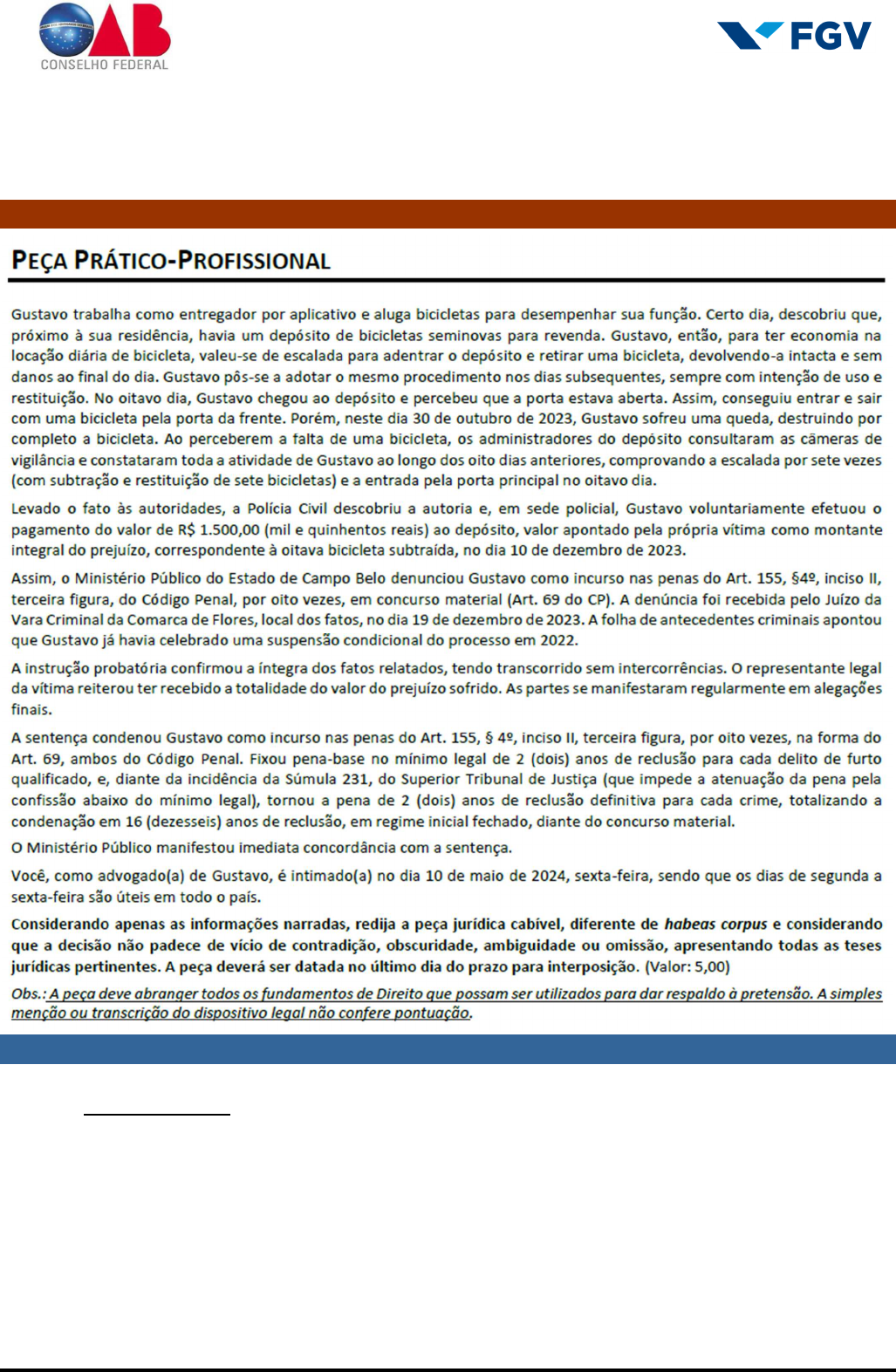 <p>ORDEM DOS ADVOGADOS DO BRASIL</p><p>40º Exame de Ordem Unificado</p><p>Prova Prático-Profissional Aplicada em 19/05/2024</p><p>ÁREA: DIREITO PENAL</p><p>Padrão de Resposta da Prova Prático-Profissional – 40º Exame de Ordem Unificado Página 1 de 6</p><p>PADRÃO DE RESPOSTA – PEÇA PROFISSIONAL</p><p>Enunciado</p><p>Gabarito Comentado</p><p>De acordo com o exposto, considerando que foi prolatada sentença condenatória em desfavor do réu, deve o examinando</p><p>apresentar recurso de apelação, com fundamento no Art. 593, inciso I, do CPP.</p><p>A petição de interposição do recurso de apelação deveria ser direcionada ao Juízo da Vara Criminal da comarca de Flores/CB,</p><p>enquanto as razões recursais deveriam ser apresentadas ao Tribunal de Justiça do Estado de Campo Belo.</p><p>No capítulo preliminar de tempestividade deve ser indicada a aplicação do prazo de cinco dias, na forma do Art. 593, caput, do</p><p>CPP.</p><p>Inicialmente, há de se notar a atipicidade dos sete primeiros fatos imputados a Gustavo. Em todos os casos de “furto” em que</p><p>houve a integral restituição da res furtiva, que meramente foi utilizada, sem danos, sem a intenção de Gustavo de se apossar</p><p>definitivamente do bem, e considerando a restituição à vítima antes mesmo que esta notasse, a conduta se amolda ao que a</p><p>doutrina e jurisprudência denominam “furto de uso”. Por isso, em relação aos sete primeiros fatos, deve ser postulada a</p><p>absolvição de Gustavo, na forma do Art. 386, inciso III, do CPP, pois o fato não é crime.</p><p>ORDEM DOS ADVOGADOS DO BRASIL</p><p>40º Exame de Ordem Unificado</p><p>Prova Prático-Profissional Aplicada em 19/05/2024</p><p>ÁREA: DIREITO PENAL</p><p>Padrão de Resposta da Prova Prático-Profissional – 40º Exame de Ordem Unificado Página 2 de 6</p><p>Contudo, no oitavo fato, houve, sim, a prática do furto consumado, pois, ao haver a destruição completa do bem, quando em</p><p>poder do acusado, consumou-se o delito de furto. Entretanto, como a porta do depósito estava aberta, e Gustavo não se valeu</p><p>da escalada para acessar o depósito, é certo que o furto verificado foi na modalidade simples (Art. 155, caput, do CP), e não na</p><p>qualificada, devendo ser afastada a qualificadora.</p><p>Vale notar que ocorreu arrependimento posterior, pois, uma vez danificado o bem, Gustavo quitou a íntegra do valor da coisa</p><p>danificada, antes do recebimento da denúncia, fazendo jus à causa de diminuição do Art. 16 do CP (arrependimento posterior).</p><p>Tendo em vista que os dados do enunciado já informam a fixação da pena-base no mínimo legal e o reconhecimento da</p><p>atenuante, bastaria formular o pedido de fixação do regime inicial aberto ou semiaberto, na forma do Art. 33, § 2º, alínea b ou</p><p>c, do CP, e de substituição por restritiva de direitos, na forma do Art. 44 do CP, diante da presença dos requisitos legais, pois a</p><p>pena ficará abaixo de 4 (quatro) anos e o crime foi praticado sem violência ou grave ameaça, sendo as circunstâncias judiciais</p><p>inteiramente positivas.</p><p>De forma subsidiária, deve ser defendida a aplicação da regra da continuidade delitiva, pois os fatos ocorreram nas mesmas</p><p>condições de tempo, lugar e maneira de execução, na forma do Art. 71 do CP.</p><p>Em razão de todo o exposto, deve o examinando formular, em conclusão, o pedido de conhecimento e provimento do recurso.</p><p>O prazo a ser indicado ao final era o dia 17 de maio de 2024, tendo em vista que a previsão do prazo de apelação é de cinco</p><p>dias. Como a intimação foi feita em uma sexta-feira, o prazo se iniciaria na segunda-feira seguinte, dia 13 de maio.</p><p>No fechamento, deve o examinando indicar local, data, advogado e OAB.</p><p>Distribuição dos Pontos</p><p>ITEM PONTUAÇÃO</p><p>Endereçamento</p><p>1. Interposição: Vara Criminal da comarca de Flores/CB (0,10). 0,00/0,10</p><p>2. Fundamento legal: Art. 593, inciso I, do CPP (0,10). 0,00/0,10</p><p>3. Tempestividade: 5 dias (0,10), na forma do Art. 593, caput, do CPP (0,10). 0,00/0,10/0,20</p><p>Razões</p><p>4. Endereçamento: Tribunal de Justiça do Campo Belo (0,10). 0,00/0,10</p><p>Mérito</p><p>5.1. Atipicidade das condutas de “furto de uso” (0,30), pois não houve ânimo de assenhoramento</p><p>definitivo da res furtiva ou porque foram os bens restituídos sem desgaste ou dano (0,20), devendo</p><p>se constatar que o fato não é crime (0,15).</p><p>0,00/0,15/0,20/0,30</p><p>0,35/0,45/0,50/0,65</p><p>5.2. Deve ser requerida a absolvição de Gustavo (0,30) em relação aos sete primeiros furtos (0,15),</p><p>na forma do Art. 386, inciso III, do CPP (0,10).</p><p>0,00/0,15/0,25/0,30</p><p>0,40/0,45/0,55</p><p>6. Pedido de desclassificação da conduta de furto qualificado para furto simples (0,40), pois, neste</p><p>dia, Gustavo adentrou o depósito pela porta da frente, não se valendo de escalada ou qualquer outra</p><p>qualificadora (0,20), na forma do Art. 155, caput, do CP (0,10).</p><p>0,00/0,20/0,30/0,40</p><p>0,50/0,60/0,70</p><p>7. Em acréscimo, deve ser postulada a aplicação da causa de diminuição de pena do arrependimento</p><p>posterior (0,40), pois o acusado restituiu integralmente o valor do dano antes do recebimento da</p><p>denúncia, presentes os demais requisitos (crime praticado sem violência ou grave ameaça) (0,20),</p><p>na forma do Art. 16 do CP (0,10).</p><p>0,00/0,20/0,30/0,40</p><p>0,50/0,60/0,70</p><p>8. Subsidiariamente, a aplicação da continuidade delitiva (0,30), pois os fatos ocorreram nas mesmas</p><p>condições de tempo, lugar e maneira de execução (0,25), na forma do Art. 71, caput, do CP (0,10).</p><p>0,00/0,25/0,30/0,35</p><p>0,40/0,55/0,65</p><p>9. Pedido de fixação de regime inicial aberto ou semiaberto (0,20), na forma do Art. 33, § 2º, alínea</p><p>b ou c, do CP (0,10).</p><p>0,00/0,20/0,30</p><p>10. Substituição da pena privativa d