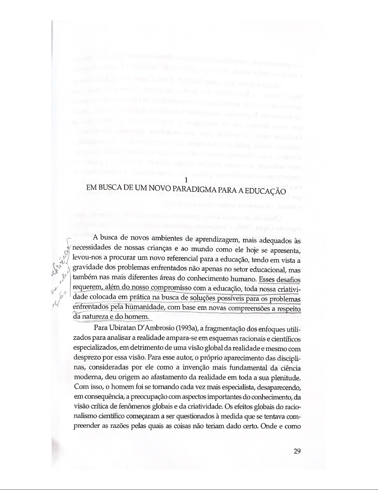 1 EM BUSCA DE UM NOVO PARADIGMA PARA A EDUCAÇÃO A busca de novos ambientes de aprendizagem, mais adequados às necessidades de nossas crianças e ao mundo como ele hoje se apresenta, levou-nos a procurar um novo referencial para a educação, tendo em vista a gravidade dos problemas enfrentados não apenas no setor educacional, mas também nas mais diferentes áreas do conhecimento humano. Esses desafios requerem, além do nosso compromisso com a educação, toda nossa criativi- dade colocada em prática na busca de soluções possíveis para os problemas enfrentados pela humanidade, com base em novas compreensões a respeito da natureza e do homem. Para Ubiratan D'Ambrosio (1993a), a fragmentação dos enfoques utili- zados para analisar a realidade ampara-se em esquemas racionais e científicos especializados, em detrimento de uma visão global da realidade e mesmo com desprezo por essa visão. Para esse autor, o próprio aparecimento das discipli- nas, consideradas por ele como a invenção mais fundamental da ciência moderna, deu origem ao afastamento da realidade em toda a sua plenitude. Com isso, o homem foi se tornando cada vez mais especialista, desaparecendo, em consequência, a preocupação com aspectos importantes do conhecimento, da visão crítica de fenômenos globais e da criatividade. Os efeitos globais do racio- nalismo científico começaram a ser questionados à medida que se tentava com- preender as razões pelas quais as coisas não teriam dado certo. Onde e como 29éticos morais? Para e modelo com princípios D'Ambrosio modelos de construção do comprometemos de outros fundamental adoção Naisbitt, Tofler, Capra, Morin, D'Ambrosio dade relacionados aos aspectos sociais, psíquicos, éticos e morais, vêm é autores, tais como Santos, apontam vivendo Vários Boaventura dos história da humanidade; num transformando o homem e a mulher em seres individualistas, egocêntricos, que (C e na um Weil, Harman muito importante sem noções de ética e solidariedade, desconhecedores do significado do amor transição de inúmeros desafios. E o mais grave e da compaixão. A atual abordagem, que analisa o mundo em partes inde- período de dimensão é da presença uma ou decorrente a outra, restringem nem se diferentes pendentes, já não funciona, assim como a associação do homem que domina do da esses desafios não mas envolvem dimensões que país, a natureza precisa ser repensada para gerar um novo tipo de pensamento que M localizam neste ou naquele morais e espirituais da políticas, intelectuais, compreenda o universo em contínua evolução, que respeite os fenômenos sociais, de nossa vida no planeta: saúde, culturais, naturais e reconheça a vida como um rio que flui naturalmente em direção à diferentes aspectos trabalho, tecnologia corrente infinita do Tao. afetam os mais relações sociais, e té meio ambiente, economia, provocando sérias ameaças à sobrevivência desafios vem da conjunto desses de manifestação da vida neste formas planeta, m às diferentes que é paradigma? raça humana e do diálogo crítico e criativo entre o restauração homem a o que mundo tem requerido da natureza, entre ciência e sociedade. Quais são as causas desses profundos está fato de Inúmeras, mas, Antes, é preciso esclarecer o conceito de paradigma que estamos utili- zando. Primeiramente, remetamo-nos a Kuhn, filósofo e historiador da ciên- fe problema no verdadeiro a maioria o dos intelectuais segundo Capra que (1988), integram o mundo acadêmico e suas instituições subscrever cia, introdutor de modificações importantes na maneira de compreender a A estreitas da realidade, inadequadas para resolver ciência. Para ele, paradigma significa "a constelação de crenças, valores e os principais técnicas partilhada pelos membros de uma comunidade científica" (1994, p. percepções de nosso tempo. Esse problema decorre de um pensamento redu- 225). Paradigma refere-se a modelo, padrões compartilhados que permitem a problemas fragmentado, simplificado, que, por sua vez, gera ações correspon- explicação de certos aspectos da realidade. mais do que uma teoria; implica cionista, não expressam a unidade e a diversidade existente no Capra uma estrutura que gera novas teorias. É algo que estaria no início das teorias. dentes, que o fato de nossos problemas serem sistêmicos, estarem intimamente Paradigma, na ótica de Kuhn, é uma realização científica de grande interligados afirma que e serem interdependentes requer metodologias mais abrangentes envergadura, com base teórica e metodológica convincente e sedutora, e que adequadas para sua solução. Os atuais problemas da humanidade não passa a ser aceita pela maioria dos cientistas integrantes de uma comunidade. e ser resolvidos com base nos enfoques fragmentados que caracterizam É uma construção que fim às controvérsias existentes na área a respeito de nossas podem instituições governamentais e acadêmicas, gerados por modelos cultu- determinados fundamentos. A partir do momento em que existe um consenso rais ou conceituais obsoletos e variáveis irrelevantes. por parte de um grupo de cientistas sobre determinadas ocorrências ou Se a realidade é complexa, ela requer um pensamento abrangente, fenômenos, começa uma sinergia unificadora ao redor da nova temática. multidimensional, capaz de compreender a complexidade do real e construir Já Edgar Morin procura conceituar paradigma indo além da proposta um conhecimento que leve em consideração essa mesma amplitude. originária estabelecida pela linguística e pela definição de Thomas Kuhn; ele Hoje, sabemos que a ciência como conhecimento sistemático do univer- justifica a existência de uma incerteza na definição kuhniana. Segundo Morin, físico exige uma nova visão de mundo, diferente e não fragmentada; uma um paradigma significa um tipo de relação muito forte, que pode ser de conjunção ou disjunção, que possui uma natureza lóg