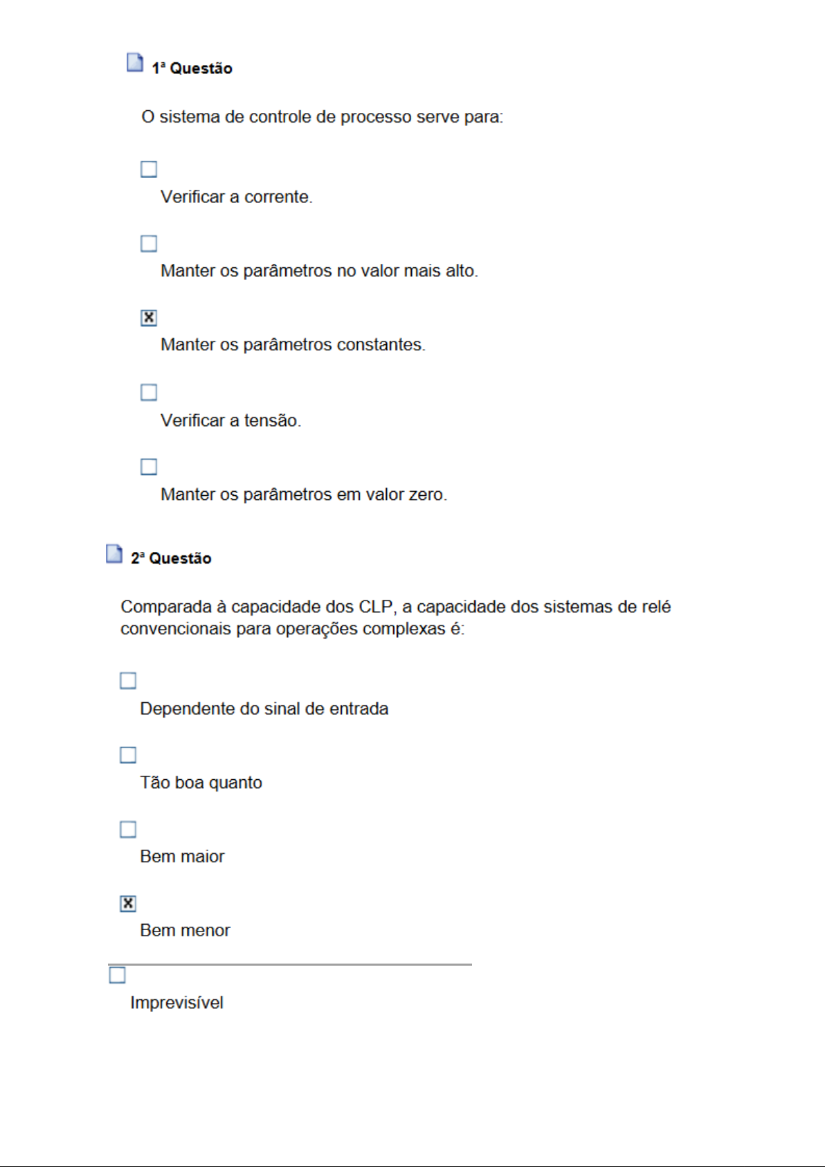Questão O sistema de controle de processo serve para: Verificar a corrente. Manter os parâmetros no valor mais alto. Manter os parâmetros constantes. Verificar a tensão. Manter os parâmetros em valor zero. Questão Comparada à capacidade dos CLP, a capacidade dos sistemas de relé convencionais para operações complexas é: Dependente do sinal de entrada Tão boa quanto Bem maior Bem menor ImprevisívelQuestão O circuito utilizado para acionamento de um motor trifásico utiliza uma chave de temperatura em seus enrolamentos. Assim, em caso de temperatura elevada, a chave desarma e um contator desliga o motor. Só é possível voltar a ligá-lo quando o motor resfria, ou seja, quando a chave volta a ligar. Assim, é possível concluir que esse é um sistema de controle em malha fechada e que a chave de temperatura faz o papel de: Operador Unidade de processamento Controlador Sensor Atuador Questão O tipo de memória em que os dados podem ser lidos e gravados eletricamente, além de ser possível sua regravação, desde que os dados anteriores sejam apagados anteriormente e que não é volátil, é conhecido como: RAM EEPROM PROM FLASH ROMQuestão Ao controlar a temperatura da água do chuveiro da sua residência, você coloca as mãos sob a água para perceber a temperatura da água. Dependendo da sua sensação, você abre mais ou fecha mais o registro do chuveiro. Sendo esse sistema montado com um sistema de controle em malha fechada, sua mão que abre e fecha o registro de água pode ser considerada o(a): Indicador Atuador CPU Controlador Sensor Questão Observando o circuito combinacional da figura abaixo, sua expressão booleana é dada por: Q0Questão A indústria 4.0 permitiu uma verdadeira revolução nos processos produtivos e meios industriais. Entre as características demandadas pela indústria 4.0 e pela lloT em relação aos controladores pode-se destacar: A não necessidade de troca de dados em tempos reais e de comunicação com outros controladores A não necessidade de programação para os controladores A exigência de que os controladores troquem informações entre si e com os servidores em nuvem A não necessidade do uso de sensores e pela ausência de comunicação entre controladores A ausência de atuadores e a falta de comunicação com os servidores nas nuvens Questão O desenvolvimento do meio industrial com a incorporação de controladores, sensores e atuadores modernos, acompanhado do uso intensivo da internet possibilitou grandes mudanças no meio industrial como a utilização dos(as): Motores ComputadoresQuestão Considerando os controladores modernos, que apresentam vasta integração entre hardware e software. A nível de hardware, a característica da arquitetura que permite que o processador lide com as tarefas de supervisão, gerenciamento, entradas e saídas em tempo real consiste na: A combinação de múltiplos núcleos de processamento O emprego de unidades aritméticas A utilização de memórias expansivas O emprego de unidades lógicas O uso de baterias recarregáveis