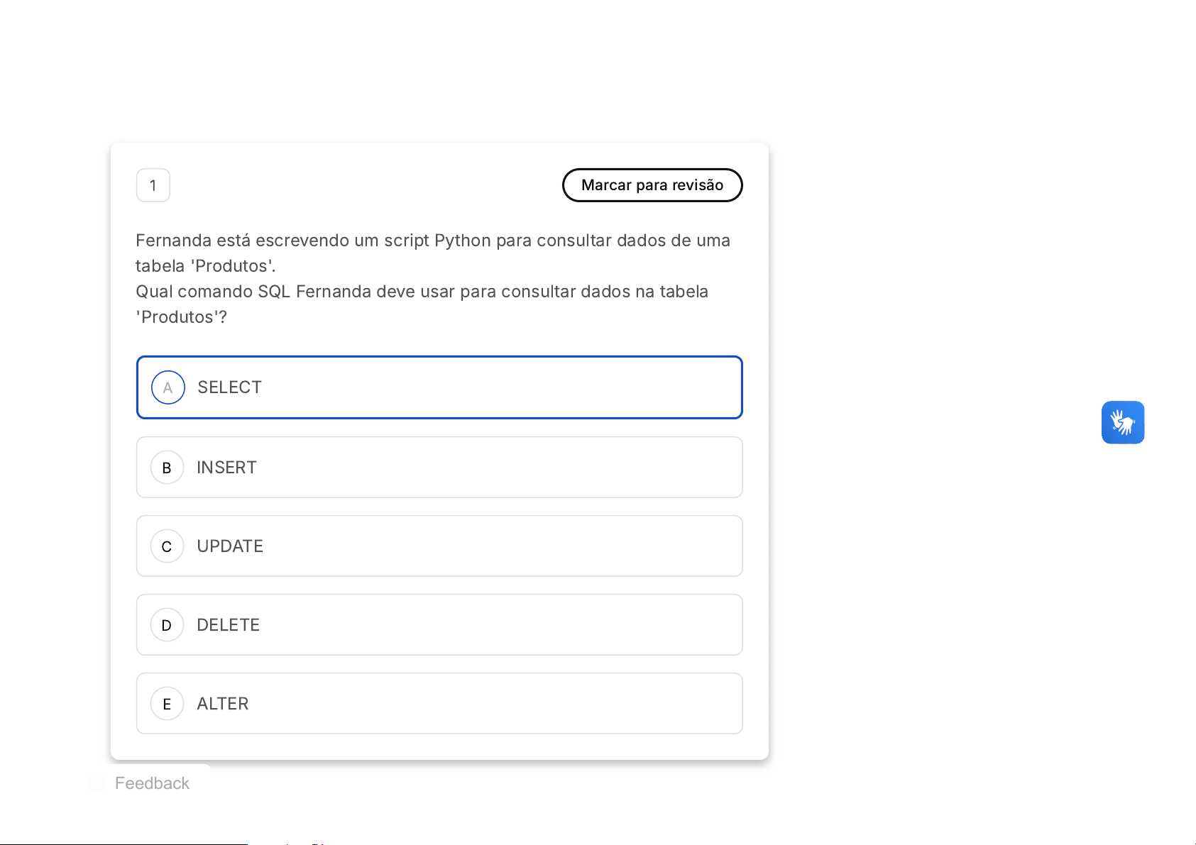 A B C D E 1 Marcar para revisão Fernanda está escrevendo um script Python para consultar dados de uma tabela 'Produtos'. Qual comando SQL Fernanda deve usar para consultar dados na tabela 'Produtos'? SELECT INSERT UPDATE DELETE ALTER Feedback A B C 2 Marcar para revisão Um desenvolvedor de software está criando um aplicativo para gerenciar reservas em um hotel. Ele precisa remover registros de reservas canceladas do banco de dados. O sistema é escrito em Python e interage com o banco de dados para realizar essa tarefa. Considerando o texto, analise as afirmativas abaixo: I. O comando SQL DELETE é utilizado para remover registros de um banco de dados. II. A remoção de registros não exige condições específicas para identificar quais registros devem ser removidos. III. É recomendável usar parâmetros dinâmicos ao construir o comando de remoção para evitar SQL Injection. Marque a opção correta. Apenas as afirmativas I e III estão corretas. Apenas as afirmativas II e III estão corretas. Apenas a afirmativa I está correta. D E A B Apenas a afirmativa III está correta. Apenas a afirmativa II está correta. 3 Marcar para revisão Joana, uma desenvolvedora júnior, foi designada para implementar um pequeno sistema de gerenciamento de biblioteca em Python. O sistema necessita gerenciar informações sobre livros e autores. Joana optou por usar SQLite para a base de dados e começou definindo as tabelas. Considerando o texto, analise as afirmativas abaixo: I. SQLite é uma escolha adequada para pequenos sistemas devido à sua leveza e facilidade de uso. II. No SQLite, é necessário criar um servidor de banco de dados separado. III. Para interagir com o SQLite em Python, é necessário usar bibliotecas de terceiros. Marque a opção correta. Somente I e III estão corretas. Somente II está correta. C D E A B C Somente I está correta. I, II e III estão incorretas. Somente II e III estão corretas. 4 Marcar para revisão Em um aplicativo de reservas de hotel, existe a necessidade de excluir registros antigos de reservas finalizadas da tabela Reservas para manter a base de dados atualizada. Qual é o comando SQL correto para remover registros da tabela Reservas? DELETE FROM Reservas WHERE condição SELECT * FROM Reservas WHERE condição UPDATE Reservas SET condição D E INSERT INTO Reservas(condição) CREATE TABLE Reservas(condição) 5 Marcar para revisão O Python adquiriu destaque na área de desenvolvimento, em parte, pela sua simplicidade, mas também por possuir diversos pacotes e frameworks que facilitam, por exemplo, a construção de aplicações de bancos de dados, ciência de dados e construção de interfaces. A quantidade de recursos associada ao Python auxilia o desenvolvedor a construir aplicações padronizadas, adaptadas às funções de negócio e preparadas para mudanças, de forma mais rápida e com menor custo. Tais características fazem do Python uma linguagem apropriada ao desenvolvimento rápido de projetos de software. Com base no texto apresentado, conclui-se que A B C D E A linguagem Python estabelece padrões de simplicidade que exigem dos pacotes e frameworks de terceiros adaptação estrutural. A linguagem Python permite criar rapidamente aplicações flexíveis que permitem o desenvolvedor re-projetar conforme a necessidade. A linguagem Python possui mecanismos embutidos para construção de interfaces ricas, padronizando assim os projetos de software. A linguagem Python possui uma grande quantidade de recursos, o que torna a adaptação às funções de negócio mais demorada. A linguagem Python se destaca pela quantidade de pacotes e frameworks, no entanto, a aplicação do RAD fica prejudicada devido à falta de padronização. 6 Marcar para revisão Durante as aulas de programação, o aluno Frederico se mostrou interessado em aprofundar seus conhecimentos em frameworks que A B C D E possibilitem o desenvolvimento de aplicações com interface gráfica para a interação com o usuário final. Conhecendo a versatilidade da linguagem Python, marque a alternativa que apresenta um framework comum que poderia ajudar Frederico. Rpki. Stdio.color. Tkinter. Scanf. ColorACM. 7 Marcar para revisão A linguagem de programação Python possui muitos pacotes disponíveis. Tem uma grande comunidade de colaboradores engajados na solução de A B C D E problemas e disseminação de conteúdo. Sobre a linguagem de programação Python: Não é ideal para projetos RAD, dado que é orientada a objetos. Por ter uma sintaxe muito simples, não é necessário que o desenvolvedor precise programar linhas de código. Aplica-se perfeitamente bem para a RAD, dado que é considerada a melhor linguagem de programação. É usada para construir a lógica do sistema, mas não a interface gráfica com o usuário. Licença e simplicidade de sintaxe fazem da linguagem Python uma forte candidata para desenvolvimentos de projetos RAD. 8 Marcar para revisão A biblioteca tkinter possui diversos componentes que devem ser usados em determinadas situações que auxiliem o usuário na realização de uma tarefa. Selecione a opção CORRETA que apresenta o componente A B C D E do tkinter mais adequado para tratar a situação em que uma mensagem deve ser exibida para o usuário logo depois que ele realizou uma tarefa e que ele precisa fazer algum tipo de confirmação: Dialog Checkbox Label Button Message 9 Marcar para revisão A Modelagem de Negócios é uma das fases da RAD. Nela, aspectos como necessidades do negócio e propósito do sistema são tratados. Nesse sentido, selecione a opção correta a respeito da Modelagem de Negócios: A B C D E Identifica as entidades de dados e como se relacionam com o negócio. É caracterizada por um processo rígido que vai determinar como será a versão final. É uma fase voltada para os desenvolvedores do sistema com interações técnicas. Identifica as informações relevantes sobre o negócio. Nela, os testes do sistema são trat