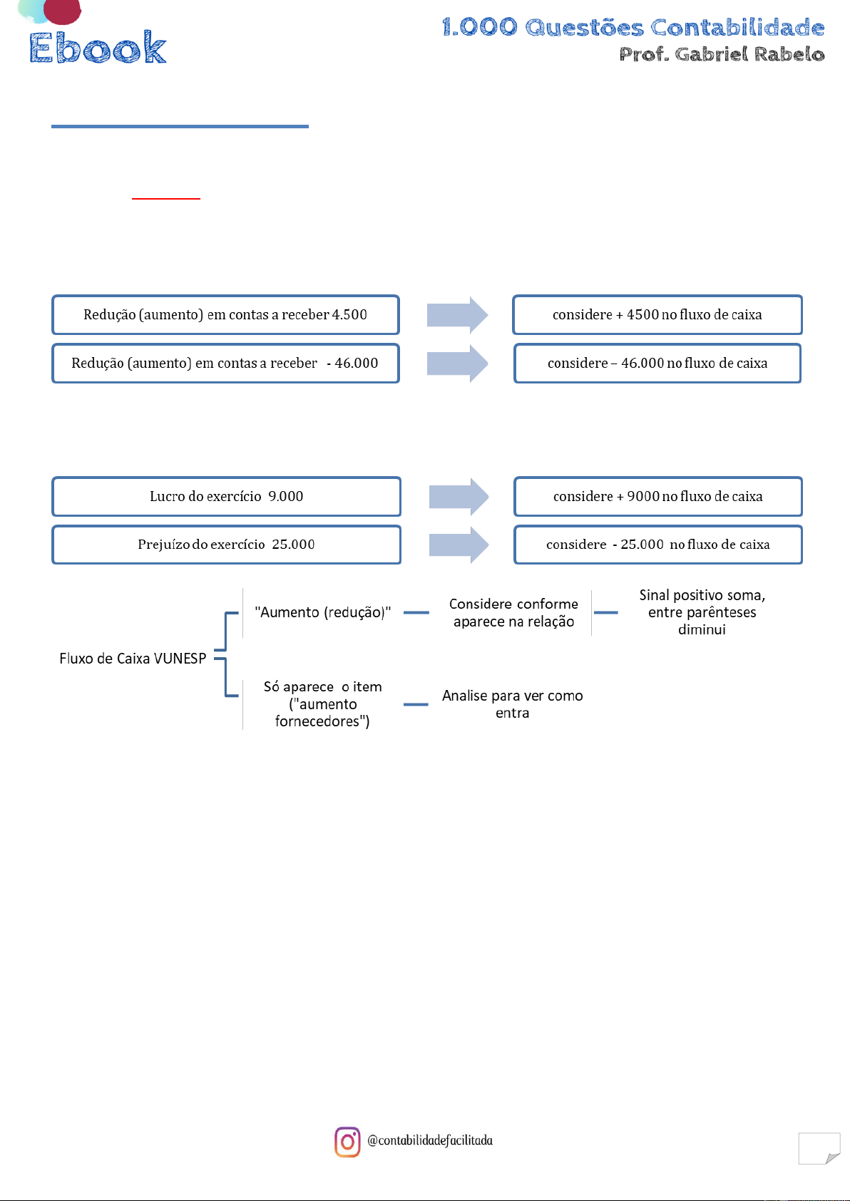 Ebook 1.000 Questões Contabilidade Prof. Gabriel Rabelo 383 Banca Vunesp Atenção: instruções para resolver as questões de fluxo de caixa da VUNESP. Quando aparece “Redução (aumento)”, considere o número na forma que aparecer (positivo aumenta o fluxo de caixa e negativo – entre parênteses – diminui). Exemplo: Quando não tem “Redução (aumento)” na descrição, analise o item para determinar se aumenta ou diminui o fluxo de caixa. Exemplo: 987. (VUNESP/Contador/Valiprev/2020) Uma entidade realizou aplicações financeiras com as seguintes características: (1) risco mínimo de mudanças no valor do investimento; (2) prazo de resgate de 40 dias a contar da data da aplicação e (3) liquidez imediata. Neste sentido, esses instrumentos financeiros devem ser classificados, conforme os padrões contábeis atualmente vigentes no Brasil, como: a) Caixa e Equivalentes de Caixa. b) Investimentos em intangíveis mensurados a valor justo para outros resultados abrangentes. c) Investimentos financeiros mensurados ao custo amortizado para resultado do exercício. d) Investimentos Financeiros mensurados a valor justo para outros resultados abrangentes. e) Investimentos Financeiros mensurados a valor justo para resultado do exercício.