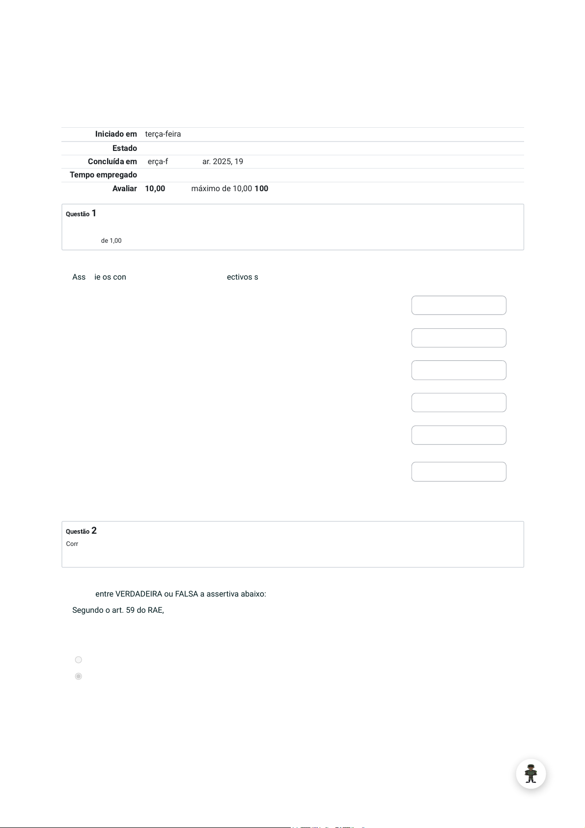 Iniciado em terça-feira, 18 mar. 2025, 19:00 Estado Finalizada Concluída em terça-feira, 18 mar. 2025, 19:10 Tempo empregado 10 minutos 10 segundos Avaliar 10,00 de um máximo de 10,00(100%) Questão 1 Correto Atingiu 1,00 de 1,00 Questão 2 Correto Atingiu 1,00 de 1,00 Associe os conceitos abaixo com seus respectivos significados: uma técnica quantitativa, que prima pelo tratamento de dados de uma série histórica de consumo, de forma a obter a previsão para períodos subsequentes. ✓ tipo de gestão de estoque que defende a minimização dos níveis estocados como forma de redução de desperdícios ✓ sempre que o estoque atingir uma determinada quantidade, um novo pedido de compra deve ser emitido ✓ intervalo de tempo entre a emissão do pedido e a chegada do material no Almoxarifado ✓ quantidade do item de material especificada no pedido de compras ✓ toda e qualquer porção armazenada de material, com valor econômico para a organização, que é reservada para emprego em momento futuro, quando se mostrar necessária às atividades organizacionais. ✓ Projeção Just in Time Nível Mínimo Tempo de reposição Lote de Compra Estoque Avalie entre VERDADEIRA ou FALSA a assertiva abaixo: Segundo o art. 59 do RAE, Todo e qualquer material destinado à OM poderá ser entregue nos almoxarifados ou depósitos, a critério do OD, acompanhados, conforme o caso, da nota fiscal, guia de remessa, de transferência, de recolhimento, de fornecimento ou documento equivalente. Verdadeiro Falso ✓ 18/03/2025, 17:04 Avaliação Somativa - UD II: Revisão da tentativa | EBAula https://avaebaula.eb.mil.br/mod/quiz/review.php?attempt=3695326&cmid=447230 1/4 Questão 3 Correto Atingiu 1,00 de 1,00 Questão 4 Correto Atingiu 1,00 de 1,00 Indique se as operações realizadas abaixo referem-se ao Recebimento Definitivo ou Provisório: a) No caso de obras e serviços, o recebimento pelo responsável por seu acompanhamento e fiscalização, de acordo com legislação específica, mediante termo circunstanciado, assinado pelas partes em até 15 (quinze) dias da comunicação escrita do contratado Recebimento Provisório ✓ b) Conferência realizada pelo Gestor de Contratos ou Fiscal Administrativo, liberando o processo para liquidação Recebimento Definitivo ✓ c) No caso de materiais e locação de equipamentos, o recebimento é realizado para efeito de posterior verificação da conformidade do material com a especificação Recebimento Provisório ✓ d) Conferência realizada pelo Fiscal de Contratos ou pelo Almoxarife, no caso de não existir Fiscal de Contatos designado Recebimento Provisório ✓ e) Conferência realizada por uma CREM, conforme preconizado pelo art. 58 do RAE Recebimento Definitivo ✓ Recebimento Definitivo Recebimento Provisório Para que ocorra a descarga do material permanente por despacho simples do Agente Diretor é necessário o preenchimento das seguintes hipóteses: I - for de tempo de duração indeterminado ou tiver atingido o tempo mínimo de duração previsto; II - material não possuir potencial para constituir acervo de museu ou obra de arte; III - for de valor líquido contábil igual ou inferior a 10% do limite estipulado para aquisições de materiais, por meio de dispensa de licitação, previsto na legislação que regula a realização de licitações e contratos na administração pública; IV - não for controlado; e V - material não tiver sida adquirido por licitação na modalidade concorrência, do tipo técnica e preço. Estão corretas as opções: Escolha uma opção: a. I, III e IV ✓ b. I, II e V c. III, IV e V d. I, III e V e. II, IV e V 18/03/2025, 17:04 Avaliação Somativa - UD II: Revisão da tentativa | EBAula https://avaebaula.eb.mil.br/mod/quiz/review.php?attempt=3695326&cmid=447230 2/4 Questão 5 Correto Atingiu 1,00 de 1,00 Questão 6 Correto Atingiu 1,00 de 1,00 Questão 7 Correto Atingiu 1,00 de 1,00 Avalie a assertiva abaixo entre VERDADEIRA ou FALSA: Nos casos de perda ou extravio de material, sempre haverá necessidade de abertura de sindicância, quando não estiver caracterizada a responsabilidade pelo ressarcimento do prejuízo Verdadeiro ✓ Falso Acerca da distribuição do material para as unidades consumidoras, é correto afirmar, EXCETO: Escolha uma opção: a. No caso de indisponibilidade do sistema corporativo de controle patrimonial em uso no Comando do Exército, a distribuição de material poderá ser realizada mediante pedido provisório, devendo tal ato ser registrado em até 8 (oito) dias úteis, após cessarem os motivos do impedimento de lançamento no sistema b. Em caso de ordem verbal, o responsável pelo recebimento do material emitirá, a critério do OD, o pedido, devendo a ordem de distribuição ser confirmada em boletim administrativo da OM. c. Os setores de material (almoxarifados) e depósitos da OM farão entregas dos suprimentos necessários às frações e dependências internas, mediante ordem de distribuição publicada em boletim administrativo da OM ou, em casos excepcionais, ordem verbal do comandante. d. No âmbito da OM, a distribuição de material para emprego e uso individual é feita pelas SU, sob a responsabilidade dos encarregados de material e a fiscalização dos seus respectivos comandantes. e. A ordem para distribuição deve recair sempre nos itens mais novos em estoque ✓ Avalie a assertiva abaixo entre VERDADEIRA ou FALSA: A saída do material de consumo será anotada nos respectivos fichários da Fiscalização Administrativa, depósitos, almoxarifados ou dependências equivalentes à medida em que o material for distribuído, dessa forma permanecerá o seu valor em carga até que ocorra o completo consumo do mesmo na dependência que o solicitou. Verdadeiro Falso ✓ 18/03/2025, 17:04 Avaliação Somativa - UD II: Revisão da tentativa | EBAula https://avaebaula.eb.mil.br/mod/quiz/review.php?attempt=3695326&cmid=447230 3/4 Questão 8 Correto Atingiu 1,00 de 1,00 Qu