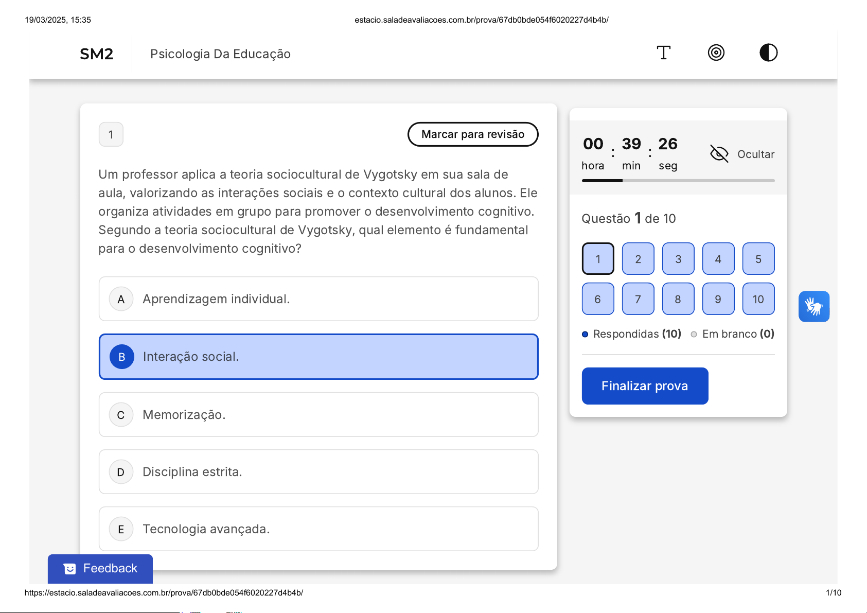 A B C D E 1 Marcar para revisão Um professor aplica a teoria sociocultural de Vygotsky em sua sala de aula, valorizando as interações sociais e o contexto cultural dos alunos. Ele organiza atividades em grupo para promover o desenvolvimento cognitivo. Segundo a teoria sociocultural de Vygotsky, qual elemento é fundamental para o desenvolvimento cognitivo? Aprendizagem individual. Interação social. Memorização. Disciplina estrita. Tecnologia avançada. 00 hora : 39 min : 26 seg Ocultar Questão 1 de 10 Respondidas (10) Em branco (0) Finalizar prova 1 2 3 4 5 6 7 8 9 10 SM2 Psicologia Da Educação Feedback 19/03/2025, 15:35 estacio.saladeavaliacoes.com.br/prova/67db0bde054f6020227d4b4b/ https://estacio.saladeavaliacoes.com.br/prova/67db0bde054f6020227d4b4b/ 1/10 A B C D E 2 Marcar para revisão Considerando o desenvolvimento cognitivo segundo Piaget, um educador observa diferentes estágios de raciocínio lógico em sua turma de alunos de diferentes idades. Ele nota que as capacidades de abstração variam significativamente. Qual estágio do desenvolvimento cognitivo de Piaget é caracterizado pela capacidade de abstração e pensamento hipotético-dedutivo? Sensório-motor. Pré-operatório. Operações concretas. Operações formais. Desenvolvimento moral. 19/03/2025, 15:35 estacio.saladeavaliacoes.com.br/prova/67db0bde054f6020227d4b4b/ https://estacio.saladeavaliacoes.com.br/prova/67db0bde054f6020227d4b4b/ 2/10 A B C D E 3 Marcar para revisão Em uma sala de aula, um professor aplica o conceito de "aprendizagem significativa" de Ausubel, focando em conectar novos conhecimentos com as estruturas cognitivas pré-existentes dos alunos. Ele utiliza exemplos do cotidiano para explicar conceitos complexos de matemática. Qual estratégia o professor está utilizando para promover a aprendizagem significativa? Utilização de analogias. Aplicação de punições. Ensino baseado em competências. Ensino tradicional expositivo. Uso de tecnologia educativa. 19/03/2025, 15:35 estacio.saladeavaliacoes.com.br/prova/67db0bde054f6020227d4b4b/ https://estacio.saladeavaliacoes.com.br/prova/67db0bde054f6020227d4b4b/ 3/10 A B C D E 4 Marcar para revisão Piaget descreve que as crianças, na fase pré-operatória, apresentam o que chamou de ''pensamento egocêntrico''. Assinale a alternativa que caracteriza tal pensamento. As crianças aderem a uma escala comum de referência, ou seja, apresentam definições idênticas às mesmas palavras. As crianças, durante uma conversa, conservam as definições tradicionais do grupo em que convivem. As crianças apresentam extrema dificuldade em se colocar no ponto de vista do outro, fato que as impede de estabelecer relações de reciprocidade. As crianças não elegem o ponto de vista próprio como absoluto. As crianças apresentam domínio do seu ''eu'', sendo autônomas no seu modo de pensar e agir. 19/03/2025, 15:35 estacio.saladeavaliacoes.com.br/prova/67db0bde054f6020227d4b4b/ https://estacio.saladeavaliacoes.com.br/prova/67db0bde054f6020227d4b4b/ 4/10 A B C D E 5 Marcar para revisão A memória do tipo "priming" (ou "pré-ativação") é adquirida e evocada por meio de "dicas". Também chamada de memória de representação perceptual. Podemos afirmar que o priming está relacionado a: Movimentos automáticos com pouco processamento consciente, mais inflexíveis e estáveis. Uma manipulação ativa para articular informações novas com antigas, praticando um armazenamento e processamento simultaneamente. Os diferentes órgãos dos sentidos, como a memória auditiva ou a visual. Uma influência inconsciente que a exposição prévia a um estímulo exerce sobre um estímulo subsequente. A flexibilidade mental, que é a capacidade de coordenar múltiplas atividades cognitivas de forma simultânea. 19/03/2025, 15:35 estacio.saladeavaliacoes.com.br/prova/67db0bde054f6020227d4b4b/ https://estacio.saladeavaliacoes.com.br/prova/67db0bde054f6020227d4b4b/ 5/10 A B C D E 6 Marcar para revisão O senso comum acredita que há apenas um tipo de memória. Entretanto, ela pode ser classificada em alguns subtipos, tais como: Memória de curto prazo, sensorial, de trabalho, episódicas, semânticas e procedurais. Memória de pareamento, assimilação, acomodação e esquemática. Memória de habilidades, comportamentos, informativa e de linguagem. Memória sensório-motor, pré-operatória, operatória concreta e formal. Memória filogenética, ontogenética e sociogenética. 7 Marcar para revisão 19/03/2025, 15:35 estacio.saladeavaliacoes.com.br/prova/67db0bde054f6020227d4b4b/ https://estacio.saladeavaliacoes.com.br/prova/67db0bde054f6020227d4b4b/ 6/10 A B C D E A TCC tem um foco inicialmente no presente. A partir da queixa, os esforços são voltados ao aqui-agora, mas é possível se direcionar a questões relacionadas ao passado, quando Um familiar do paciente recomenda investigar seus traumas. Quando há necessidade de entender a formação das crenças. Os quadros apresentam sintomas crônicos. O processo é com pacientes infanto-juvenis. As metas terapêuticas são alcançadas e a alta é prevista. 8 Marcar para revisão O sistema nervoso pode ser dividido segundo critérios embrionários, funcionais ou anatômicos. Com base na anatomia, a neurociência distingue o sistema nervoso central (SNC) do sistema nervoso periférico (SNP). 19/03/2025, 15:35 estacio.saladeavaliacoes.com.br/prova/67db0bde054f6020227d4b4b/ https://estacio.saladeavaliacoes.com.br/prova/67db0bde054f6020227d4b4b/ 7/10 A B C D E Marque a alternativa que especifica as composições de cada estrutura dessa. SNC: sensação e motricidade; SNP: processamento e integração. SNC: epitelial, adiposo, cartilaginoso; SNP: sanguíneo e muscular. SNC: gânglios e terminações nervosas; SNP: encéfalo. SNC: encéfalo e medula espinhal; SNP: nervos, gânglios e terminações nervosas. SNC: adrenalina, tiroxina, estrogênio; SNP: progesterona e glucacon. 9 Marcar para revisão Quando falamos de pesqu