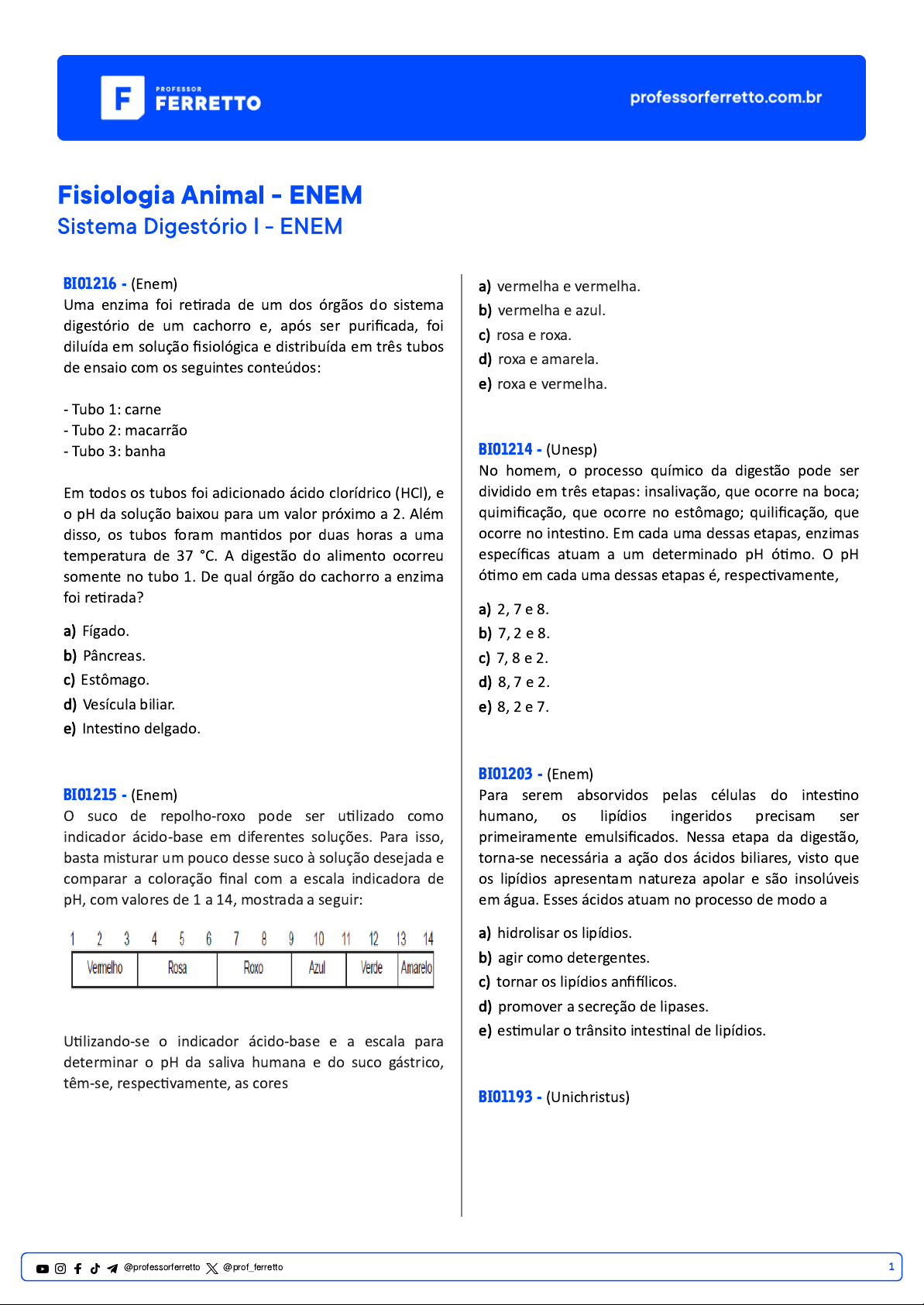 Fisiologia Animal - ENEM Sistema Digestório I - ENEM BIO1216 - (Enem) Uma enzima foi retirada de um dos órgãos do sistema digestório de um cachorro e, após ser purificada, foi diluída em solução fisiológica e distribuída em três tubos de ensaio com os seguintes conteúdos: - Tubo 1: carne - Tubo 2: macarrão - Tubo 3: banha Em todos os tubos foi adicionado ácido clorídrico (HCl), e o pH da solução baixou para um valor próximo a 2. Além disso, os tubos foram mantidos por duas horas a uma temperatura de 37 °C. A digestão do alimento ocorreu somente no tubo 1. De qual órgão do cachorro a enzima foi retirada? a) Fígado. b) Pâncreas. c) Estômago. d) Vesícula biliar. e) Intestino delgado. BIO1215 - (Enem) O suco de repolho-roxo pode ser utilizado como indicador ácido-base em diferentes soluções. Para isso, basta misturar um pouco desse suco à solução desejada e comparar a coloração final com a escala indicadora de pH, com valores de 1 a 14, mostrada a seguir: Utilizando-se o indicador ácido-base e a escala para determinar o pH da saliva humana e do suco gástrico, têm-se, respectivamente, as cores a) vermelha e vermelha. b) vermelha e azul. c) rosa e roxa. d) roxa e amarela. e) roxa e vermelha. BIO1214 - (Unesp) No homem, o processo químico da digestão pode ser dividido em três etapas: insalivação, que ocorre na boca; quimificação, que ocorre no estômago; quilificação, que ocorre no intestino. Em cada uma dessas etapas, enzimas específicas atuam a um determinado pH ótimo. O pH ótimo em cada uma dessas etapas é, respectivamente, a) 2, 7 e 8. b) 7, 2 e 8. c) 7, 8 e 2. d) 8, 7 e 2. e) 8, 2 e 7. BIO1203 - (Enem) Para serem absorvidos pelas células do intestino humano, os lipídios ingeridos precisam ser primeiramente emulsificados. Nessa etapa da digestão, torna-se necessária a ação dos ácidos biliares, visto que os lipídios apresentam natureza apolar e são insolúveis em água. Esses ácidos atuam no processo de modo a a) hidrolisar os lipídios. b) agir como detergentes. c) tornar os lipídios anfifílicos. d) promover a secreção de lipases. e) estimular o trânsito intestinal de lipídios. BIO1193 - (Unichristus) 1@professorferretto @prof_ferretto Os órgãos do sistema digestório humano, que realizam movimentos peristálticos, estão indicados nessa figura pelos números a) 1, 2 e 3. b) 3, 4 e 5. c) 4, 5 e 6. d) 2, 3 e 6. e) 1, 4 e 5. BIO1192 - (Unichristus) MASTIGAÇÃO Há uma recomendação na área da Saúde para que se triturem muito bem os alimentos antes de ingeri-los, ou seja, eles devem ser mastigados muitas vezes. Essa prática aumenta a rapidez da reação, facilitando a digestão. Disponível em: Ser protagonista – Química, 2a série; ensino médio / obra coletiva concebida, desenvolvida produzida por Edições SM; editor responsável Murilo Tissoni Antunes. A base científica para essa recomendação é o fato de a mastigação aumentar a) a concentração entre as substâncias que compõem os alimentos e os líquidos do corpo (saliva e suco gástrico). b) a catálise entre as substâncias que compõem os alimentos e os líquidos do corpo (saliva e suco gástrico). c) a temperatura entre as substâncias que compõem os alimentos e os líquidos do corpo (saliva e suco gástrico). d) a pressão entre as substâncias que compõem os alimentos e os líquidos do corpo (saliva e suco gástrico). e) a superfície de contato entre as substâncias que compõem os alimentos e os líquidos do corpo (saliva e suco gástrico). BIO1204 - (Enem) A vesícula biliar é um órgão muscular onde a bile é armazenada. Os cálculos biliares que algumas vezes se formam neste órgão devem ser removidos cirurgicamente, dependendo da avaliação da gravidade das complicações decorrentes da presença desses cálculos no indivíduo. Entretanto, apesar de algum prejuízo causado pela remoção da vesícula biliar, o indivíduo pode ter uma vida relativamente normal. A remoção cirúrgica desse órgão retardará a a) síntese de glicogênio. b) produção de bile. c) secreção de suco gástrico. d) produção de enzimas digestivas. e) digestão de gorduras. BIO1195 - (Fcm) Analise as proposições abaixo e assinale a alternativa correta em relação às glândulas salivares e suas ações: I. As glândulas salivares são estimuladas a secretar a saliva que é uma solução aquosa onde se encontra a enzima ptialina, sais minerais e muco. II. A ptialina digere o amido e outros polissacarídeos reduzindo-os a maltose. III. As glândulas salivares são estimuladas a secretar a saliva que é uma solução aquosa onde se encontra a enzima pepsina, sais minerais e muco. Estão corretas: 2@professorferretto @prof_ferretto a) apenas a III. b) I e III. c) I e II. d) I, II e III. e) II e III. BIO1196 - (Unichristus) No estômago, os movimentos peristálticos misturam o bolo alimentar ao suco gástrico, produzido pelas glândulas da mucosa gástrica. Esse suco contém ácido clorídrico e a) pepsina. b) tripsina. c) bile. d) quimotripsina. e) ptialina. BIO1211 - (Uel) Apesar dos contrastes econômico e sociocultural entre países pobres e ricos, as tendências observadas em estudos epidemiológicos sobre consumo alimentar assinalam que o padrão alimentar antes característico dos países desenvolvidos é atualmente uma preocupação também dos países em desenvolvimento. A adoção da dieta “afluente”, caracterizada por um excesso de alimentos de grande densidade energética, ricos em gordura e em açúcar refinado simples, e por uma diminuição no consumo de carboidratos complexos, tem se expandido, sobretudo em situações de prosperidade econômica. Adaptado: DIEZ GARCIA, R. W. Efeitos da globalização na cultura alimentar: considerações sobre mudanças na alimentação urbana. Revista de Nutrição, 2003, vol. 16, n. 4. Ao ingerir um lanche composto de pão e carne, a) a digestão química do pão inicia-se na boca, com a ação da tripsin