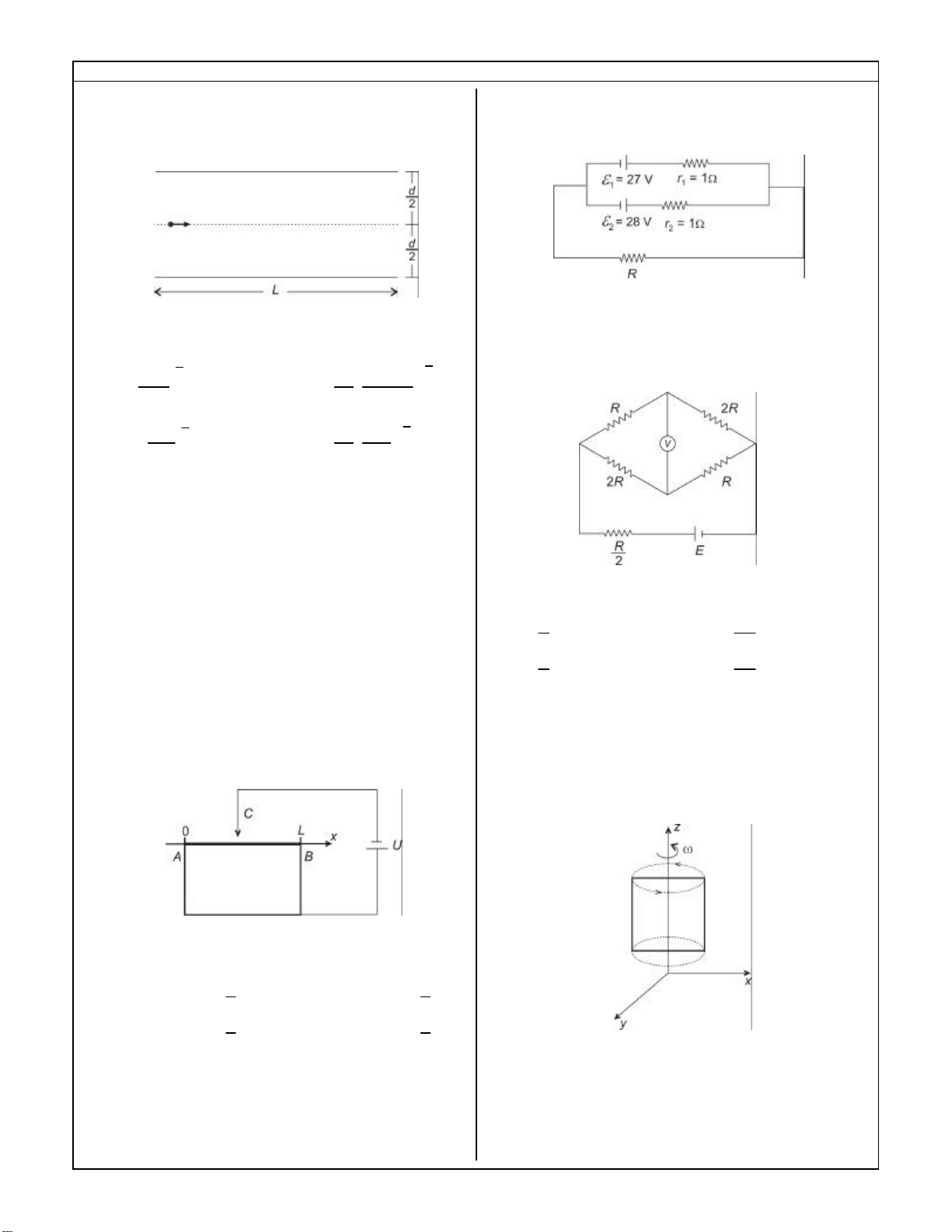 www.sassabetudo.cjb.net www.sassabetudo.cjb.net www.sassabetudo.cjb.net www.sassabetudo.cjb.net www.sassabetudo.cjb.net www.sassabetudo.cjb.net sassabetudo@bol.com.br 5 24 - Uma partícula de carga q e massa m penetra perpendicularmente às linhas de força de um campo elétrico uniforme E r com a menor velocidade suficiente para sair sem tocar as placas, como mostra a figura abaixo: A velocidade que ela deixa o campo elétrico é a) 2 1 2 2 md EqL c) 2 1 22 2 4 + d dL m Eq b) 2 1 2 m Eqd d) 2 1 2 + L dL m Eq 25 - Uma casca metálica esférica e não eletrizada envolve uma partícula eletrizada. Afirrma -se que I - a casca esférica não interfere no campo elétrico gerado pela partícula. II - em pontos exteriores à casca o campo elétrico é nulo. III - qualquer ponto interior à casca apresenta o mesmo potencial elétrico. Está(ão) correta(s) apenas a) I. c) III. b) II e III. d) I e II. 26 - Uma bateria fornece tensão constante U e está ligada a um fio homogêneo AB de seção transversal constante e comprimento L, conforme mostra o circuito esquematizado abaixo: Variando a posição do cursor C, a potência dissipada pelo fio AB será a) máxima em 4 L x = c) mínima em 2 L x = b) máxima em 2 Lx = d) mínima em 4 Lx = 27 - No circuito abaixo, para que a bateria de f.e.m. ε1 e resistência interna r 1 funcione como receptor, o valor da resistência R poderá ser igual a a) 15 c) 25 b) 20 d) 30 28 - Considere o circuito da figura abaixo: A leitura do voltímetro ideal V é a) 2 E c) 3 2 E b) 3 E d) 4 3 E 29 - A figura abaixo mostra uma espira condutora quadrada, de lado l = 0,1 m, que gira com velocidade angular ω constante em torno do eixo z num campo magnético uniforme de intensidade B = 1T, na direção do eixo x. A velocidade angular da espira para que seja induzida uma f.e.m. de, no máximo, 10 V é a) 100 rad/s c) 1000 rad/s b) 200 rad/s d) 2000 rad/s AFA 2006 FÍSICA – CFOAV/CFOINT/CFOINF – CÓDIGO 21