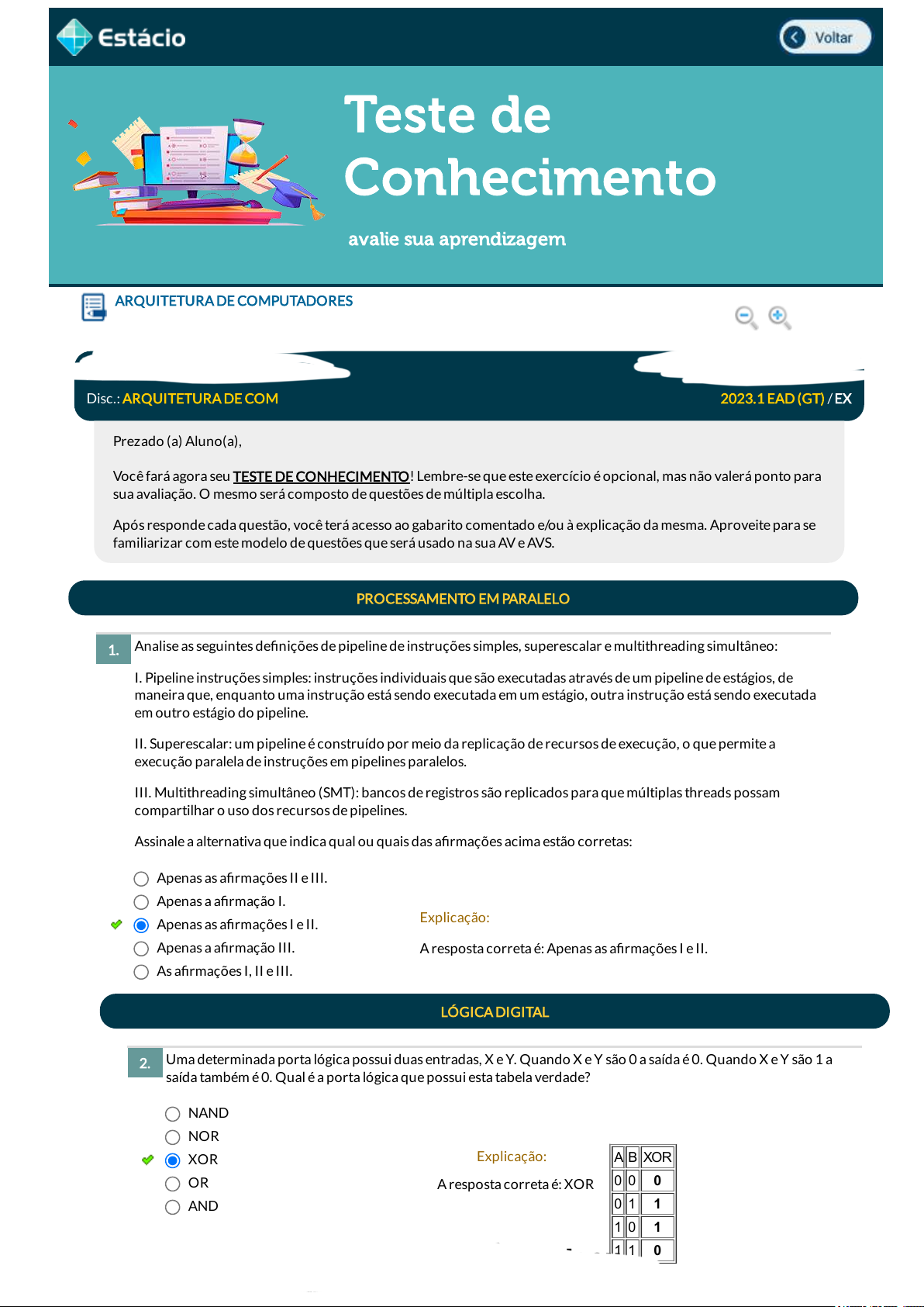 Analise as seguintes de�nições de pipeline de instruções simples, superescalar e multithreading simultâneo: I. Pipeline instruções simples: instruções individuais que são executadas através de um pipeline de estágios, de maneira que, enquanto uma instrução está sendo executada em um estágio, outra instrução está sendo executada em outro estágio do pipeline. II. Superescalar: um pipeline é construído por meio da replicação de recursos de execução, o que permite a execução paralela de instruções em pipelines paralelos. III. Multithreading simultâneo (SMT): bancos de registros são replicados para que múltiplas threads possam compartilhar o uso dos recursos de pipelines. Assinale a alternativa que indica qual ou quais das a�rmações acima estão corretas: ARQUITETURA DE COMPUTADORES Lupa DGT0281_20 _TEMAS Aluno: IS A L O ING ES E LI A Matr.: 3 4 19991 Disc.: ARQUITETURA DE COM 2023.1 EAD (GT) / EX Prezado (a) Aluno(a), Você fará agora seu TESTE DE CONHECIMENTO! Lembre-se que este exercício é opcional, mas não valerá ponto para sua avaliação. O mesmo será composto de questões de múltipla escolha. Após responde cada questão, você terá acesso ao gabarito comentado e/ou à explicação da mesma. Aproveite para se familiarizar com este modelo de questões que será usado na sua AV e AVS. PROCESSAMENTO EM PARALELO 1. Apenas as a�rmações II e III. Apenas a a�rmação I. Apenas as a�rmações I e II. Apenas a a�rmação III. As a�rmações I, II e III. Explicação: A resposta correta é: Apenas as a�rmações I e II. 1 0 1 1 1 0 Uma determinada porta lógica possui duas entradas, X e Y. Quando X e Y são 0 a saída é 0. Quando X e Y são 1 a saída também é 0. Qual é a porta lógica que possui esta tabela verdade? LÓGICA DIGITAL 2. NAND NOR XOR OR AND Explicação: A resposta correta é: XOR A B XOR 0 0 0 0 1 1 1 0 1 1 1 0 Baixado por Dayene Aguiar (dayenne.aguiar.cristina@gmail.com) lOMoARcPSD|30707823 Assinale a alternativa que apresenta corretamente a expressão para a representação do circuito a seguir: 3. Explicação: A resposta correta é: Perceba que temos uma negação (porta lógica NOT) logo após as entradas A e B. Posteriormente, temos a junção dessas portas através de uma porta lógica OR. Em 2019, os Sistemas Operacionais para dispositivos móveis (mobileOS) já respondiam por mais de 50% do market share dos Sistemas Operacionais. Qual das funcionalidades a seguir é responsabilidade do mobileOS de um celular? I. Mostrar noti�cações. II. Calcular rotas. III. Mostrar a carga restante da bateria. IV. Ler a tela touchscreen. V. Restringir o tráfego de Broadcast. BASE COMPUTACIONAL 4. I, II e IV, apenas. I e II, apenas. II e V, apenas. III, IV e V, apenas. I, III e IV, apenas. Explicação: A resposta correta é: I, III e IV, apenas. O cálculo de rotas é feito através de uma tabela de roteamento, característica comum aos roteadores. O uso de VLANS (Rede de Área Local Virtual) visa restringir o tráfego de Broadcast de uma rede. Baixado por Dayene Aguiar (dayenne.aguiar.cristina@gmail.com) lOMoARcPSD|30707823 A tecnologia de SSD veio para substituir os discos rígidos. Sem partes móveis, é menos propensa a falhas, além de ser mais rápida que seus antecessores. Os discos rígidos e os SSD não são fundamentais, de forma conceitual, para os computadores. Entretanto, são peças muito importantes, na prática, para os computadores pessoais. Isso se deve ao fato de: 5. O disco ser responsável por receber os dados do teclado e do mouse. O barramento entre o processador e a memória RAM ser muito lento. O processador não possuir armazenamento para os programas. A memória RAM ser volátil. A energia consumida pelo disco ser muito menor que a consumida pela memória RAM. Explicação: A memória RAM é uma memória do tipo volátil, ou seja, todos os dados são imediatamente apagados quando o sistema �ca sem energia. COMPONENTES DE HARDWARE Em um sistema operacional, o conjunto de rotinas que oferece serviços aos usuários, às suas aplicações e também ao próprio sistema é denominado especi�camente como: 6. Aplicativo de usuário. Binário. Setup. Núcleo. Microcódigo. Explicação: A resposta correta é: Núcleo. O Sistema Operacional é o único programa executado em modo Núcleo (kernel), possuindo acesso completo ao hardware e execução de qualquer instrução possível. Um processador possui resumidamente duas funções principais: Processamento e controle. Nesse contexto, em que área da UCP (processador) se realiza a movimentação de dados e de instruções de E/S para o processador? 7. Registrador de Endereço - REM. Registrador de Dados de Memória - RDM. Unidade de Controle - UC. Registrador de instrução - RI. Contador de Instrução - CI. Explicação: A resposta correta é: Unidade de Controle - UC. A unidade de controle é responsável pelo Ciclo de Busca, Decodi�cação e Execução de Instruções. O número 1F2 na base 16 é representado por qual número na base 2? REPRESENTAÇÃO DE DADOS 8. 100000001101 110000001110 111100100001 001111110001 000111110010 Explicação: A resposta correta é: 000111110010 Baixado por Dayene Aguiar (dayenne.aguiar.cristina@gmail.com) lOMoARcPSD|30707823 9. Suponha que, para efeitos de aprendizagem em arquitetura de computadores (ignorando vários detalhes de implementação), você decidiu criar uma representação de conjunto de instruções hipotético muito simples e limitado para operações aritméticas de inteiros positivos com dois operandos, de um processador de 4 bits, cuja palavra de dados é de 4 bits. É gasto 1 ciclo de instrução para cada palavra, e a quantidade de ciclos para execução de uma determinada instrução (operadores e operandos) é igual à quantidade de palavras dessa instrução. O conjunto de instruções está representado a seguir: Caso seja desejável realizar o cálculo de 6 + 3, qual será o formato d