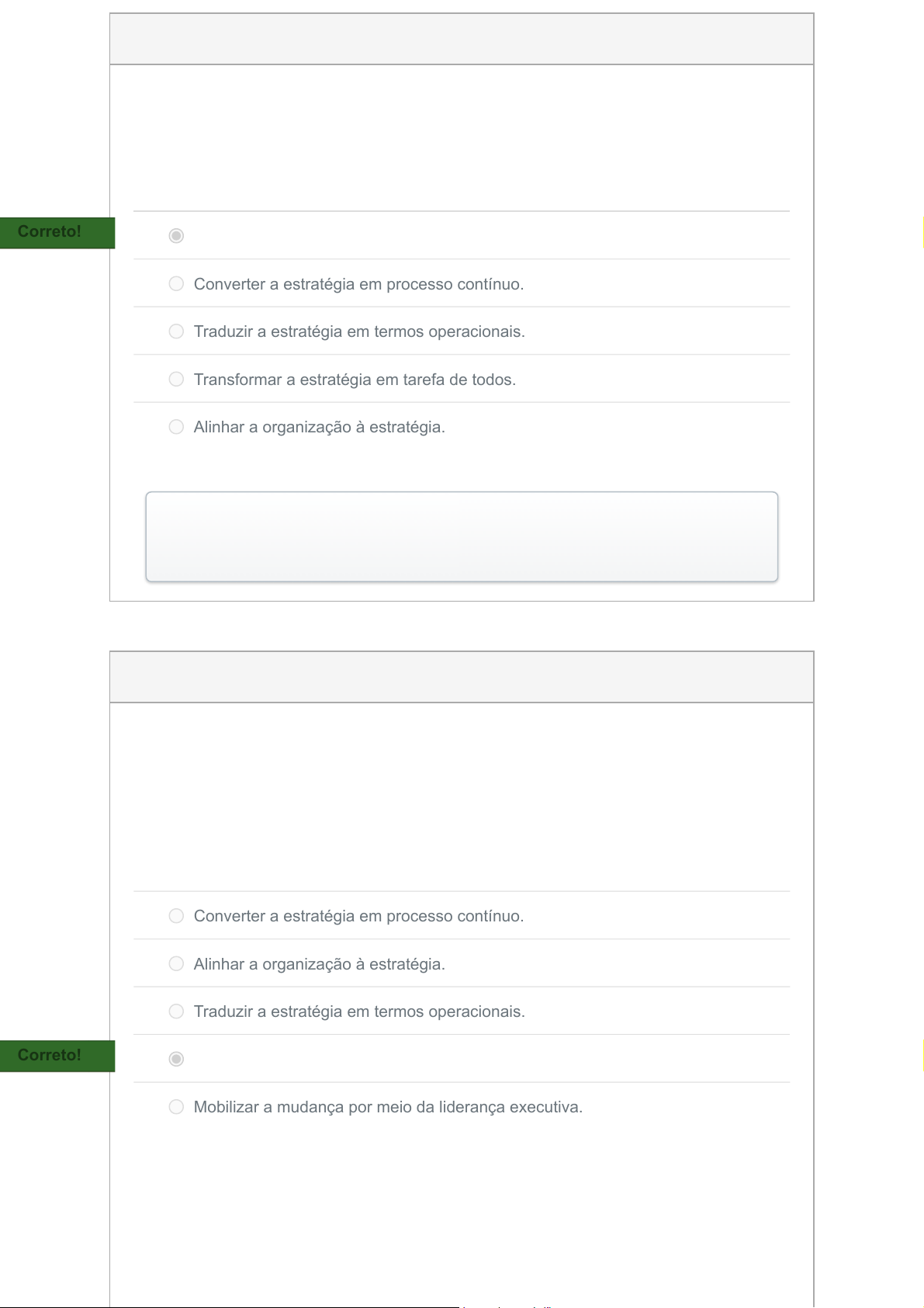 20 / 20 ptsPergunta 1 Quando nos referimos à importância de uma gestão de mudanças ser realizada de forma planejada, organizada e estrategicamente desenhada, estamos nos referindo a qual princípio da organização orientada para a estratégia? Mobilizar a mudança por meio da liderança executiva. Correto!Correto! Converter a estratégia em processo contínuo. Traduzir a estratégia em termos operacionais. Transformar a estratégia em tarefa de todos. Alinhar a organização à estratégia. A alternativa está correta, pois o princípio que trata da gestão de mudanças é o de mobilizar a mudança por meio da liderança executiva. 20 / 20 ptsPergunta 2 Para uma organização orientada para a estratégia, a comunicação é um pilar de suspensão relevante, um fator crítico de sucesso. A comunicação está relacionada a qual dos cinco princípios de uma organização orientada para a estratégia? Converter a estratégia em processo contínuo. Alinhar a organização à estratégia. Traduzir a estratégia em termos operacionais. Transformar a estratégia em tarefa de todos. Correto!Correto! Mobilizar a mudança por meio da liderança executiva. A alternativa está correta, pois, para uma organização orientada para a estratégia, a comunicação é um pilar de suspensão relevante, um fator crítico de sucesso. A comunicação está relacionada, principalmente, ao princípio de transformar a estratégia em tarefa de todos. Desse modo, todos saberão o seu papel na conquista dos objetivos desenhados na estratégia. 20 / 20 ptsPergunta 3 Gestão estratégica é a formulação e implementação de grandes objetivos e projetos, por meio da gestão de uma organização em nome de seus acionistas (ou proprietários). Normalmente, o processo de formulação começa com uma avaliação dos recursos disponíveis, uma análise do setor para avaliar o ambiente competitivo em que a empresa atua e uma avaliação interna das operações. A partir dessa avaliação geral, uma estratégia é criada para alcançar os objetivos desejados. A estratégia de Implementação do formulado busca orientar e alinhar a empresa aos seus principais objetivos. Nessa perspectiva, podemos afirmar que, abrangentemente, a gestão estratégica é um processo: Estático. De planejamento. De monitoramento. De execução e monitoramento. Contínuo. Correto!Correto! A alternativa está correta, pois a gestão estratégica é um processo contínuo que avalia os negócios e as indústrias, sendo que a organização está envolvida, bem como seus concorrentes. Ela corrige metas para atender a todos os concorrentes potenciais presentes e futuros e, em seguida, reavalia cada estratégia. 20 / 20 ptsPergunta 4 Quando uma empresa direciona pessoas, conhecimento, capital, recursos tecnológicos e materiais, visando ao alcance dos objetivos propostos pela estratégia, podemos concluir que: Trata-se de uma empresa orientada à estratégia. Correto!Correto! Diz respeito a empresas de baixo custo. Todas as empresas possuem essas características. Trata-se de uma empresa focada somente na gestão de pessoas. Trata-se de uma empresa com foco em recursos tecnológicos. A alternativa está correta, pois quando uma empresa direciona pessoas, conhecimento, capital, recursos tecnológicos e materiais visando ao alcance dos objetivos propostos pela estratégia, trata-se de uma empresa orientada para a estratégia. 20 / 20 ptsPergunta 5 A resistência à mudança é um desafio enfrentado por muitas empresas, uma vez que as pessoas têm dificuldades para mudar e, por isso, relutam para se manterem no mesmo local, desenvolvendo as mesmas atividades, dentro de sua zona de conforto. Trata-se de uma atitude que dificulta a implantação de novas estratégias de negócios. A respeito de gestão de mudanças, podemos afirmar que a mudança bem-sucedida é refletida: Por meio do comportamento de todos os stakeholders. Mediante o comportamento dos fornecedores. Mediante o comportamento dos clientes. Por meio do comportamento dos colaboradores. Correto!Correto! Mediante o comportamento da sociedade. A alternativa está correta, pois a mudança se torna bem-sucedida e completa quando passa a fazer parte da cultura organizacional, o que significa que os valores da organização devem ser aceitos e podem ser vistos por meio do comportamento dos seus membros. Diante disso, uma mudança organizacional de sucesso é aquela que resulta em transformações relevantes nos valores e comportamentos dos colaboradores da empresa.
