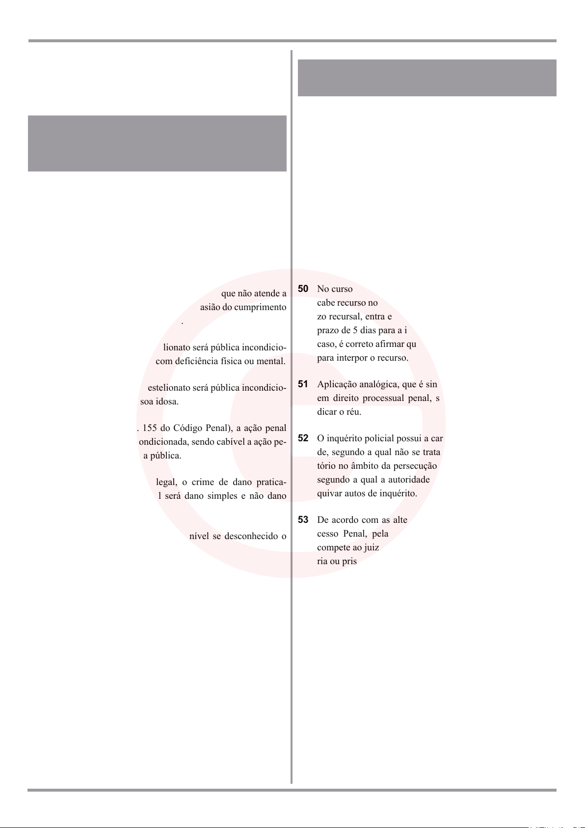 DEPEN – AGENTE FEDERAL DE EXECUÇÃO PENAL 38 A escolha do governador do Estado de delegados ou delega- das integrantes da carreira policial, independente do estágio de sua progressão funcional. DIREITO PENAL GERAL E ESPECIAL WALLACE FRANÇA Considerando o Código Penal, bem como entendimento doutriná- rio e jurisprudencial dominante, julgue os itens seguintes. 39 Conforme entendimento do STJ, não se aplica o arrependi- mento posterior para o agente que fez o ressarcimento da dí- vida principal antes do recebimento da denúncia, mas somen- te pagou depois os juros e a correção monetária. 40 Comete crime de desobediência o indivíduo que não atende a ordem dada pelo oficial de justiça na ocasião do cumprimento de mandado de entrega de veículo. 41 A ação penal no crime de estelionato será pública incondicio- nada se a vítima for pessoa com deficiência física ou mental. 42 A ação penal no crime de estelionato será pública incondicio- nada se a vítima for pessoa idosa. 43 No crime de furto (art. 155 do Código Penal), a ação penal será sempre pública incondicionada, sendo cabível a ação pe- nal privada subsidiária da pública. 44 Por ausência de previsão legal, o crime de dano pratica- do contra o Distrito Federal será dano simples e não dano qualificado. 45 O crime de receptação não será punível se desconhecido o autor do crime de que proveio a coisa. 46 Aplica-se à receptação culposa o mesmo regramento do furto privilegiado. 47 A receptação imprópria não admite tentativa. DIREITO PROCESSUAL PENAL ÉRICO PALAZZO 48 No que concerne à lei processual penal no espaço, apesar do Código de Processo Penal brasileiro adotar o princípio da territorialidade, existem algumas exceções nas quais referido diploma não será aplicado. 49 João Ferreira, maior imputável, é réu em ação penal em virtu- de da prática do crime de roubo. Durante a ação penal, surge uma nova lei processual que vem a lhe prejudicar conside- ravelmente. É correto afirmar que a referida lei processual não será aplicada à ação penal em curso contra João Ferreira, dado o princípio da irretroatividade da lei processual penal prejudicial ao réu. 50 No curso de uma ação penal, o juiz proferiu uma decisão que cabe recurso no prazo de 10 dias. Ocorre que no 2º dia do pra- zo recursal, entra em vigor a lei X, que passa a estabelecer o prazo de 5 dias para a interposição do referido recurso. Neste caso, é correto afirmar que a parte possui somente mais 3 dias para interpor o recurso. 51 Aplicação analógica, que é sinônimo de analogia, é admitida em direito processual penal, seja para beneficiar ou preju- dicar o réu. 52 O inquérito policial possui a característica da dispensabilida- de, segundo a qual não se trata de um procedimento obriga- tório no âmbito da persecução penal, e da indisponibilidade, segundo a qual a autoridade policial não poderá mandar ar- quivar autos de inquérito. 53 De acordo com as alterações produzidas no Código de Pro- cesso Penal, pela Lei n. 13.964/2019 (Pacote Anticrime), compete ao juiz das garantias decidir sobre a prisão temporá- ria ou prisão preventiva na fase pré-processual. 54 Excepcionalmente, a ação penal de iniciativa privada pode ser promovida mediante denúncia do Ministério Público. 55 O perdão do ofendido poderá ser aceito por procurador com poderes especiais.
