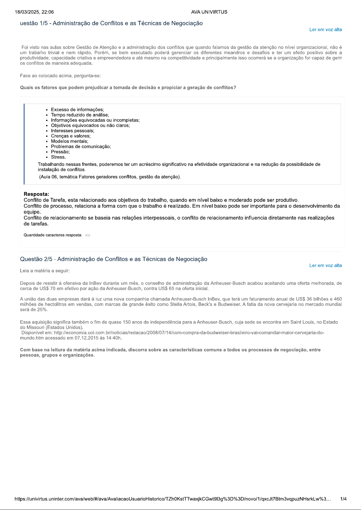 18/03/2025, 22:06 AVA UNIVIRTUS uestão 1/5 Administração de Conflitos e as Técnicas de Negociação Ler em alta Foi visto nas aulas sobre Gestão de Atenção e a administração dos conflitos que quando falamos da gestão da atenção no nível organizacional, não é um trabalho trivial e nem rápido. Porém, se bem executado poderá gerenciar os diferentes meandros e desafios e ter um efeito positivo sobre a produtividade, capacidade criativa e empreendedora e até mesmo na competitividade e principalmente isso ocorrerá se a organização for capaz de gerir os conflitos de maneira adequada. Face ao colocado acima, pergunta-se: Quais os fatores que podem prejudicar a tomada de decisão e propiciar a geração de conflitos? Excesso de informações; Tempo reduzido de análise; Informações equivocadas ou incompletas; Objetivos equivocados ou não claros; Interesses pessoais; Crenças e valores; Modelos mentais; Problemas de comunicação; Stress. Trabalhando nessas frentes, poderemos ter um acréscimo significativo na efetividade organizacional e na redução da possibilidade de instalação de conflitos. (Aula 06, temática Fatores geradores conflitos, gestão da atenção). Resposta: Conflito de Tarefa, esta relacionado aos objetivos do trabalho, quando em nível baixo e moderado pode ser produtivo. Conflito de processo, relaciona a forma com que o trabalho é realizado. Em nível baixo pode ser importante para o desenvolvimento da equipe. Conflito de relacionamento se nas relações interpessoais, o conflito de relacionamento influencia diretamente nas realizações de tarefas. Quantidade caracteres resposta: 402 Questão 2/5 - Administração de Conflitos e as Técnicas de Negociação Ler em alta Leia a matéria a seguir: Depois de resistir à ofensiva da InBev durante um mês, o conselho de administração da Anheuser-Busch acabou aceitando uma oferta melhorada, de cerca de US$ 70 em efetivo por ação da Anheuser-Busch, contra US$ 65 na oferta inicial. A união das duas empresas dará à luz uma nova companhia chamada Anheuser-Busch InBev, que terá um faturamento anual de US$ 36 bilhões e 460 milhões de hectolitros em vendas, com marcas de grande êxito como Stella Artois, Beck's e Budweiser. A fatia da nova cervejaria no mercado mundial será de Essa aquisição significa também o fim de quase 150 anos de independência para a Anheuser-Busch, cuja sede se encontra em Saint Louis, no Estado do Missouri (Estados Unidos). Disponível mundo.htm acessado em 07.12.2015 às 14:40h. Com base na leitura da matéria acima indicada, discorra sobre as características comuns a todos os processos de negociação, entre pessoas, grupos e organizações. 1/418/03/2025, 22:06 AVA UNIVIRTUS aluno deverá explanar o caráter multifatorial que envolvem as negociações, além das características comuns a todas elas, conforme segue abaixo: Há sempre duas partes ou mais representadas por dois indivíduos, grupos ou organizações. Existe um conflito de interesses entre as partes presentes. As ideias iniciais do planejamento da negociação nem sempre coincidem com as estabelecidas ao final do processo, que tento pode ser longo e desgastante quanto rápido Essa diversidade pode fazer com que os negociadores "se percam". Inicialmente as partes não preferem travar uma luta aberta, mas, sim, buscar um acordo. Se algo imprevisto ocorre, no entanto, a ideia pode ser cancelada e um conflito se estabelecer de forma temporária ou permanente. Sempre haverá aspectos tangíveis e intangíveis no processo das negociações, sendo os primeiros caracterizados como preço, prazo, rentabilidade e ponto de venda, entre outros, e os intangíveis associados às motivações psicológicas que influenciam as durante a negociação. Em geral estão relacionadas com crenças, valores aparência, inseguranças ou medos [...] (Aula 01). Resposta: Sempre haverá duas partes ou mais que são representadas por indivíduos, grupos ou organizações. Existe conflito de interesse entre as partes envolvidas. Sempre haverá aspectos tangíveis e intangíveis nos processos das negociações, entendendo-se que os primeiros que são caracterizados são preços, prazos e rentabilidade. Quantidade caracteres resposta: 320 Questão 3/5 Administração de Conflitos e as Técnicas de Negociação Ler em alta Christopher Moore especialista em Mediação de Conflitos nos diz que não existe uma classificação global para o conflito. Entretanto existem várias formas dele se apresentar, e essas podem ser classificadas quanto ao sujeito, quanto ao objeto quanto ao interesse, quanto à natureza, quanto aos efeitos ou resultados. Na classificação quanto ao sujeito temos 3 formas do conflito se apresentar, quanto ao objeto são 11 classificações estabelecidas. Nomeie e discorra sobre as três formas que se apresentam os conflitos no sujeito e também nomeie e discorra sobre três conflitos que estejam relacionados ao objeto aluno deverá discorrer sobre os três tipos de conflitos específicos do sujeito e deverá caracterizá-los conforme o estudo realizado: Conflito São os choques internos do indivíduo com seus conceitos, normas, princípios, etc. Com sua realidade. Sua abrangência se restringe à esfera pessoal. Conflito Interpessoal. São situações que surgem entre indivíduos ou entre grupos de indivíduos onde existem posições antagônicas com relação a um bem, um direito, ou um benefício. Conflito intragrupal. Ocorre dentro de uma facção social, política ou do trabalho. Esses conflitos têm como causa principal disposições divergentes, ideológicas ou metodológicas. aluno deverá escolher 3 (três) entre os 11 conflitos classificados quanto ao objeto, nomeando-os e os caracterizando. Conflito Internacional. Ocorre quando as disposições divergentes incluem questões de política internacional ou direito público internacional. As pessoas envolvidas são pessoas jurídicas de direito público externo. Con