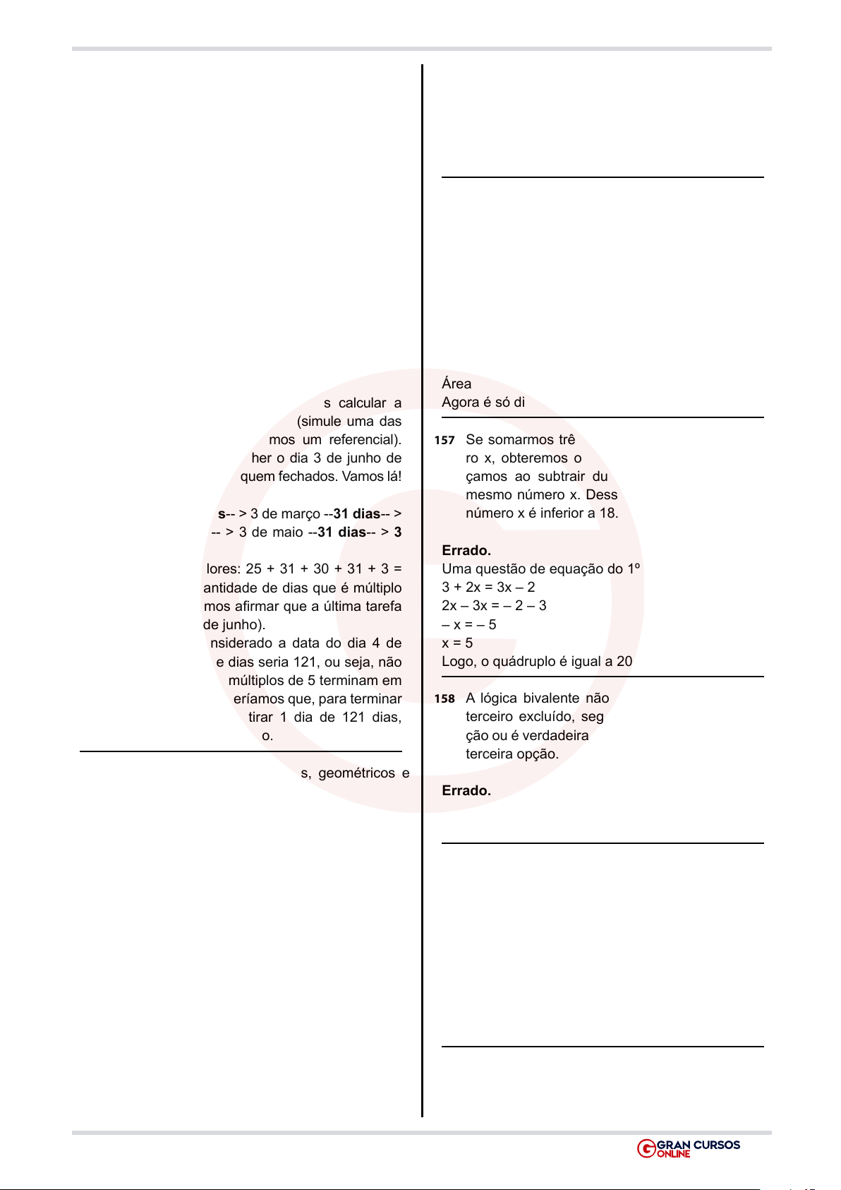 75Cargo: Agente e Escrivão QUESTÕES INÉDITAS PARA A PCDF – 2019 de determinado estado. Considere que a realiza- ção dessa tarefa tenha que ocorrer no dia 3 de fe- vereiro de 2019. Sabendo que o mês de fevereiro de 2019 tem 28 dias, que os meses de março e maio de 2019 têm 31 dias, cada um, e que o mês de abril de 2019 tem 30 dias, o primeiro dia do mês de junho de 2019 em que essa tarefa tam- bém deverá ser realizada será o dia 6. Errado. Nesta questão, temos a aplicação de múltiplos, especificamente múltiplos de 5 (números que terminam em zero ou cinco). A partir de 3 de fevereiro de 2019, de cinco em cinco dias, é realizada uma tarefa, que ocorrerá do mês de fevereiro até junho de 2019. A pergunta da questão é qual o primeiro dia do mês de junho em que a tarefa será realizada. Vamos fazer o seguinte: A partir do dia 3 de fevereiro, iremos calcular a quantidade de dias até a data de (simule uma das respostas só para que tenhamos um referencial). Como referencial, irei escolher o dia 3 de junho de 2019 para que os meses fiquem fechados. Vamos lá! 3 de fevereiro --25 dias-- > 3 de março --31 dias-- > 3 de ABRIL --30dias-- > 3 de maio --31 dias-- > 3 dias de junho. Vamos somar os valores: 25 + 31 + 30 + 31 + 3 = 120 (temos uma quantidade de dias que é múltiplo de cinco, logo podemos afirmar que a última tarefa aconteceu no dia 3 de junho). Caso tivéssemos considerado a data do dia 4 de junho, a quantidade de dias seria 121, ou seja, não é múltiplo de 5, pois os múltiplos de 5 terminam em zero ou cinco. Assim saberíamos que, para terminar em zero, teríamos que retirar 1 dia de 121 dias, voltando para o dia 3 de junho. Em relação a problemas aritméticos, geométricos e matriciais, julgue os próximos itens. 155 Um número é composto por 3 algarismos, sendo que o algarismo da centena é o 7 e o da unidade é o 4. A soma dos possíveis algarismos da deze- na desse número de modo que ele seja divisível por 3 é superior a 13. Errado. Os possíveis números que podemos formar com a centena, sendo 7 e a unidade sendo 4, de tal maneira que eles sejam divisíveis por 3 (soma dos algarismos divisíveis por 3): 7 + 0 + 4 = 11 7 + 1 + 4 = 12 7 + 2 + 4 = 13 7 + 3 + 4 = 14 7 + 4 + 4 = 15 7 + 5 + 4 = 16 7 + 6 + 4 = 17 7 + 7 + 4 = 18 7 + 8 + 4 = 19 7 + 9 + 4 = 20 Logo: 1 + 4 + 7 = 12 156 Um azulejista deve cobrir uma parede de forma re- tangular de dimensões 3 m por 4,5 m. Ele dispõe de azulejos de forma quadrada com lado medindo 15 cm. Nessas circunstâncias, o número mínimo de peças de azulejo que o azulejista vai precisar para cobrir totalmente a parede é igual a 600. Certo. Para calcularmos a área total a ser revestida, temos que multiplicar 3 x 4,5 = 13,5 m². Área de cada azulejo: 0,15 x 0,15 = 0,0225 m2 Agora é só dividir 13,5 por 0,0225 = 600 azulejos. 157 Se somarmos três unidades ao dobro do núme- ro x, obteremos o mesmo resultado que alcan- çamos ao subtrair duas unidades do triplo do mesmo número x. Dessa forma, o quádruplo do número x é inferior a 18. Errado. Uma questão de equação do 1º grau: 3 + 2x = 3x – 2 2x – 3x = – 2 – 3 – x = – 5 x = 5 Logo, o quádruplo é igual a 20. 158 A lógica bivalente não obedece ao princípio do terceiro excluído, segundo o qual toda proposi- ção ou é verdadeira ou é falsa, não havendo uma terceira opção. Errado. A lógica bivalente OBEDECE ao princípio do terceiro excluído. Julgue o item que segue, a respeito de lógica propo- sicional. 159 A sentença “É justo aprender, durante toda a vida, a língua portuguesa?” é uma proposição ló- gica composta. Errado. A sentença não é uma proposição, pois trata-se de uma expressão interrogativa. 160 As proposições P e Q a seguir referem-se ao de- poimento sobre determinado ilícito penal: