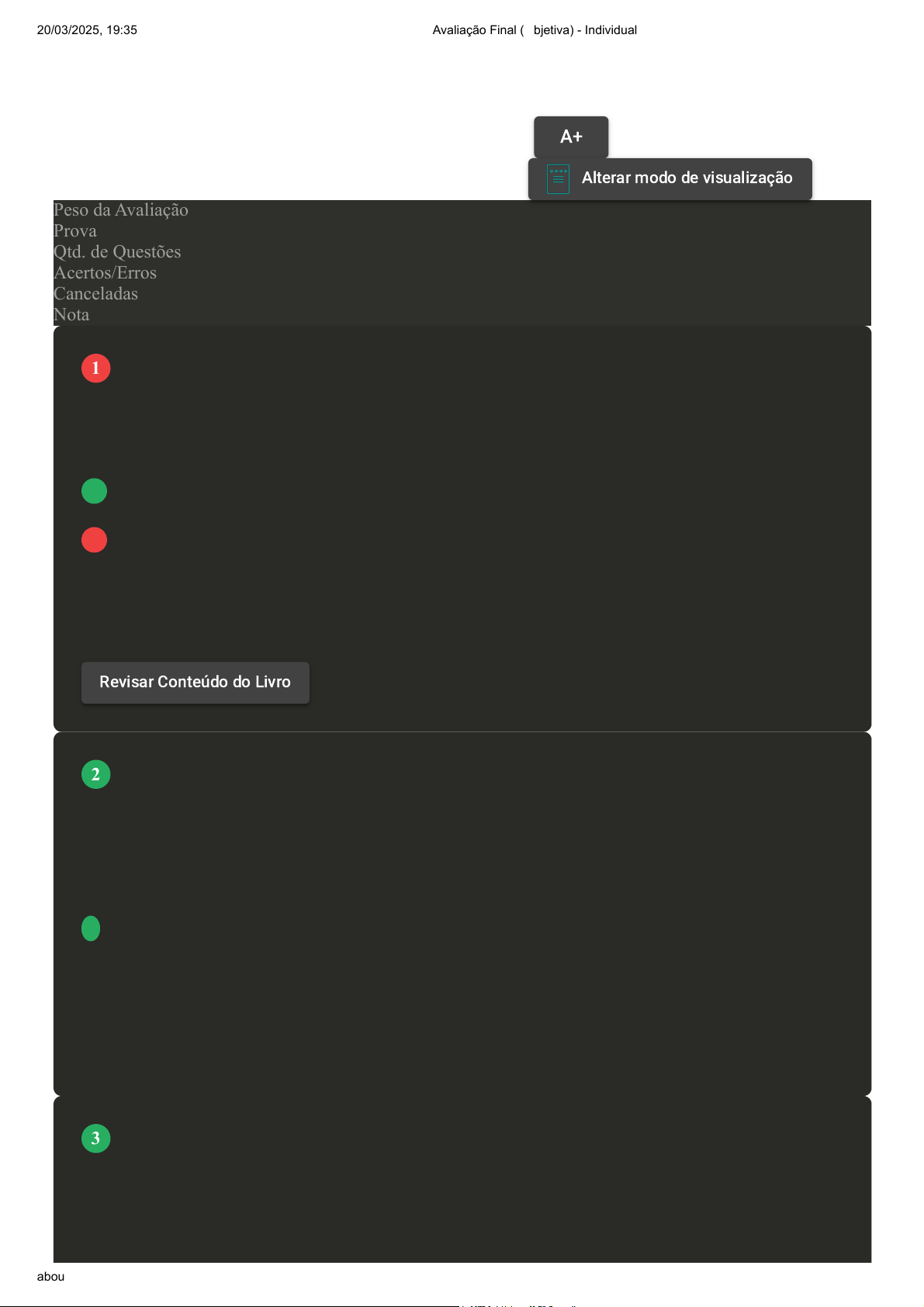 Prova Impressa GABARITO | Avaliação Final (Objetiva) - Individual (Cod.:954172) Peso da Avaliação 4,00 Prova 79635241 Qtd. de Questões 12 Acertos/Erros 8/3 Canceladas 1 Nota 9,00 A União Soviética surpreendeu o mundo com o lançamento do satélite Sputnick, em 1957. Esse fato revolucionou o mundo. Diante disso, o governo norte-americano se sentiu pressionado a buscar melhoriais na qualidade do ensino de Ciências, o que contribuiu para reformulação do currículo. Assinale a alternativa CORRETA que apresenta o primeiro projeto curricular elaborado: A Physical Science Curriculum Study. B School Mathematics Study Group. C Introductory Physical Study. D Biological Science Curriculum Study. O ensino de Ciências nos anos iniciais deve ser entendido como uma construção humana e cultural, que será ensinada aos mais jovens para a compreensão dos fatos. De acordo com essa perspectiva, a prática pedagógica adotada pelo professor deve abranger qual aspecto? A Enfatizar a transmissão dos conhecimentos, reforçando a memorização dos fatos. B Discutir os conhecimentos trazidos pelas ciências, pois eles estão presentes na vida diária, implicando em mudanças na sociedade. C Valorizar os conhecimentos trazidos pela tecnológica, sendo mais confiável que os conhecimentos das Ciências Naturais. D Reforçar que os fenômenos naturais são reações que ocorrem no ambiente, sem nenhuma relação com as ações humanas. Podemos destacar diversas características sobre o ensino de ciências e a saúde. Sobre o exposto, assinale a alternativa CORRETA: A Atualmente, a OMS é indiferente aos problemas de saneamento, pois existem outros problemas de ordem mais importante. VOLTAR A+ Alterar modo de visualização 1 Revisar Conteúdo do Livro 2 3 20/03/2025, 19:35 Avaliação Final (Objetiva) - Individual about:blank 1/5 B A saúde sempre será vista como a base de uma sociedade próspera. Para tal, é necessário observar que ser saudável implica muitas situações, as quais nos remetem desde o mais simples ato de higiene pessoal ao de toda uma população. C Questões como saneamento básico e saúde não se relacionam. D Melhorias no saneamento básico, na saúde familiar, na capacitação de trabalhadores na área de saúde; no fortalecimento dos serviços médicos; na formulação de políticas de medicamentos e pesquisa biomédica; e principalmente na luta contra as doenças não geram melhorias na visa das populações, visto que são causas genéricas. Diversas conferências sobre educação ambiental ocorreram, sobretudo a partir da década de 1960. Assinale a alternativa CORRETA que apresenta algumas delas: A Estocolmo, Belgrado, Tbilisi, Moscou, Rio de Janeiro, Japão, Índia. B Chile, Salvador, Belgrado, Estocolmo. C Índia, China, São Paulo, Moscou, Tbilisi, Belgrado, Estocolmo. D Japão, Rio de Janeiro, Iraque, Moscou, Tbilisi, Estocolmo, Belgrado. Estabelecer e manter colaboração efetiva com as Nações Unidas, com organismos especializados, com administrações sanitárias governamentais, com grupos profissionais e com outras organizações que se julgue apropriado; fornecer ajuda e assistência técnica apropriada e, em caso de urgência, a ajuda necessária, a pedido dos Governos ou com o consentimento desses Governos; estimular e aperfeiçoar os trabalhos para eliminar doenças epidêmicas, endêmicas e outras. A que o exposto se refere? A Organização Mundial da Saúde. B Vigilância Sanitária. C Governo Estadual. D Governo Federal. Para a construção do plano de aula ou ensino, cabe salientar que os PCN também se utilizam e nos auxiliam na construção de nossos objetivos. Quanto aos conteúdos factuais ou conceituais, assinale a alternativa CORRETA: A Nessa situação, os conteúdos voltados ao ensino de Ciências dão ênfase ao saber-fazer, a utilizar- se de técnicas, na busca da investigação, na observação de fenômenos, na formulação de hipóteses, na montagem de experiências, na análise de dados e na elaboração de conclusões com relação a determinado assunto. 4 5 6 20/03/2025, 19:35 Avaliação Final (Objetiva) - Individual about:blank 2/5 B Os conteúdos a serem desenvolvidos nas Ciências Naturais estão relacionados ao ambiente, à saúde, ao meio em que se vive, pois nós somos parte desse meio ambiente e não os detentores do poder desse espaço. C Esses conteúdos relacionados ao ensino de Ciências envolvem a maneira de pensar do educando, com relação a tudo que ocorre a seu redor, com ele mesmo e com as atitudes científicas. Para criar esse movimento, é necessário trabalhar a valorização de características pessoais dentro do trabalho científico, como a curiosidade, a análise crítica dos fatos, a objetividade, a curiosidade, a humildade e ser proativo. D Ao educando é importante perceber que ao ouvir uma determinada palavra, a qual foi trabalhada através do conceito, ele consiga relacioná-la a uma imagem mental. Assim, o educando estará relacionando o conceito à imagem e conseguirá construir sua própria ideia com relação ao que está sendo falado. Atenção: Esta questão foi cancelada, porém a pontuação foi considerada. Cabe ressaltar que os Parâmetros Curriculares Nacionais são um documento norteador, isso quer dizer que possui objetivos previstos para todo o sistema educacional nacional, mas que dá a possibilidade de ser trabalhado, desenvolvido por cada profissional de educação em sua região. Sobre o exposto, assinale a alternativa CORRETA: A É nesse sentido que o estabelecimento de uma referência curricular comum para todo o País, ao mesmo tempo em que fortalece a unidade nacional e a responsabilidade do Governo Federal com a educação, busca garantir, também, o respeito à ética que é marca cultural do País, mediante a possibilidade de emoções que integrem as diferentes dimensões da prática educacional. B É nesse sentido que o estabelecimento de uma referência curricular comum para todo o 