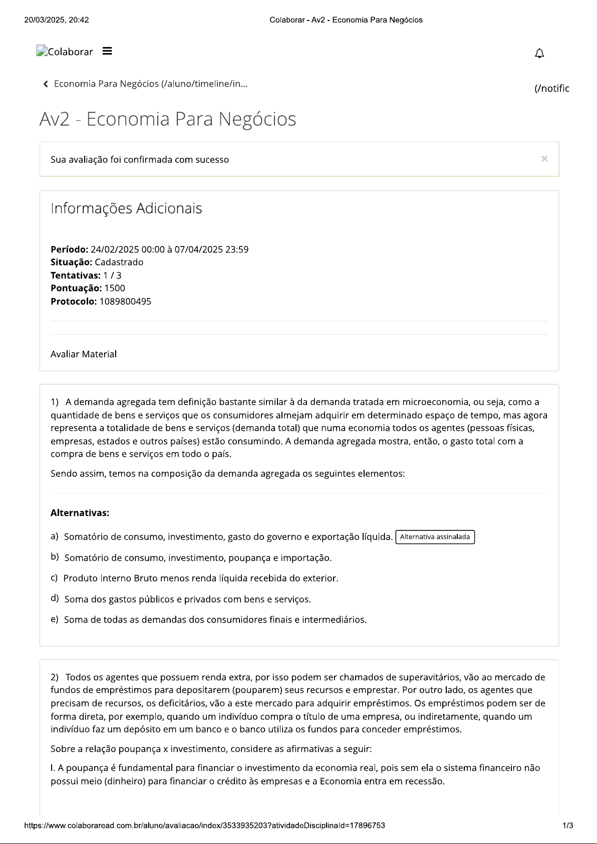 20/03/2025, 20:42 Colaborar - Av2 Economia Para Negócios Colaborar20/03/2025, 20:42 Colaborar Av2 Economia Para Negócios II. Uma sociedade que gasta todo o rendimento que recebe em consumo vai contribuir para a redução da inflação, pois a demanda ficará menor que a oferta. III. A poupança representa um "sacrifício" ao consumo presente que exige um "prêmio pela espera", ou seja, o indivíduo só poupará se puder consumir mais no futuro do que consumiria no presente. É correto o que se afirma apenas em: Alternativas: a) b) c) III d) e III Alternativa assinalada 3) modelo IS-LM é uma das ferramentas fundamentais da macroeconomia que ajuda a entender como as políticas fiscal e monetária afetam o ambiente macroeconômico. Esse modelo IS-LM foi desenvolvido por John Hicks em 1937, como uma simplificação do trabalho de John Maynard Keynes. Hicks procurou ilustrar as ideias centrais da teoria keynesiana em um formato gráfico que pudesse ser facilmente compreendido. Nesse contexto, o objetivo principal do modelo IS-LM na macroeconomia é: Alternativas: a) Prever o comportamento dos preços no mercado de bens e serviços. b) Determinar o nível de emprego em uma economia. c) Analisar as interações entre os mercados de bens e serviços e o mercado monetário. Alternativa assinalada d) Calcular o produto interno bruto (PIB) de um país. e) Estimar a oferta e demanda por moeda no mercado monetário. 4) A política fiscal é meio que o governo utiliza para a gestão econômica. As estratégias governamentais para atingir metas envolvem decisões sobre gastos, programas sociais e impostos. A política fiscal contracionista busca superávits para reduzir dívida pública, enquanto a expansionista visa estimular a economia, gerando déficits. Diferentemente, superávit nominal ocorre quando receitas totais superam despesas, incluindo juros da dívida, e déficit nominal quando despesas ultrapassam receitas. A relação entre política fiscal e dívida pública é vital na formulação de políticas públicas. Considerando o texto sobre política fiscal, déficits e superávits, assinale a alternativa correta. Alternativas: a) A política fiscal contracionista busca superávits primários visando à redução da dívida pública. Alternativa assinalada b) O déficit primário ocorre quando as receitas totais superam as despesas, excluindo os juros da dívida pública. c) A política fiscal expansionista tem como objetivo principal conter o aumento da dívida pública. d) Superávit nominal ocorre quando as despesas totais ultrapassam as receitas, incluindo juros da dívida pública. e) A dívida pública é exclusivamente o dinheiro que o governo deve a credores externos. 2/320/03/2025, 20:42 Colaborar - Av2 - Economia Para Negócios 5) A presença e intervenção do governo nos mercados podem variar, dependendo da orientação político- econômica (mais liberal ou menos liberal) das autoridades que tomam essas decisões. Essa intervenção decorre da necessidade de corrigir imperfeições que surgem de forma natural nos mercados, a fim de corrigir distorções, promover distribuição de renda e investir em infraestrutura essencial. Surge assim, as funções econômicas do governo. Com base nas funções econômicas do governo descritas no texto, qual das seguintes ações está relacionada principalmente à função alocativa do governo? Alternativas: a) A implementação de uma política de tributação progressiva para reduzir a desigualdade. b) A promoção de programas de assistência social para os menos favorecidos. c) A provisão de infraestrutura e serviços de defesa nacional. Alternativa assinalada d) A intervenção estatal para modificar os padrões de preços e emprego. e) A aplicação de políticas de salário mínimo para garantir renda mínima aos trabalhadores. 3/3