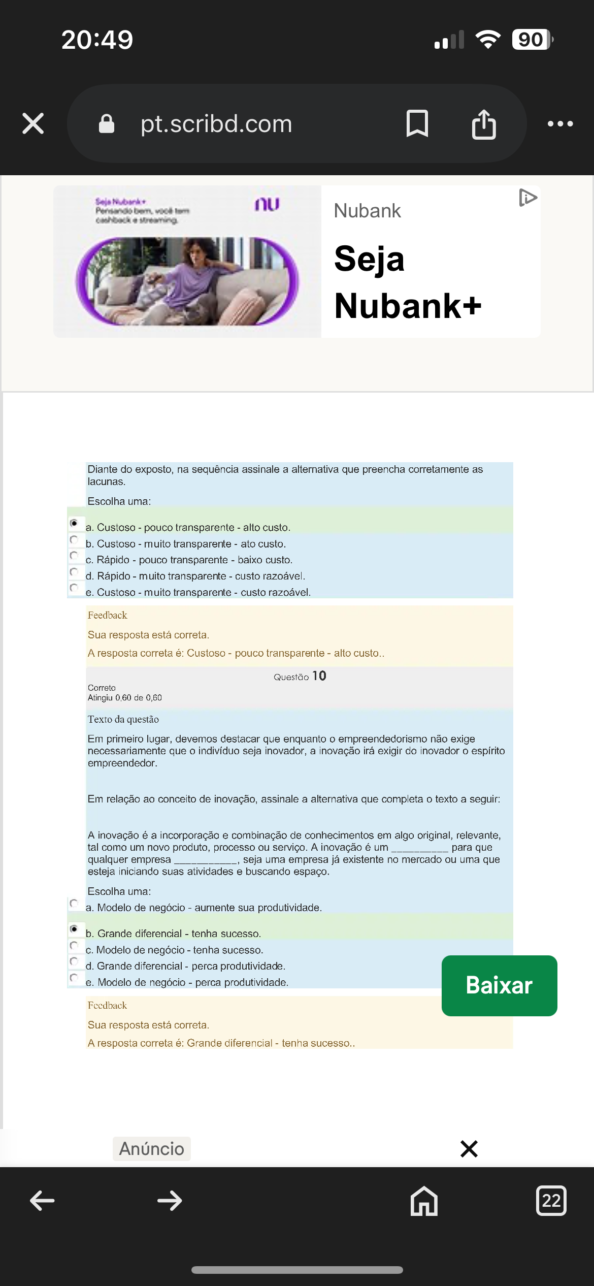 20:49 90 pt.scribd.com nu você Nubank cashback . Seja Nubank+ Diante do exposto, na sequência assinale a alternativa que preencha corretamente as lacunas. Escolha uma: a. Custoso - pouco transparente - alto custo. b. Custoso muito transparente - ato custo. Rápido - pouco transparente - baixo custo. d. Rápido muito transparente - custo razoável. e. Custoso - muito transparente - custo Feedback Sua resposta está correta. A resposta correta é: Custoso - pouco transparente - alto Questão 10 Correto Atingiu 0.60 de 0,60 Texto da questão Em primeiro lugar, devemos destacar que enquanto o empreendedorismo não exige necessariamente que o indivíduo seja inovador, a inovação irá exigir do inovador o espírito empreendedor. Em relação ao conceito de inovação, assinale a alternativa que completa o texto a seguir: A inovação é a incorporação e combinação de conhecimentos em algo original, relevante, tal como um novo produto, processo ou A inovação é um para que qualquer empresa seja uma empresa já existente no mercado ou uma que esteja iniciando suas atividades e buscando espaço. Escolha uma: a. Modelo de negócio - aumente sua produtividade. b. Grande diferencial - tenha sucesso. C. Modelo de negócio tenha sucesso. d. Grande diferencial - perca produtividade. e. Modelo de negócio - perca produtividade. Baixar Feedback Sua resposta está correta. A resposta correta é: Grande diferencial - tenha Anúncio X 22
