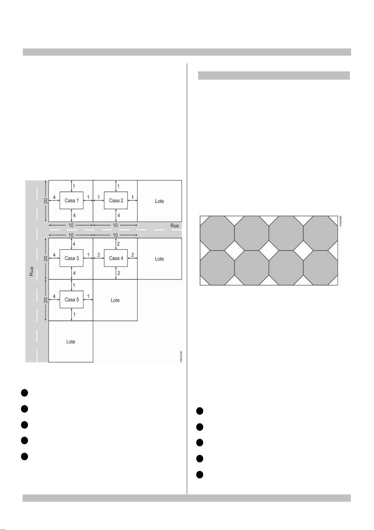 enem2021 //////////////////////////////////////////////////////////////////////////////////////////////////////////////////////////////////////////////////////////////////////////////////////////// //////////////////////////////////////////////////////////////////////////////////////////////////////////////////////////////////////////////////////////////////////////////////////////// I8020 – Help Educacional | Caderno de questões – Página 2 - área total construída da casa entre 40% e 50% da área total do lote. Um construtor submeteu para aprovação na prefeitura dessa cidade uma planta com propostas para a construção de casas em seus 5 lotes. Cada lote tem área medindo 2200 m . A imagem apresenta um esquema, sem escala, no qual estão representados os lotes, as ruas e os afastamentos considerados nos projetos entre as casas e as divisas dos lotes. As medidas indicadas no esquema estão expressas em metro. A prefeitura aprovará apenas a planta da casa A 1. B 2. C 3. D 4. E 5. Questão 4 (Enem 2020) /////////////////////////////////////////////////////////////////////////////// Azulejo designa peça de cerâmica vitrificada e/ou esmaltada usada, sobretudo, no revestimento de paredes.A origem das técnicas de fabricação de azulejos é oriental, mas sua expansão pela Europa traz consigo uma diversificação de estilos, padrões e usos, que podem ser decorativos, utilitários e arquitetônicos. Disponível em: www.itaucultural.org.br. Acesso em: 31 jul. 2012. Azulejos no formato de octógonos regulares serão utilizados para cobrir um painel retangular conforme ilustrado na figura. Entre os octógonos e na borda lateral dessa área, será necessária a colocação de 15 azulejos de outros formatos para preencher os 15 espaços em branco do painel. Uma loja oferece azulejos nos seguintes formatos: 1 – Triângulo retângulo isósceles; 2 – Triângulo equilátero; 3 – Quadrado. Os azulejos necessários para o devido preenchimento das áreas em branco desse painel são os de formato A 1. B 3. C 1 e 2. D 1 e 3. E 2 e 3.
