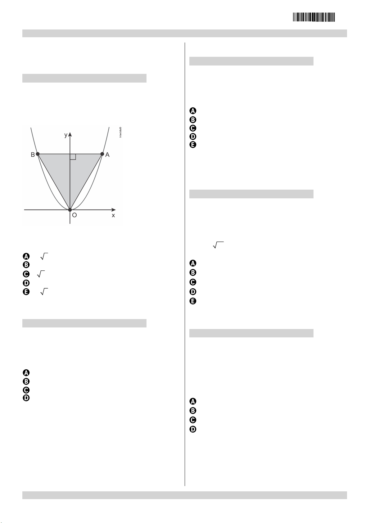 enem2021 /////////////////////////////////////////////////////////////////////////////////////////////////////////////////////////////////////////////////////////////////////////// /////////////////////////////////////////////////////////////////////////////////////////////////////////////////////////////////////////////////////////////////////////// I8020 – Help Educacional | Caderno de questões – Página 3 Questão 6 //////////////////////////////////////////////////////////// No plano cartesiano abaixo estão represen- tados o gráfico da função 2y x= e o triângulo equilátero OAB. A área desse triângulo mede: 2 3 3 3 2 3 3 Questão 7 //////////////////////////////////////////////////////////// Sejam A( 3, 3), B(3,1), C(5, 3)− − e D( 1, 2)− − vértices de um quadrilátero convexo. A medida de uma de suas diagonais é 15 13 12 10 Questão 8 //////////////////////////////////////////////////////////// Calcule a área S do triângulo de vértices A (5, 7); B (2, 3); C (9, 2). Considerando o plano cartesiano, temos: 7,8 15 19 30 60,5 Questão 9 //////////////////////////////////////////////////////////// Qual é a medida da área e do perímetro do losango cujos vértices são A(2, 3); B(1, 0); C(0, 3) e D(1, 6)? Utilize 10 3,2 Área 6= e perímetro 12,8= Área 6= e perímetro 10,4= Área 12= e perímetro 22,3= Área 12= e perímetro 25,9= Área 18= e perímetro 27,1= Questão 10 //////////////////////////////////////////////////////////// O volume do sólido gerado pela rotação, em torno do eixo dos X, da região do plano limitada pelo triângulo com vértices nos pontos (6,0), (8,0) e (8,9) é igual a u.v. unidade de volume 81 u.v. 72 u.v. 64 u.v. 54 u.v.