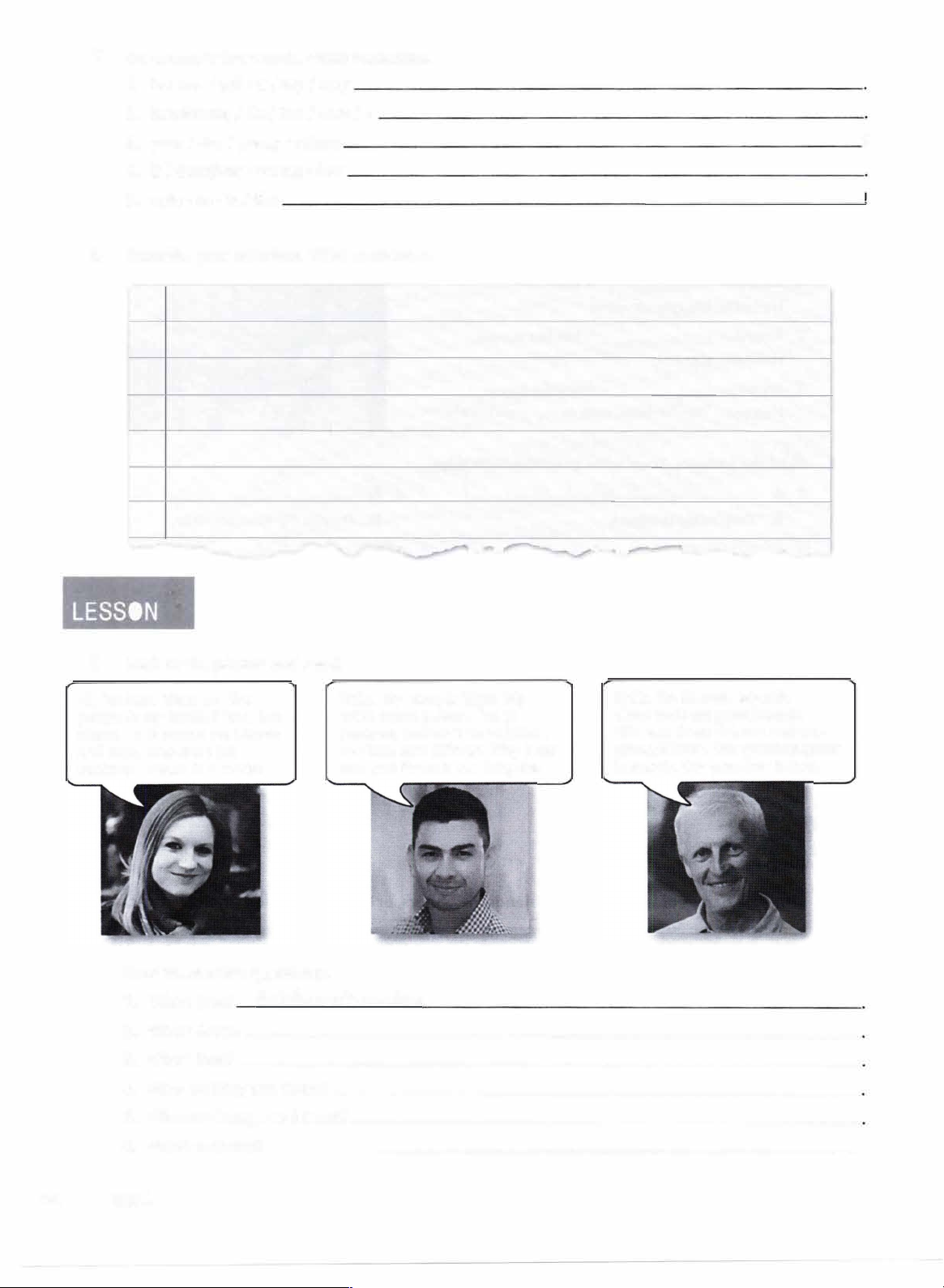 7 Unscramble the words. Write sentences. 1. brother I tall I is I My I very 2. handsome, I He I too I very I is 3. your I Are I pretty I sisters 4. is I daughter I young I Her 5. cute I so I is I She 8 Describe your relatives. Write sentences. __..,___.....___.,,__.,_ �"" • 3 9 Look at the photos and read. - - Hi, I'm Kate. There are five people in my family. I have two sisters. Their names are Megan and Jane. Jane and I are students. Megan is a doctor. Hello. My name is Edgar. My wife's name is Anna. I'm an engineer, and she's an architect. We have two children. Riley is our son, and Reese is our daughter. Now answer the questions. 1. Who's Jake? He15 Geor9e1 � 9rarid5ori - - __ _,....__ Hello. I'm George. My wife Carol and I are grandparents. We have three children and two grandchildren. Our granddaughter is Sophia. Our grandson is Jake. ? 2. Who'sAnna? ______________________________ � 3. Who's Jane? ______________________________ _ 4. Who are Riley and Reese? _________________________ _ 5. Who are George and Carol?-------------------------- 6. Who's a doctor? _____________________________ 100 UNIT 4 10 Look at the picture. Write sentences with have or has. 1. Julia: Slie har two brotherr 2. Rose: _________________________________ _ 3. Barbara and Martin:----------------------------- 4. Dan and Michael:------------------------------ 5. Louis:---------------------------------- 11 Write the next number in words. 1. twenty-one, twenty-eight, thirty-five, forty-two, _______ _ 2. four, eight, sixteen,--------, sixty-four 3. ninety-nine, , seventy-five, sixty-three, fifty-one 4. ten, eleven, twenty-one, thirty-two, fifty-three, _______ _ 12 Complete each sentence with � or has. Then choose the correct response. Circle the letter. 1. Matthew ____ two sisters. a. How old is she? b. How old are they? 2. Mark and Jamie ____ a daughter. a. How old is he? b. How old is she? 3. a brother and a sister. a. How old is your brother? b. How old is my sister? 4. We ____ a son. a. What's your name? b. What's his name? Family 101 JUST FOR FUN www trLanguage c�m 1 A RIDDLE FOR YOU! Read the sentence. Then answer the question. Brothers and sisters have I none, but that man's father is my father's son. Who is "that man"? _____ _ 2 Complete the puzzle. Across 3. Julie's grandmother is ninety-five. She's--· 6. Sons and daughters 7. A good-looking woman is--· 8. Not tall 10. Her grandchildren are very __ . They're one and three years old. 11. A good-looking man is--· 102 IINIT 4 4 6 10 5 8 11 3 Down 1. The English alphabet has __ letters. 2. My father's mother is my--· 4. Dakota Fanning's occupation 5. His daughter's son is his--· 7. Mother and father 9. Heather Joy is Steven Fanning's --· uos AII\I :JaMsu" a1PP!H