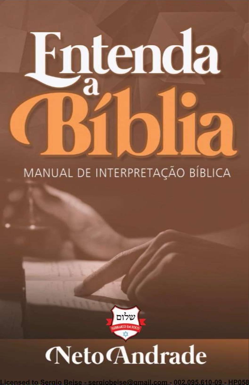 Licensed to Sergio Beise - sergiobeise@gmail.com - 002.095.610-09 - HP05815873334122 © 2020 Instituto Hebraico em Foco Autor: Neto Andrade Todos os direitos reservados e protegidos pela Lei 9.610, de 19/02/1998. É permitida a reprodução parcial desta obra, por quaisquer meios (eletrônicos, mecânicos, fotográficos, gravação e outros), com prévia autorização, por escrito, da editora, desde que citada a fonte. Publicado por Instituto Hebraico em Foco Editor Responsável: Neto Andrade Revisão: Dayanne Soares, Neto Andrade Diagramação e Capa: Cleiton Luna Impressão e Acabamento: ______________________________________________________________ SILVA NETO, Deusdedit Andrade da Manual de interpretação bíblica / Deusdedit Andrade da Silva Neto. ______________________________________________________________ Todos os direitos desta edição são reservados para Instituto Hebraico em Foco – 19.645.325/0001-50 QE 42, Conjunto F1, Casa 26 - Guará II, Brasília DF. 2ª edição: Abril 2020 Licensed to Sergio Beise - sergiobeise@gmail.com - 002.095.610-09 - HP05815873334122 AVISO IMPORTANTE Se você adquiriu esta obra direto com o autor ou pela plataforma de venda da Hotmart (única a disponibilizar o link de acesso), queremos agradecer muito. Tenho certeza que esta obra será um diferencial em sua vida e ministério. Caso tenha recebido este livro de outra forma que não das mencionadas acima, você violou as leis de direitos autorais, incorreu em crime contra Deus e contra as leis dos homens. Não esqueça! O uso deste livro é pessoal. Obrigado pela compreensão e que o Eterno Deus te abençoe mais e mais! O Autor Neto Andrade 61.981780460 Licensed to Sergio Beise - sergiobeise@gmail.com - 002.095.610-09 - HP05815873334122 Agradecimentos Ao Eterno Criador, meu Deus, meu amigo, aquele que nos ama e que enviou seu Filho ao mundo para resgatar-nos da condenação eterna. À minha família. Licensed to Sergio Beise - sergiobeise@gmail.com - 002.095.610-09 - HP05815873334122 SUMÁRIO A Interpretação Bíblica ............................................................... 7 Jesus, os escritores do Novo Testamento e a Interpretação Bíblica ............................................................................................... 14 A Classificação da Hermenêutica ........................................... 23 Hermenêutica Geral ..................................................................... 23 Hermenêutica Especial ................................................................ 23 Exegese e Hermenêutica ............................................................. 30 A Necessidade da Interpretação............................................. 33 A História da Interpretação Bíblica ...................................... 42 Período dos Pais da Igreja .......................................................... 42 Período Medieval .......................................................................... 49 Período da Reforma Protestante .............................................. 51 O Intérprete Bíblico ................................................................... 53 Vida de oração: dependência do Espírito Santo ................... 54 Vida de leitura e prática da Bíblia ............................................ 56 Amor e busca pela verdade ........................................................ 57 Humildade no trato com as Escrituras Sagradas. Respeito com o texto. ..................................................................................... 58 Aberto a novos e necessários conhecimentos ...................... 59 Prazer em ensinar a outros ........................................................ 60 Sobre o Significado e o Sentido do Texto .............................. 62 Círculo Hermenêutico .................................................................. 67 O Sentido literal e o Sentido Comum ....................................... 69 Aplicações do Texto ...................................................................... 72 Licensed to Sergio Beise - sergiobeise@gmail.com - 002.095.610-09 - HP05815873334122 Duas mentes, dois significados? ............................................... 76 O Remez: uma dica no texto ....................................................... 78 A Hermenêutica Judaica ........................................................... 80 Método de Interpretação Judaica ............................................. 84 Hillel e a Interpretação Bíblica ................................................. 88 Passos para a Interpretação Bíblica .................................. 103 Estudo histórico-cultural-teológico ....................................... 105 Estudo léxico-sintático .............................................................. 108 Estudo Literário ........................................................................... 113 Praticando a Hermenêutica Bíblica: Modelo de Interpretação: Exegese de Marcos 3.31-35 ...................... 115 Praticando a Hermenêutica Bíblica: Modelo de Comentário Exegético – Oseias 3.1-5 ................................. 127 Apêndice ..................................................................................... 140 As línguas Originais .................................................................... 140 ELOHIM NA BÍBLIA HEBRAICA ................................................ 149 NOME DO ETERNO ....................................................................... 151 AMALDIÇOA A DEUS E MORRE ................................................. 154 REFERÊNCIAS ............................................................................ 157 Biografia .................................................................................... 164 Licensed to Sergio Beise - sergiobeise@gmail.com - 002.095.610-09 - HP05815873334122 7 1 A Interpretação Bíblica A relação entre ler a Bíblia e interpretá-la é o que nos dá acesso 