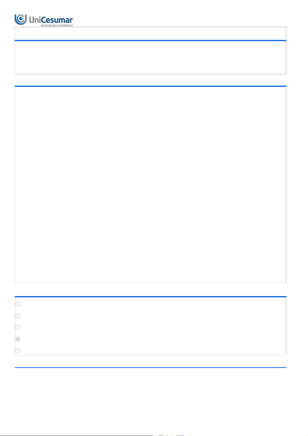 ATIVIDADE DE ESTUDO - SEMANA DE CONHECIMENTOS GERAIS - 51_2025 Período:10/03/2025 08:00 a 13/04/2025 23:59 (Horário de Brasília) Status:ABERTO Nota máxima:1,00 Gabarito:Gabarito será liberado no dia 14/04/2025 00:00 (Horário de Brasília) Nota obtida: 1ª QUESTÃO Considere o caso hipotético a seguir: Liv tem 26 anos e é muito querida por seus amigos. Diariamente, ela consegue expressar suas emoções de forma precisa. Ao ver uma de suas colegas passar no vestibular, ela disse: "Amiga, sinto inveja de você!" A amiga não se assustou, pois sabe que Liv tem essa característica de demonstrar o que sente. Isso não é um impedimento para ela, pois ela sabe controlar suas emoções e até propôs para a caloura levá-la uma vez por semana para a faculdade. Outro amigo estava em dúvida sobre qual seria seu destino de férias, e Liv, por conhecê-lo muito bem, sugeriu que ele fosse para a praia, pois ainda não conhecia o mar. O amigo disse: "Liv, como você tem essa facilidade em tomar decisões?" O outro destino era uma trilha de ecoturismo, que o amigo já havia feito nos últimos três anos. Elaborado pelo autor. Considerando o texto apresentado e as características centrais para a definição de inteligência emocional, analise as afirmativas a seguir: I. Liv possui inteligência emocional e demonstra uma capacidade singular de perceber e expressar emoções; ela disse para a amiga que sentia inveja. II. Liv possui inteligência emocional e tem controle emocional, gerenciando emoções que são consideradas negativas, como a inveja, e transformando-as em algo positivo. III. Liv possui inteligência emocional e desenvolveu facilidade de tomar decisões baseadas em dados concretos; o amigo poderia experimentar algo novo em suas férias. IV. Liv possui inteligência emocional e mostra capacidade de prever o futuro; ela decidiu pelo amigo para ele conhecer a praia. É correto o que se afirma em: ALTERNATIVAS I, apenas. II e IV, apenas. III e IV, apenas. I, II e III, apenas. I, II, III e IV. 2ª QUESTÃO 18/03/2025, 17:50 Unicesumar - Ensino a Distância about:blank 1/8 A transição para a vida acadêmica pode ser um fator estressante para os estudantes universitários, impactando sua adaptação e bem-estar. Estudos apontam que os principais sintomas apresentados por esses estudantes incluem ansiedade (52,2%), estresse (52,2%) e depressão (47,8%). Esses sintomas são compreendidos como um padrão de interação entre o indivíduo e o ambiente universitário, sendo influenciados por fatores como o nível de exigência do curso, a infraestrutura da instituição e os relacionamentos interpessoais. Para minimizar esses impactos, é fundamental que os estudantes desenvolvam repertórios específicos que auxiliem na adaptação ao novo contexto acadêmico. Entre os repertórios requeridos para essa adaptação, destaca-se autonomia (43,5%), comprometimento (34,8%), manejo das emoções (26,1%) e autoeficácia (26,1%). Na tabela a seguir, é possível verificar a distribuição dos sintomas apresentados pelos estudantes universitários e os repertórios requeridos para sua adaptação. Tabela: Sintomas apresentados Pelos Estudantes e Repertório Requerido à Adaptação (Recorte) Fonte: SAHÃO, F. T.; KIENEN, N. Adaptação e saúde mental do estudante universitário: revisão sistemática da literatura. Psicologia Escolar e Educacional, [s. l.], v. 25, p. e224238, 2021. Disponível em: https://www.scielo.br/j/pee/a/tdnsrZFwKyb53nvNZG79p9n/?format=pdf&lang=pt. Acesso em: 25 fev. 2025. Com base nessas informações, sobre a transição para a vida acadêmica, analise as afirmativas a seguir: I. A adaptação ao ambiente universitário depende exclusivamente das características individuais do estudante, pois fatores externos não influenciam significativamente a manifestação de sintomas como ansiedade e estresse. II. O desenvolvimento de repertórios como autonomia e manejo das emoções pode contribuir para a adaptação dos estudantes, minimizando o impacto negativo dos desafios acadêmicos. III. O nível de exigência do curso, a infraestrutura da instituição e os relacionamentos interpessoais são fatores que podem influenciar a permanência do estudante na universidade, afetando seu desempenho e motivação. IV. A ansiedade e o estresse são sintomas exclusivamente biológicos, sem relação com as interações do estudante com o ambiente universitário. É correto o que se afirma em: ALTERNATIVAS 18/03/2025, 17:50 Unicesumar - Ensino a Distância about:blank 2/8 II, apenas. I e III, apenas. I, II e IV, apenas. II e III, apenas. III e IV, apenas. 3ª QUESTÃO Diversos estudos que investigam fenômenos relacionados à adaptação do estudante e sua saúde mental destacam a necessidade de realização de pesquisas e intervenções com a população universitária. Isso porque a transição para a vida acadêmica parece ser uma experiência potencialmente estressora para jovens estudantes, o que pode influenciar no modo como eles aproveitarão as oportunidades oferecidas pela universidade, tanto com relação à formação profissional quanto ao desenvolvimento psicossocial. Fonte: SAHÃO, F. T.; KIENEN, N. Adaptação e saúde mental do estudante universitário: revisão sistemática da literatura. Psicologia Escolar e Educacional, [s. l.], v. 25, p. e224238, 2021. Disponível em: https://www.scielo.br/j/pee/a/tdnsrZFwKyb53nvNZG79p9n/?format=pdf&lang=pt. Com base no trecho apresentado, no que melhor representa uma possível consequência da transição para a vida acadêmica, assinale a alternativa correta: ALTERNATIVAS Maior adaptação dos estudantes ao ambiente universitário sem impactos emocionais. Redução do nível de estresse e ansiedade devido à flexibilidade acadêmica. Influência negativa na saúde mental dos estudantes, podendo afetar seu desempenho e adaptação. Melhoria automática no bem-estar dos estudantes devido às novas oportunidades oferecidas. Adoção e