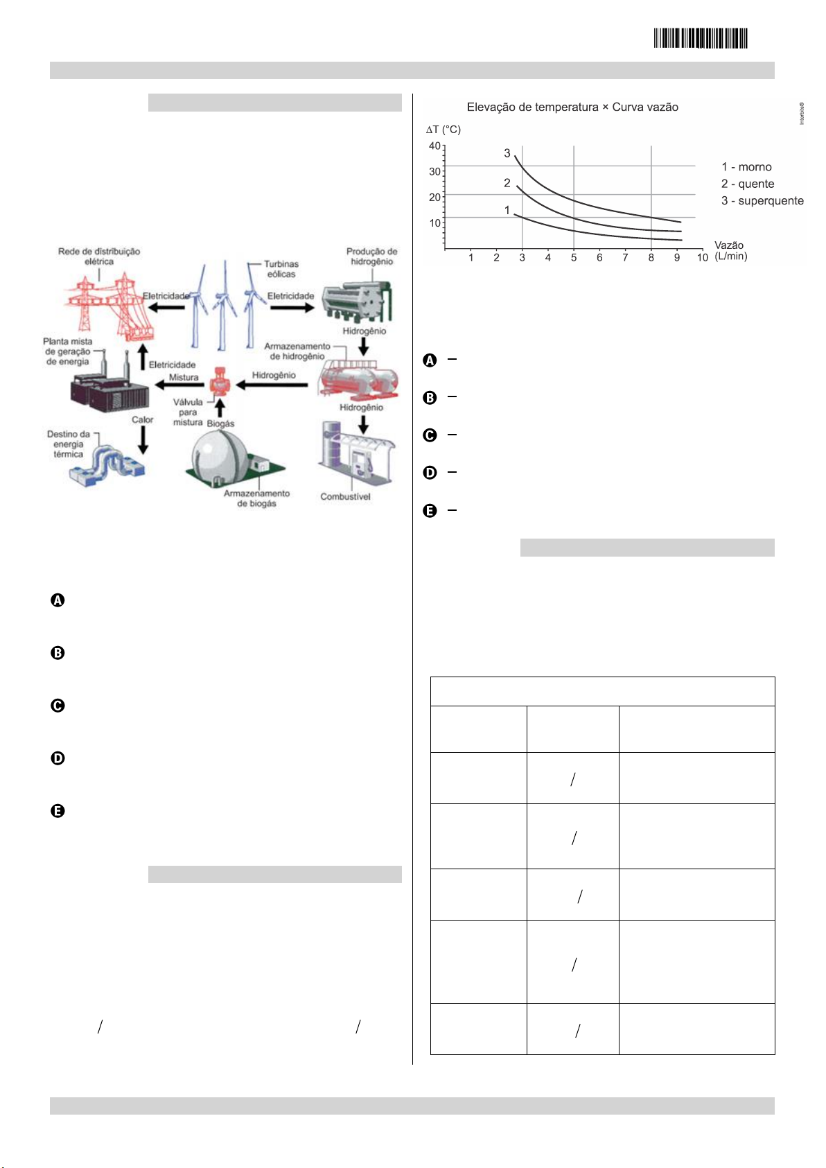 enem2021 /////////////////////////////////////////////////////////////////////////////////////////////////////////////////////////////////////////////////////////////////////////// /////////////////////////////////////////////////////////////////////////////////////////////////////////////////////////////////////////////////////////////////////////// I8020 – Help Educacional | Caderno de questões – Página 2 Questão 4 //////////////////////////////////////////////////////////// (Enem 2017) A figura mostra o funcionamento de uma estação híbrida de geração de eletricidade movida a energia eólica e biogás. Essa estação possibilita que a energia gerada no parque eólico seja armazenada na forma de gás hidrogênio, usado no fornecimento de energia para a rede elétrica comum e para abastecer células a combustível. Mesmo com ausência de ventos por curtos períodos, essa estação continua abastecendo a cidade onde está instalada, pois o(a) planta mista de geração de energia realiza eletrólise para enviar energia à rede de distribuição elétrica. hidrogênio produzido e armazenado é utilizado na combustão com o biogás para gerar calor e eletricidade. conjunto de turbinas continua girando com a mesma velocidade, por inércia, mantendo a eficiência anterior. combustão da mistura biogás-hidrogênio gera diretamente energia elétrica adicional para a manutenção da estação. planta mista de geração de energia é capaz de utilizar todo o calor fornecido na combustão para a geração de eletricidade. Questão 5 //////////////////////////////////////////////////////////// (Enem 2017) No manual fornecido pelo fabricante de uma ducha elétrica de 220 V é apresentado um gráfico com a variação da temperatura da água em função da vazão para três condições (morno, quente e superquente). Na condição superquente, a potência dissipada é de 6.500 W. Considere o calor específico da água igual a 4.200 J (kg C) e densidade da água igual a 1kg L. Com base nas informações dadas, a potência na condição morno corresponde a que fração da potência na condição superquente? 1 3 1 5 3 5 3 8 5 8 Questão 6 //////////////////////////////////////////////////////////// (Enem PPL 2016) Os raios X utilizados para diagnósticos médicos são uma radiação ionizante. O efeito das radiações ionizantes em um indivíduo depende basicamente da dose absorvida, do tempo de exposição e da forma da exposição, conforme relacionados no quadro. Disponível em: www.cnen.gov.br. Acesso em: 3 set. 2012 (adaptado). Efeitos de uma radioexposição aguda em adulto Forma Dose absorvida Sintomatologia Infraclínica menor que 1 J kg Ausência de sintomas Reações gerais leves de 1 a 2 J kg Astenia, náuseas e vômito, de 3h a 6h após a exposição 50DL de 4 a 4,5 J kg Morte de 50% dos indivíduos irradiados Pulmonar de 8 a 9 J kg Insuficiência respiratória aguda, coma e morte, de 14h a 36h Cerebral maior que 10 J kg Morte em poucas horas