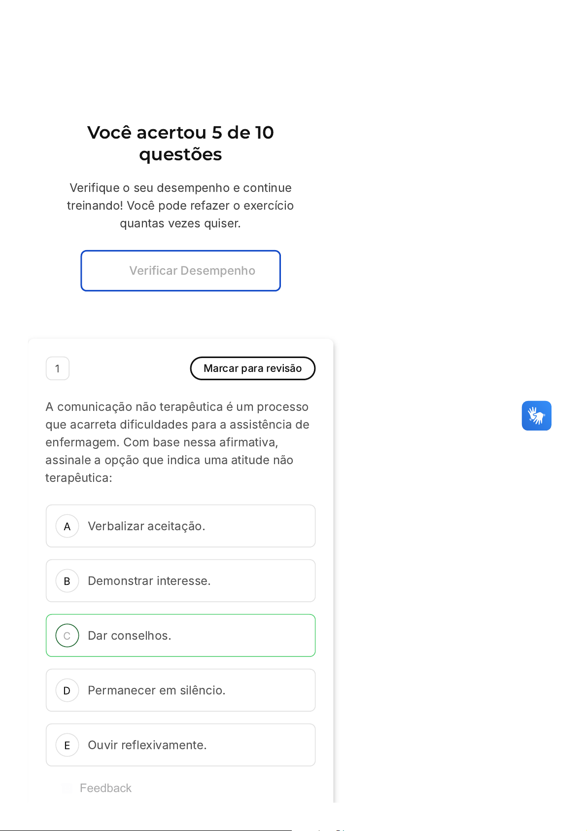 Você acertou 5 de 10 questões Verifique o seu desempenho e continue treinando! Você pode refazer o exercício quantas vezes quiser. Verificar Desempenho A B C D E 1 Marcar para revisão A comunicação não terapêutica é um processo que acarreta dificuldades para a assistência de enfermagem. Com base nessa afirmativa, assinale a opção que indica uma atitude não terapêutica: Verbalizar aceitação. Demonstrar interesse. Dar conselhos. Permanecer em silêncio. Ouvir reflexivamente. Feedback A B C Resposta correta Parabéns, você selecionou a alternativa correta. Confira o gabarito comentado! Gabarito Comentado A alternativa correta é "Dar conselhos". A comunicação terapêutica na enfermagem é baseada em ouvir e entender o paciente, em vez de dar conselhos. Dar conselhos pode ser considerado uma forma de comunicação não terapêutica, pois pode desvalorizar os sentimentos do paciente e impedir a expressão de suas preocupações. Portanto, a enfermagem deve se concentrar em ouvir e entender o paciente, em vez de dar conselhos não solicitados. 2 Marcar para revisão Para o estabelecimento de uma sociedade, o ato de comunicar é imprescindível. Quais são os elementos fundamentais para que ocorra um processo de comunicação? Receptor, Emissor, Segredos, Canal, Mensagem Receptor, Emissor, Mensagem, Canal, Meio Emissor, Subintenção, Mensagem, Código, Verbalização D E Receptor, Emissor, Mensagem, Código, Canal Receptor, Emissor, Ruído, Mídia, Canal Resposta incorreta Opa! A alternativa correta é a letra D. Confira o gabarito comentado! Gabarito Comentado Os elementos fundamentais para que ocorra um processo de comunicação são: Receptor, Emissor, Mensagem, Código e Canal. O Emissor é quem envia a mensagem, o Receptor é quem a recebe. A Mensagem é o conteúdo transmitido, o Código é o conjunto de signos usado na transmissão e interpretação da mensagem e o Canal é o meio pelo qual a mensagem é transmitida. 3 Marcar para revisão As formas gestuais de comunicação não verbal são muito difíceis de evitar porque são manifestações afetivas culturalmente determinadas. Dessa forma, pode-se afirmar que: I) Todo movimento ou expressão corporal tem significado. II) A atividade corporal influencia o comportamento do outro. III) A cinésica não tem papel importante na comunicação das mensagens que manifestamos ou recebemos. A B C D E IV) Complementa a comunicação verbal, por se tratar de movimento corporal que expressa algum significado. Assinale a alternativa correta: I e II estão erradas. I, II e IV estão corretas. II, III e IV estão corretas. III e IV estão corretas. Todas estão corretas. Resposta incorreta Opa! A alternativa correta é a letra B. Confira o gabarito comentado! Gabarito Comentado A alternativa correta é a B, que afirma que as afirmações I, II e IV estão corretas. A afirmação I é verdadeira porque todo movimento ou expressão corporal carrega um significado, seja ele cultural, social ou pessoal. A afirmação II também é verdadeira, pois a atividade corporal pode influenciar o comportamento do outro, seja de forma positiva ou negativa. A afirmação IV é verdadeira porque a comunicação não verbal complementa a comunicação verbal, pois os movimentos corporais expressam significados que podem reforçar ou contradizer o que está sendo dito verbalmente. A afirmação III é a única que está incorreta, pois a cinésica, que é o A B C D E estudo da comunicação através dos movimentos corporais, tem um papel muito importante na comunicação das mensagens que manifestamos ou recebemos. 4 Marcar para revisão Leia as afirmações e indique a alternativa correta: I. O grupamento de expressão busca descrever a experiência do paciente, a fim de que o enfermeiro possa conhecê-la. II. O grupamento de clarificação busca obter significado mais explícito da mensagem, a fim de efetivar a interlocução. III. O grupamento de validação busca aplicar o protocolo estabelecido pelo médico. Apenas a I está correta. Apenas a II está correta. Apenas a III está correta. Apenas I e II estão corretas. Nenhuma está correta. Resposta incorreta Opa! A alternativa correta é a letra D. Confira o gabarito comentado! Gabarito Comentado As afirmações I e II estão corretas. A afirmação I descreve corretamente o objetivo do grupamento de expressão, que é entender a experiência do paciente para que o enfermeiro possa conhecê-la melhor. A afirmação II também está correta, pois o grupamento de clarificação tem como objetivo obter um significado mais explícito da mensagem para efetivar a interlocução. No entanto, a afirmação III está incorreta. O grupamento de validação não busca aplicar o protocolo estabelecido pelo médico, mas sim confirmar ou corroborar informações ou sentimentos expressos pelo paciente. Portanto, apenas as afirmações I e II estão corretas. 5 Marcar para revisão As interações que os profissionais de enfermagem estabelecem com o usuário são capazes de torná-lo mais ajustado e aumentar sua autoestima, ou seja, sua comunicação com o usuário pode e deve ser terapêutica. Com base no assunto, é correto afirmar: A B C D E Todo profissional de saúde tem o dever de desenvolver a competência interpessoal, apropriando-se de conhecimentos da comunicação humana e terapêutica para estabelecer uma relação de ajuda com o usuário. Realizar comunicação terapêutica é de responsabilidade exclusiva dos psicólogos e médicos. O enfermeiro não deve interagir de modo a se apropriar de fatos íntimos do usuário, pois tais assuntos são confidenciais e o código de ética da enfermagem enfatiza que atitude como essa é antiética, já que invade a privacidade. Quando o enfermeiro informar ou orientar alguma coisa ao usuário, já estará realizando uma comunicação terapêutica, ou seja, estabelecerá uma relação de ajuda. A relação interpessoal para ser efetiva ou terapêutica dever