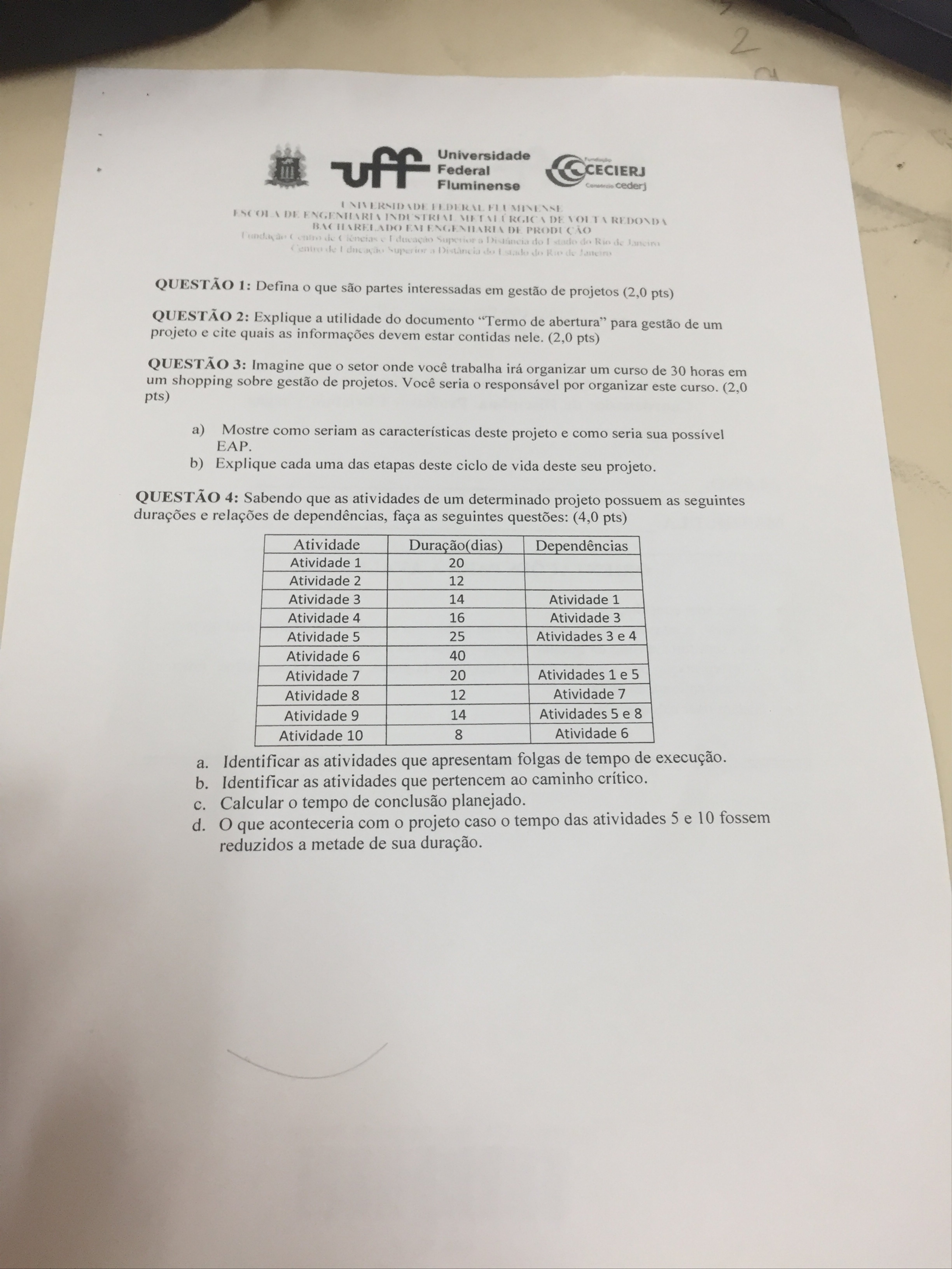 uff Universidade Federal CECIERJ Fluminense cederj FEDERAL DE INDUSTRIAL METAL RGICA DE VOLTA BAC HARELADO EM DE Fundação ( ducação Superior do stado do Rio de Janciro Superior do de Janeiro QUESTÃO 1: Defina que são partes interessadas em gestão de projetos (2,0 pts) QUESTÃO 2: Explique a utilidade do documento "Termo de abertura" para gestão de um projeto e cite quais as informações devem estar contidas nele. (2,0 pts) QUESTÃO 3: Imagine que o setor onde você trabalha irá organizar um curso de 30 horas em um shopping sobre gestão de projetos. Você seria responsável por organizar este curso. (2,0 pts) a) Mostre como seriam as características deste projeto e como seria sua possível EAP. b) Explique cada uma das etapas deste ciclo de vida deste seu projeto. QUESTÃO 4: Sabendo que as atividades de um determinado projeto possuem as seguintes durações e relações de dependências, faça as seguintes questões: (4,0 pts) Atividade Duração(dias) Dependências Atividade 1 20 Atividade 2 12 Atividade 3 14 Atividade 1 Atividade 4 16 Atividade 3 Atividade 5 25 Atividades 3 e 4 Atividade 6 40 Atividade 7 20 Atividades 1 e 5 Atividade 8 12 Atividade 7 Atividade 9 14 Atividades 5 e 8 Atividade 10 8 Atividade 6 a. Identificar as atividades que apresentam folgas de tempo de execução. b. Identificar as atividades que pertencem ao caminho crítico. Calcular o tempo de conclusão planejado. d. O que aconteceria com projeto caso o tempo das atividades 5 e 10 fossem reduzidos a metade de sua duração.