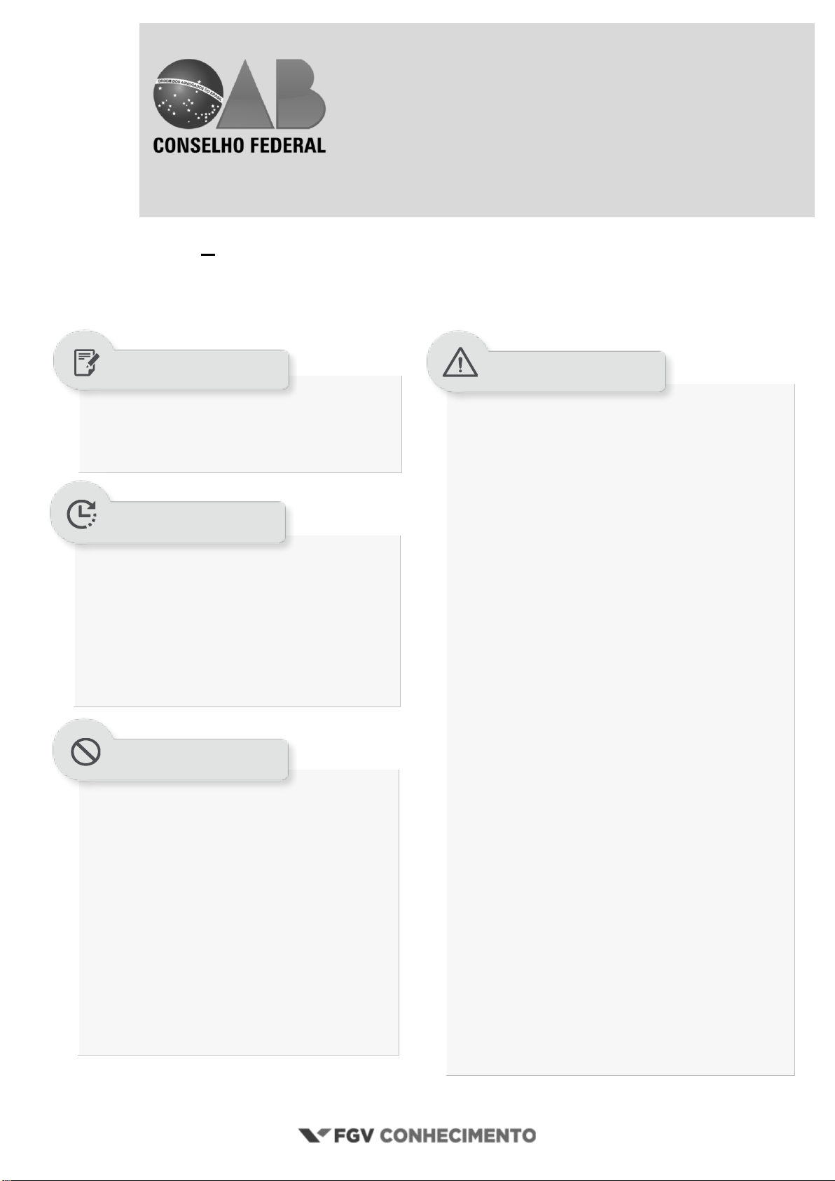 “Qualquer semelhança nominal e/ou situacional presente nos enunciados das questões é mera coincidência” Ordem dos Advogados do Brasil TARDE 42O EXAME DE ORDEM UNIFICADO TIPO 4 – AZUL • Além deste caderno contendo 80 (oitenta) questões objetivas e o questionário de percepção sobre a prova com 10 (dez) itens, você receberá do fiscal de sala a folha destinada às respostas das questões objetivas. • • Verifique se o tipo/cor de prova corresponde ao registrado em sua folha de respostas. Caso contrário, informe imediatamente o fiscal da sala para o devido registro na ata de aplicação. A ausência de registro deste fato acarretará a correção da prova conforme o tipo/cor constante na folha de respostas, não cabendo reclamações posteriores nesse sentido. • Confira seus dados pessoais, especialmente nome, número de inscrição e documento de identidade e leia atentamente as instruções para preencher a folha de respostas. • Assinale seu nome, no espaço reservado, com caneta esferográfica transparente de cor azul ou preta. • Em hipótese alguma haverá substituição da folha de respostas por erro do examinando. • Reserve tempo suficiente para o preenchimento da sua folha de respostas. Para fins de avaliação, serão levadas em consideração apenas as marcações realizadas na folha de respostas. • A FGV realizará identificação datiloscópica de todos os examinandos. A identificação datiloscópica compreenderá a coleta das impressões digitais dos examinandos em formulário próprio. • Ao terminar a prova, você deverá, obrigatoriamente, entregar a folha de respostas devidamente preenchida e assinada ao fiscal da sala. O examinando que descumprir a regra de entrega de tal documento será eliminado. • Os 3 (três) últimos examinandos de cada sala só poderão sair juntos, após entregarem ao fiscal de aplicação os documentos que serão utilizados na correção das provas. Caso algum desses examinandos insista em sair do local de aplicação antes de autorizado pelo fiscal de aplicação, deverá assinar termo desistindo do exame e, caso se negue, será lavrado Termo de Ocorrência, testemunhado pelos 2 (dois) outros examinandos, pelo fiscal de aplicação da sala e pelo coordenador da unidade de provas. • Esses 3 (três) examinandos, caso queiram, poderão acompanhar o procedimento de conferência da documentação da sala de aplicação, que será realizado pelo coordenador da unidade, na coordenação do local de provas. • 5 (cinco) horas é o tempo disponível para a realização da prova, já incluindo o tempo para a marcação da folha de respostas da prova objetiva. • 2 (duas) horas após o início da prova será possível retirar-se da sala, sem levar o caderno de prova. • 1 (uma) hora antes do término do período de prova será possível retirar-se da sala levando o caderno de questões. • Qualquer tipo de comunicação entre os examinandos. • Levantar da cadeira sem a devida autorização do fiscal de sala. • Portar aparelhos eletrônicos, tais como bipe, walkman, agenda eletrônica, notebook, netbook, palmtop, receptor, gravador, telefone celular, máquina fotográfica, protetor auricular, MP3, MP4, controle de alarme de carro, pendrive, fones de ouvido, Ipad, Ipod, Iphone, etc., bem como relógio de qualquer espécie, óculos escuros ou quaisquer acessórios de chapelaria, tais como chapéu, boné, gorro etc., e, ainda, lápis, lapiseira, borracha e/ou corretivo de qualquer espécie. • Usar o sanitário ao término da prova, após deixar a sala. SUA PROVA TEMPO NÃO SERÁ PERMITIDO INFORMAÇÕES GERAIS 42o EXAME DO ORDEM UNIFICADO Tipo 4 – Azul – Página 2 1 Roberto Silva, advogado e sócio fundador da sociedade de advogados Silva e Souza Advogados Associados, foi eleito para o cargo de Prefeito do Município Ômega. Embora feliz e motivado com o mandato que lhe foi confiado pela população, Roberto Silva não gostaria de se retirar da sociedade de advogados por ele fundada. Considerando o Estatuto da Advocacia e da OAB, assinale a afirmativa que descreve corretamente a situação societária e a eventual atuação de Roberto Silva como advogado após assumir o cargo de Prefeito de Ômega: A) É impositiva a exclusão de Roberto Silva da sociedade de advogados Silva e Souza Advogados Associados, dada a incompatibilidade do cargo de Prefeito Municipal com a advocacia. B) O exercício do mandato de Prefeito de Ômega impede apenas que Roberto Silva advogue contra a Fazenda Pública que o remunera, no caso o Município Ômega, não havendo óbice para que continue integrando a sociedade de advogados e atuando em causas diversas. C) O exercício do mandato de Prefeito de Ômega é incompatível com a advocacia, mas, por si só, não excluirá Roberto Silva da sociedade de advogados Silva e Souza Advogados Associados, a qual poderá continuar explorando o nome e a imagem do seu fundador em benefício da sociedade. D) Embora incompatível com a advocacia, o exercício do cargo de Prefeito de Ômega, por si só, não excluirá Roberto Silva da sociedade de advogados Silva e Souza Advogados Associados. Contudo, deve o fato ser averbado no registro da sociedade, bem como observada a incompatibilidade temporária. 2 A advogada Nina exerce função na diretoria do Conselho Federal da OAB. Em virtude exclusivamente das funções desempenhadas na OAB, Nina toma conhecimento de certos fatos envolvendo seus colegas advogados João e Maria. Nina acaba de receber uma intimação para depor como testemunha em audiência de instrução e julgamento, referente a uma ação indenizatória, de cunho meramente patrimonial, sem envolver grave ameaça ao direito à vida e à honra, ajuizada por Maria em face de João, cujo objeto tem relação com mencionados fatos de que tomou conhecimento no exercício da citada função no Conselho Federal da OAB Considerando a situação hipotética, assinale a afirmativa correta. A) Nina nã