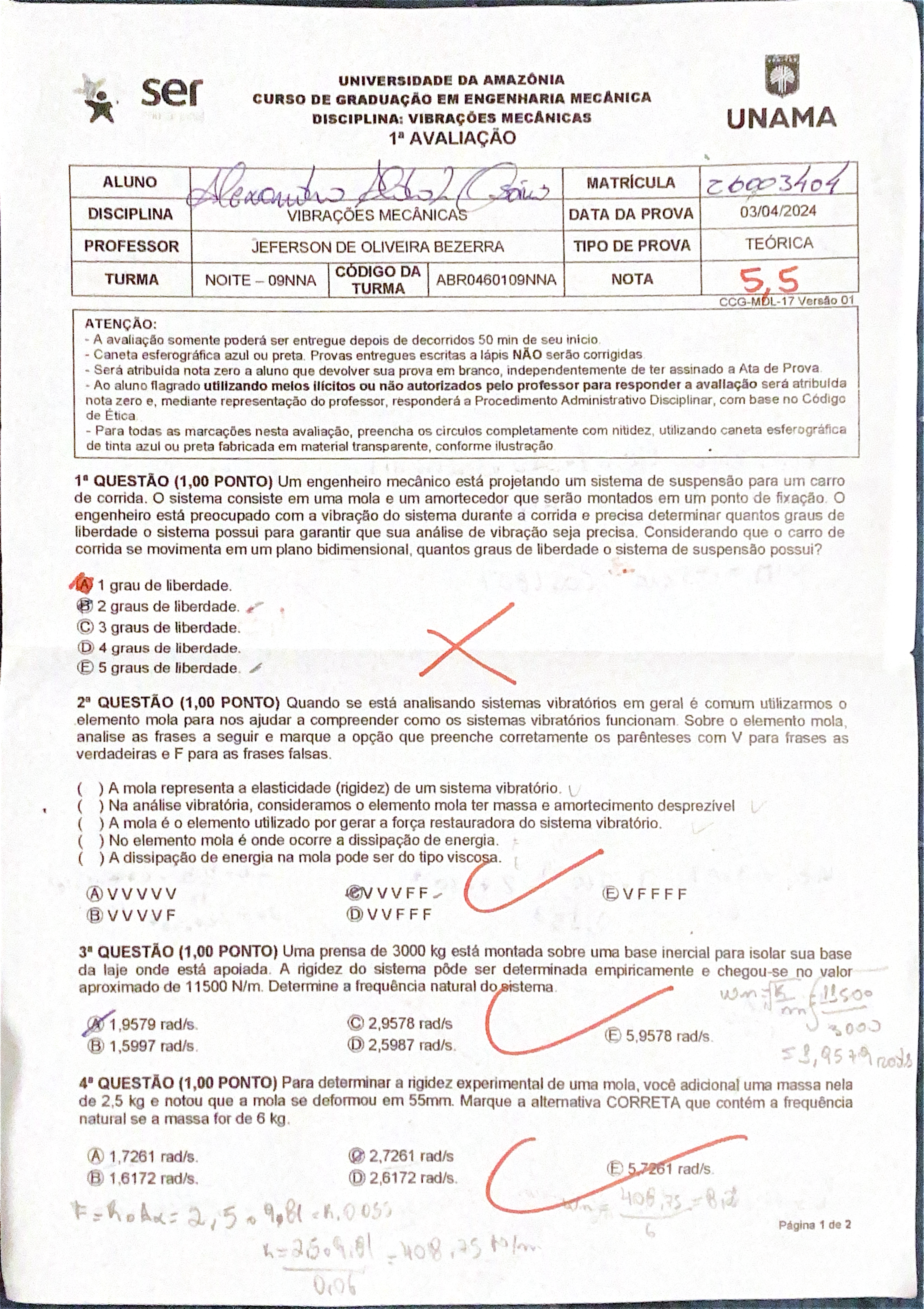 ser UNIVERSIDADE DA CURSO DE GRADUAÇÃO EM ENGENHARIA MECÂNICA DISCIPLINA: VIBRAÇÕES MECÂNICAS UNAMA AVALIAÇÃO ALUNO MATRÍCULA 26003404 DISCIPLINA VIBRAÇÕES MECÂNICAS DATA DA PROVA 03/04/2024 PROFESSOR JEFERSON DE OLIVEIRA BEZERRA TIPO DE PROVA TEÓRICA CÓDIGO DA TURMA NOITE 09NNA ABR0460109NNA NOTA TURMA 5,5 CCG-MDL-17 Versão 01 ATENÇÃO: A avaliação somente poderá ser entregue depois de decorridos 50 min de seu Caneta esferográfica azul ou preta. Provas entregues escritas a lápis NÃO serão corrigidas Será atribuida nota zero a aluno que devolver sua prova em branco, independentemente de ter assinado a Ata de Ao aluno flagrado utilizando melos ilícitos ou não autorizados pelo professor para responder a avallação será atribulda nota zero e, mediante representação do professor, responderá a Procedimento Administrativo Disciplinar, com base no Código de Ética Para todas as marcações nesta avaliação, preencha os circulos completamente com utilizando caneta esferográfica de tinta azul ou preta fabricada em material transparente, conforme ilustração QUESTÃO (1,00 PONTO) Um engenheiro mecânico está projetando um sistema de suspensão para um carro de corrida. sistema consiste em uma mola e um amortecedor que serão montados em um ponto de engenheiro está preocupado com a vibração do sistema durante a corrida e precisa determinar quantos graus de liberdade o sistema possui para garantir que sua análise de vibração seja precisa. Considerando que o carro de corrida se movimenta em um plano bidimensional, quantos graus de liberdade o sistema de suspensão possui? 1 grau de liberdade. 2 graus de liberdade. 3 graus de 4 graus de E 5 graus de QUESTÃO (1,00 PONTO) Quando se está analisando sistemas vibratórios em geral é comum utilizarmos elemento mola para nos ajudar a compreender como os sistemas vibratórios Sobre o elemento mola, analise as frases a seguir e marque a opção que preenche corretamente os parênteses com V para frases as verdadeiras e F para as frases falsas ( ) A mola representa a elasticidade (rigidez) de um sistema vibratório. ( ) Na análise vibratória, consideramos o elemento mola ter massa e amortecimento ( ) A mola é o elemento utilizado por gerar a força restauradora do sistema ( ) No elemento mola é onde ocorre a dissipação de energia. ( ) A dissipação de energia na mola pode ser do tipo viscosa. A B VVVVF VVFFF QUESTÃO (1,00 PONTO) Uma prensa de 3000 kg está montada sobre uma base inercial para isolar sua base da laje onde está apoiada. A rigidez do sistema pôde ser determinada empiricamente e chegou-se no valor aproximado de 11500 N/m. Determine a frequência natural do 2,9578 rad/s 5,9578 3000 B 1,5997 D 2,5987 rad/s. 53,9579 nots QUESTÃO (1,00 PONTO) Para determinar a rigidez experimental de uma mola, você adicional uma massa nela de 2,5 kg e notou que a mola se deformou em 55mm. Marque a alternativa CORRETA que contém a frequência natural se a massa for de 6 kg. A rad/s. 2,7261 rad/s E 5.7261 B 1,6172 rad/s. 2,6172 rad/s. Página 1 de 2ser UNIVERSIDADE DA AMAZÔNIA CURSO DE GRADUAÇÃO EM ENGENHARIA MECÂNICA DISCIPLINA: VIBRAÇÕES MECÂNICAS UNAMA AVALIAÇÃO QUESTÃO (1,00 PONTO) Uma das formas de classificação dos sistemas vibratórios é classificá-lo quanto aos graus de Sobre graus de liberdades podemos afirmar que: A É o número de coordenadas dependentes necessárias para descrever o movimento de um corpo É o número mínimo de coordenadas independentes necessárias para descrever o movimento de um corpo C Um pêndulo simples que se move somente em função de um ângulo teta é considerado dois graus de liberdade D Uma caixa d'água apoiada sobe um pilar único só pode ser analisada por um sistema de 2 ou mais graus de liberdade E Um sistema com um grau de liberdade é considerado um sistema contínuo QUESTÃO (1,50 PONTO) Considere um bloco de massa igual a 5Kg suspenso por uma mola de rigidez k= 320 N/m. peso é empurrado para cima 75mm a partir da sua posição de equilíbrio e então abandonado a partir do repouso. Determine a equação que descreve o movimento. Comprove com cálculos. A2 320 5 - -2 4 -7,5 Cos 1,5 QUESTÃO (1,50 PONTO) Uma viga engastada de um lado e em balanço no outro feita em aço, possui comprimento de 115 cm e seção transversal retangular de 16 mm de altura por 78 mm de largura. Uma massa de foi 63kg está presa a extremidade em balanço dessa viga. Calcule a frequência natural a partir do momento em que com aplicado uma força na extremidade dessa viga onde se encontra a massa. (considere E=210 Gpa). Comprove 3.210 165 12 IAS Página 2 de 2