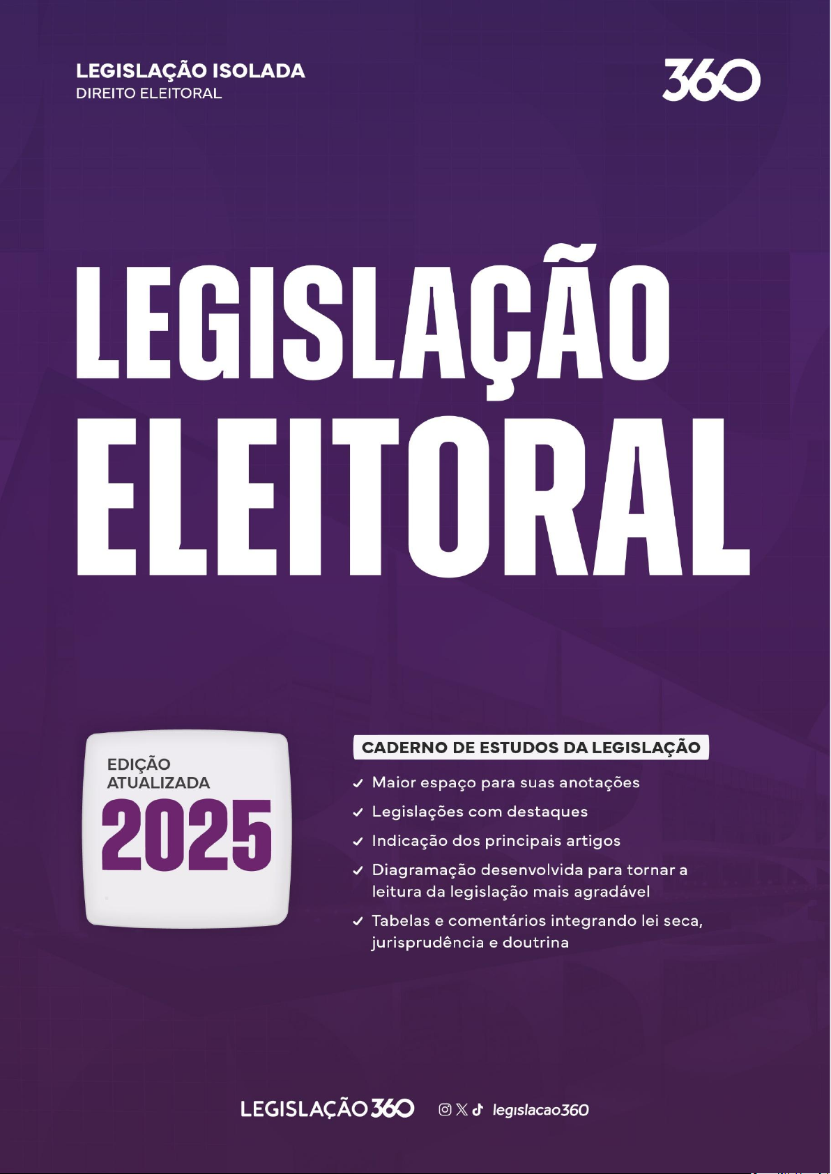 1 2025.1 2 2025.1, 16.01.2025 3 INDICAÇÃO DOS PRINCIPAIS ARTIGOS TABELAS E JURISPRUDÊNCIA REDAÇÃO SIMPLIFICADA LEGISLAÇÃO COM DESTAQUES NAVEGAÇÃO POR MARCADORES Avance no estudo das legislações e organize todas as suas anotações em um só lugar. Criamos este formato de CADERNO DE ESTUDOS em 2018, combinando a letra da lei, jurisprudência, tabelas e o espaço dedicado para anotações que se tornou marca da Legislação 360. Além de todas as demais marcações, destacamos com uma estrela os artigos com maior incidência em provas e que merecem atenção especial. Para aprofundar seus estudos, incluímos a jurisprudência relacionada aos dispositivos e tabelas esquematizando a doutrina. Desenvolvemos uma diagramação especial para as legislações, facilitando muito a sua leitura. Além disso, também simplificamos a redação dos dispositivos, especialmente nos números. NEGRITO › ROXO › LARANJA › CINZA SUBLINHADO › Utilizado para realçar termos importantes. Aplicado para destacar números, incluindo datas, prazos, percentuais e outros valores numéricos. Expressões que denotam negação, ressalva ou exceção. Indica vetos e revogações. Dispositivos cuja eficácia está prejudicada, mas não estão revogados expressamente. Uma ferramenta adicional para leitores digitais. Nossos materiais foram desenvolvidos para garantir uma leitura confortável quando impressos, mas se você prefere ler em dispositivos eletrônicos, conheça esta funcionalidade. Implementamos em todos os nossos conteúdos o recurso de navegação por marcadores, um componente interativo do leitor de PDF (cujo nome pode variar de acordo com o programa utilizado). Nesta ferramenta, títulos, capítulos, seções e artigos das legislações, assim como súmulas e outros textos relevantes de jurisprudência, são organizados na barra de marcadores do leitor de PDF. Isso permite que você localize cada item de forma mais rápida. Além disso, a funcionalidade VOLTAR, presente em alguns leitores de PDF, facilita o retorno ao ponto de leitura onde você parou, sem a necessidade de ficar rolando páginas. ESPAÇO PARA ANOTAÇÕES CINZA TACHADO › 4 GUIA DE ESTUDOS Se você está começando a se preparar para concursos ou busca uma melhor organização e planejamento, este guia será de grande ajuda em sua jornada. Disponibilizamos o conteúdo gratuitamente em nosso site: www.legislacao360.com.br CONTROLE DE LEITURA DAS LEGISLAÇÕES Incluído no Guia de Estudos, o PLANNER METAS DA LEGISLAÇÃO é uma planilha desenvolvida para ajudar você a organizar suas leituras e revisões. Este material é gratuito e está disponível para download em nosso site. No guia você encontrará também sugestões de como utilizar a planilha. Veja algumas das características principais: BIBLIOGRAFIA PARA CONCURSOS PÚBLICOS E OAB ORIENTAÇÕES PARA ESTUDAR JURISPRUDÊNCIA COMO OTIMIZAR A RESOLUÇÃO DE QUESTÕES MODELO DE CICLO DE ESTUDOS PLANNER PARA A LEITURA DE INFORMATIVOS (STF E STJ) PLANNER PARA O ESTUDO DAS LEGISLAÇÕES Desenvolvimento editorial e todos os direitos reservados a 360 EDITORA JURÍDICA LTDA. Material protegido por direitos autorais. É proibida a reprodução ou distribuição deste material, ainda que sem fins lucrativos, sem a expressa autorização da 360 Editora Jurídica Ltda. Lei 9.610/98 – Lei de Direitos Autorais. www.legislacao360.com.br – editora@360.ltda – CNPJ 51.278.476/0001-20 5 SUMÁRIO ÍNDICE DAS TABELAS ................................................................................................................................................................................... 6 Lei 4.737/65 - Código Eleitoral ................................................................................................................................................................ 9 Lei 9.504/97 - Lei das Eleições ............................................................................................................................................................. 134 Lei 9.096/95 - Lei dos Partidos Políticos ........................................................................................................................................ 194 LC 64/90 - Lei de Inelegibilidade ....................................................................................................................................................... 219 Lei 9.709/98 - Lei da Soberania Popular ......................................................................................................................................... 237 Resolução-TSE 23.659/21 - Gestão do Cadastro Eleitoral........................................................................................................ 240 Lei 14.192/21 - Lei da Violência Política contra a Mulher ...................................................................................................... 276 Lei 6.091/74 - Transporte nas Eleições............................................................................................................................................ 278 Lei 6.996/82 - Utilização de Processamento Eletrônico de Dados nos Serviços Eleitorais ..................................... 283 6 ÍNDICE DAS TABELAS Lei 4.737/65 - Código Eleitoral ................................................................................................................. 9 Fontes do Direito Eleitoral ........................................................................................................................ 10 Princípios fundamentais do Direito Eleitoral ..................................................................................... 10 Democracia ...................................................................................................................................................... 11 Direitos Políticos na CF/88 ....................................................................................