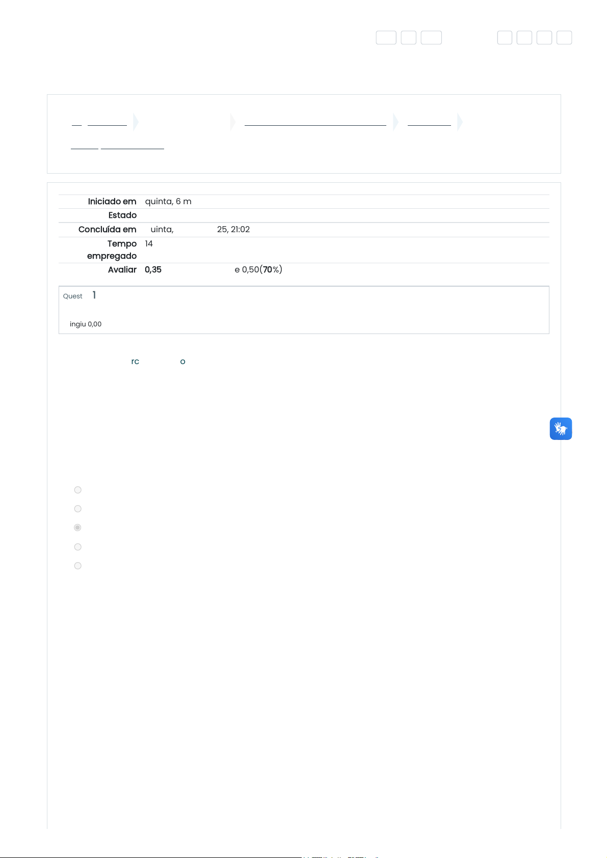 Página inicial Minhas disciplinas 2025/1 - TEORIA DA CONTABILIDADE UNIDADE III Avaliação - Unidade III Iniciado em quinta, 6 mar 2025, 19:34 Estado Finalizada Concluída em quinta, 20 mar 2025, 21:02 Tempo empregado 14 dias 1 hora Avaliar 0,35 de um máximo de 0,50(70%) Questão 1 Incorreto Atingiu 0,00 de 0,05 “O Ativo Não Circulante é composto de Realizável a Longo Prazo, Investimentos, Imobilizado e Intangível. Antes da MP nº 449/08, tínhamos a Ativo Permanente, que era dividido em quatro grupos: Investimentos, Imobilizado, Intangível e Diferido. Assim, após a referida MP desapareceram o Termo Permanente e o subgrupo Diferido” (IUDÍCIBUS; MARION, 2016). O excerto trata de uma mudança na composição dos ativos, conforme a lei. Diante dessas informações e no conteúdo estudado no livro-texto, suponha que uma empresa comprou um imóvel por R$ 1.000.000,00 para valorização. No momento da decisão para adquirir o bem, a administração considerou a oportunidade do negócio. O profissional da contabilidade deverá fazer o registro contábil da compra do imóvel que será classificado como Ativo: a. Não Circulante – Investimento. b. Não Circulante – Investimento em coligadas. c. Não Circulante – Imobilizado. d. Não Circulante – Realizável a Longo Prazo. e. Não Circulante – Intangível. A resposta correta é: Não Circulante – Investimento. Tamanho da fonte A- A A+ Cor do site R A A A 20/03/2025, 21:07 Avaliação - Unidade III: Revisão da tentativa https://ambienteonline.uninga.br/mod/quiz/review.php?attempt=3469356&cmid=872807 1/9 https://ambienteonline.uninga.br/ https://ambienteonline.uninga.br/course/view.php?id=30378 https://ambienteonline.uninga.br/course/view.php?id=30378§ion=4 https://ambienteonline.uninga.br/mod/quiz/view.php?id=872807 Questão 2 Correto Atingiu 0,05 de 0,05 Questão 3 Correto Atingiu 0,05 de 0,05 Leia atentamente o excerto a seguir: “O Comitê de Pronunciamentos Contábeis (CPC) foi criado através da Resolução CFC nº 1.055/05, principalmente, em função das seguintes necessidades de: convergência internacional das normas contábeis (redução de custo de elaboração de relatórios contábeis, redução de riscos e custo nas análises e decisões, redução de custo de capital); centralização na emissão de normas dessa natureza (no Brasil, diversas entidades o fazem); representação e processos democráticos na produção dessas informações (produtores da informação contábil, auditor, usuário, intermediário, academia, governo)” (PINHO, 2017). O excerto trata da criação do CPC, visando atender às diversas necessidades relacionadas às normas contábeis, conforme estudado no livro-texto da disciplina. Diante disso, é correto afirmar que sua finalidade básica é: a. Orientar os profissionais contábeis quanto às questões jurídicas. b. Ser um elemento norteador para órgãos reguladores contábeis. c. Ser um instrumento controlador de custos para a empresa. d. Ser uma norma disciplinadora das ações dos profissionais contábeis. e. Auxiliar as empresas a lidarem com os seus concorrentes. A resposta correta é: Ser um elemento norteador para órgãos reguladores contábeis. . Leia atentamente o excerto a seguir: “As conceituações dos elementos do patrimônio líquido de uma entidade precisam atentar para: a) a natureza do que está sendo definido; e b) a sua mensuração” (IUDÍCIBUS; MARION; FARIA, 2017). Vimos no livro-texto da disciplina que, entre os elementos que compõem o patrimônio de uma organização, estão os bens. Os bens que uma empresa possui são representados pelas contas de: a. Passivo. b. Compensação. c. Patrimônio Líquido. d. Resultado. e. Ativo. A resposta correta é: Ativo. Tamanho da fonte A- A A+ Cor do site R A A A 20/03/2025, 21:07 Avaliação - Unidade III: Revisão da tentativa https://ambienteonline.uninga.br/mod/quiz/review.php?attempt=3469356&cmid=872807 2/9 Questão 4 Correto Atingiu 0,05 de 0,05 “O conteúdo da Estrutura Conceitual se equipara aos princípios fundamentais de uma instituição (Christensen, 2010); assim, a demanda por regulamentação da estrutura conceitual e da elaboração dos relatórios financeiros torna-se necessária. Conhecer e entender a estrutura conceitual pode, então, refletir na aplicação desses conceitos no mercado de trabalho, auxiliando e melhorando a qualidade das demonstrações a serem elaboradas” (COSTA; NUNES; MARQUES, 2014). De acordo com o livro-texto da disciplina, a Estrutura Conceitual Básica das demonstrações contábeis é abordada no CPC 00. Diante disso, analise as afirmativas a seguir e a relação proposta entre elas: I. A Estrutura Conceitual das demonstrações contábeis segue os princípios da International Accounting Standard Board (IASB). Porque: II. A Estrutura Conceitual tem como finalidade ser um guia para a elaboração das Normas Internacionais de Contabilidade e para os pronunciamentos dos órgãos internacionais. Agora, assinale a alternativa correta: a. A asserção I é uma proposição falsa, e a II é uma proposição verdadeira. b. As asserções I e II são proposições falsas. c. A asserção I é uma proposição verdadeira, e a II é uma proposição falsa. d. As asserções I e II são proposições verdadeiras, mas a II não é uma justificativa correta da I. e. As asserções I e II são proposições verdadeiras, e a II é uma justificativa correta da I. A resposta correta é: As asserções I e II são proposições verdadeiras, e a II é uma justificativa correta da I. Tamanho da fonte A- A A+ Cor do site R A A A 20/03/2025, 21:07 Avaliação - Unidade III: Revisão da tentativa https://ambienteonline.uninga.br/mod/quiz/review.php?attempt=3469356&cmid=872807 3/9 Questão 5 Incorreto Atingiu 0,00 de 0,05 Leia atentamente o excerto a seguir: “É fato que as informações têm sido geradas e distribuídas numa velocidade sempre e cada vez maior, portanto, ter um sistema de