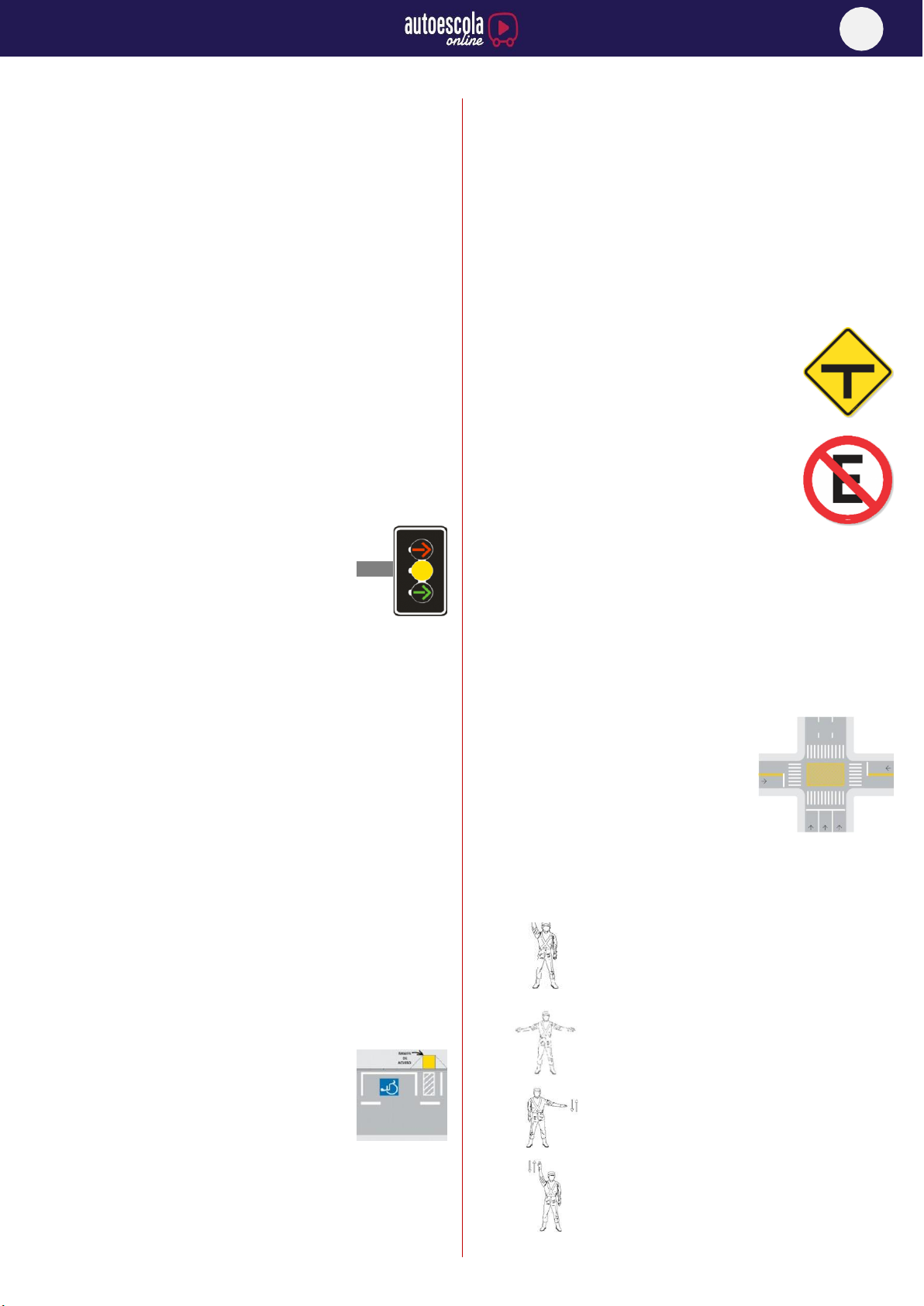 03 SINALIZAÇÃO DE TRÂNSITO 01) Numa via cujas faixas de tráfego sejam separadas por linhas brancas, podemos dizer que: A) É uma via de mão única. B) É uma via de mão dupla. C) É uma estrada. D) É uma ciclovia. 02) As placas que têm a função de educar condutores e pedestres quanto ao seu comportamento no trânsito, são as: A) De atrativos turísticos. B) Educativas. C) De advertência. D) De regulamentação. 03) As mensagens expressas nas placas de sinalização de advertência são de caráter de: A) Ordem. B) Informação. C) Alerta. D) Educação. 04) O sinal semafórico, identificado na imagem, indica: A) Controle ou faixa reversível. B) Direção livre. C) Direção controlada. D) Direção proibida. 05) A sinalização de trânsito é feita nas vias públicas através de: A) Placas, gestos e marcos. B) Placas, advertência, indicações luminosas. C) Placas, manobras, indicações luminosas, gestos e sinais sonoros. D) Placas, marcações, dispositivos auxiliares, indicações luminosas, gestos e sinais sonoros. 06) As cores das luzes utilizadas para controle de fluxo de pedestres são: A) Vermelha, amarela e verde. B) Vermelha e amarela. C) Verde, vermelha intermitente e vermelha. D) Amarela e verde. 07) As placas de sinalização, quanto à sua função classificam-se em: A) De regulamentação, advertência e indicação. B) De regulamentação, semafórica e indicação. C) De regulamentação, semafórica e advertência. D) De serviços auxiliares, advertência e faixa de proteção para pedestres. 08) O símbolo, inscrito no pavimento, e associado à sinalização vertical, representado por uma cadeira de rodas demarca: A) Local proibido de parada de veículos conduzidos por deficientes físicos. B) Local de estacionamento de veículos conduzidos por deficientes físicos ou que os transporte. C) Local de embarque e desembarque de deficientes físicos. D) Local de trânsito de deficientes físicos. 09) A sinalização terá a seguinte ordem de prevalência, em ordem: A) As indicações do semáforo sobre os demais sinais; as indicações dos sinais sobre as demais normas de trânsito; as ordens do agente de trânsito sobre as normas de circulação e outros sinais. B) As ordens do agente de trânsito sobre as normas de circulação e outros sinais; as indicações dos sinais sobre as demais normas de trânsito. C) Não existe ordem de prevalência. D) As ordens do agente de trânsito sobre as normas de circulação e outros sinais; as indicações do semáforo sobre os demais sinais; as indicações dos sinais sobre as demais normas de trânsito. 10) A placa A-8 adverte que: A) Via lateral à esquerda. B) Entroncamento oblíquo à direita. C) Interseção em “T”. D) Bifurcação em “Y”. 11) A placa R-6a regulamenta: A) Proibido parar e estacionar. B) Proibido estacionar. C) Estacionamento regulamentado. D) Proibido parar. 12) Ao encontrar um trecho de via com sentido único e mais de uma faixa de circulação, você saberá que a mudança de faixa será proibida quando a sinalização horizontal for: A) Linha contínua simples amarela. B) Linha simples seccionada branca. C) Linha dupla seccionada amarela. D) Linha simples contínua branca. 13) A marcação de área de conflito, identificada na imagem, significa que o condutor: A) Não pode circular com seu veículo, pois é área exclusiva de pedestre. B) Não deve parar e nem estacionar o veículo. C) Pode estacionar sua motocicleta. D) Deve parar e estacionar o veículo. 14) A ordem do Agente da Autoridade de Trânsito de parada para todos os veículos que venham de direções que cortem ortogonalmente a direção indicada pelos braços estendidos, qualquer que seja o sentido de seu deslocamento, é: A) B) C) D) 03 15) A placa R-1 regulamenta: A) Semáforo à frente. B) Parada obrigatória à frente. C) Dê a preferência. D) Parada Obrigatória. 16) A placa A-10a adverte a existência de: A) Via lateral à esquerda. B) Via lateral à direita. C) Entroncamento oblíquo à esquerda. D) Curva à esquerda. 17) A placa TIT-10 indica: A) Festas populares. B) Rodeio. C) Teatro. D) Convenções. 24) Diante da placa SAU-14 você entende que é uma área: A) Permitida para camping. B) Com aeroporto nas proximidades. C) Com Igreja do patrimônio histórico. D) De proteção para indígenas. 25) É finalidade do dispositivo ilustrado: A) Advertir sobre situação inesperada à frente. B) Transmitir mensagens educativas. C) Regulamentar a velocidade em função do volume de veículos. D) Todas as afirmativas acima estão corretas. 26) Qual o significado da sinalização ao lado? A) Sinalização de alerta. B) Marcadores de perigo. C) Marcadores de alinhamento. D) Dispositivos de canalização. 18) A placa de número A-22 indica: A) Ponte móvel. B) Estreitamento de pista à direita. C) Ponte estreita. D) Estreitamento de pista ao centro. 19) A placa R-17 regulamenta: A) Carga máxima permitida. B) Peso máximo permitido por eixo. C) Comprimento máximo permitido. D) Largura máxima permitida por eixo. 20) A sinalização semafórica de advertência que tem a função de advertir da existência de obstáculo ou situação perigosa compõe- se de: A) Uma verde e uma vermelha. B) Uma ou mais luzes de cor amarela. C) Uma ou duas de cor vermelha. D) Uma ou duas de cor verde. 21) As linhas transversais, identificadas na imagem, são chamadas de: A) Linhas de Retenção. B) Linhas de Dê a Preferência. C) Linhas de Estímulo à Redução de Velocidade. D) Linhas de Canalização. 22) São aplicados junto a obstáculos, como viadutos e pontes: A) Dispositivos de canalização. B) Sinalização de alerta. C) Marcadores de obstáculo e perigo. D) Todas acima. 23) As linhas seccionadas ou contínuas, as faixas para pedestres, os sinais e as palavras inscritas no solo, são marcas que caracterizam a sinalização: A) Vertical. B) Horizontal. C) Por gestos. D) Por barreiras. 27) Identifique o significado do gesto do condutor