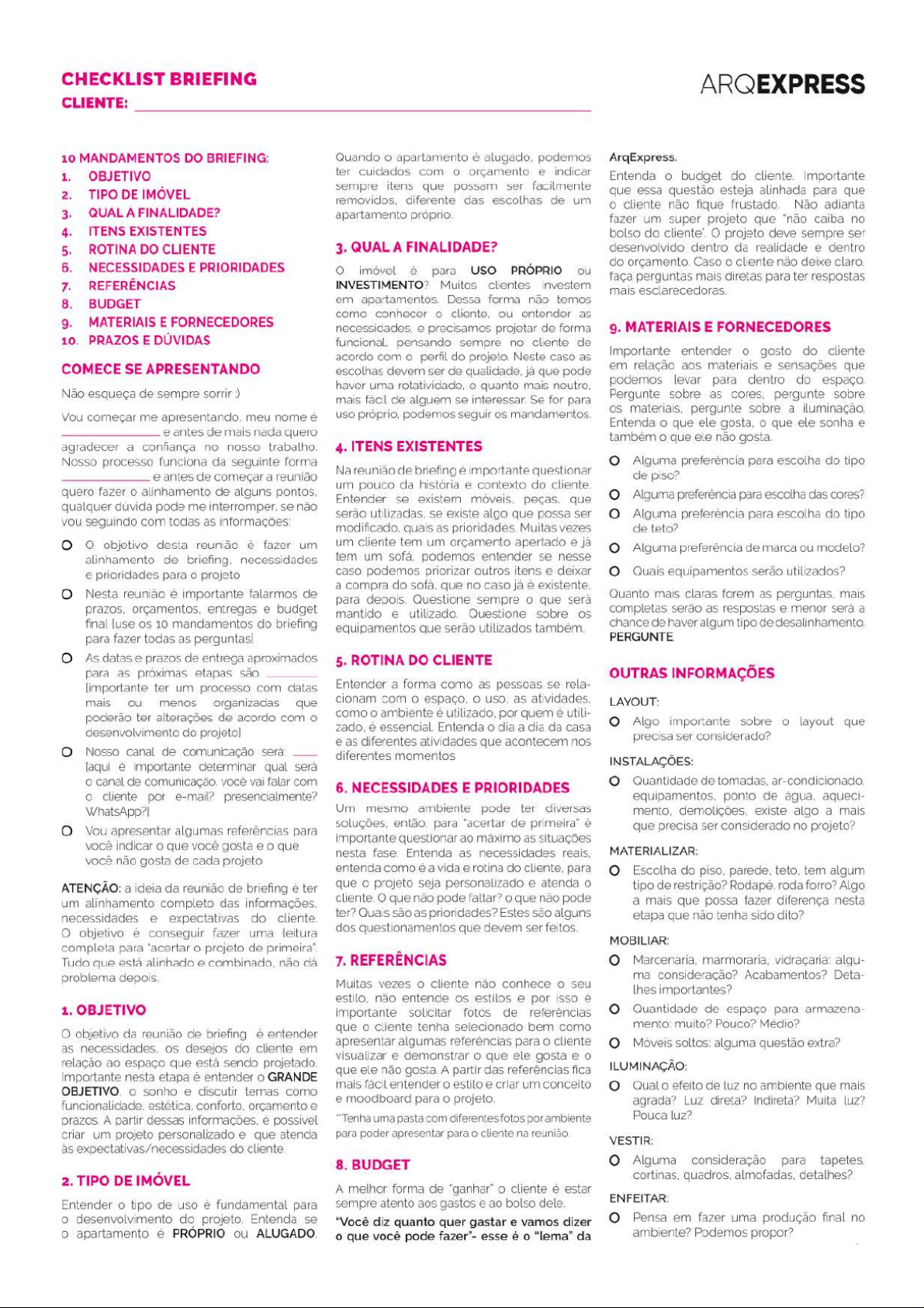 CHECKLIST BRIEFING ARQEXPRESS CLIENTE: 10 MANDAMENTOS DO Quando o apartamento é podemos ArqExpress. 1. OBJETIVO ter cuidados com orçamento e indicar Entenda budget do cliente. Importante 2. TIPO DE IMÓVEL sempre itens que possam ser facilmente que essa questão esteja alinhada para que removidos, diferente das escolhas de um cliente não frustado. Não adianta 3. QUAL A FINALIDADE? apartamento próprio. fazer um super projeto que "não caiba no 4. ITENS EXISTENTES bolso do projeto deve sempre ser 5. ROTINA DO CLIENTE 3. QUAL A FINALIDADE? desenvolvido dentro da realidade e dentro 6. NECESSIDADES E PRIORIDADES do Caso cliente não deixe imóvel é para PRÓPRIO ou 7. REFERÊNCIAS faça perguntas mais diretas para ter respostas INVESTIMENTO? Muitos clientes investem mais 8. BUDGET em Dessa forma não temos como conhecer o cliente, ou entender as 9. MATERIAIS E FORNECEDORES necessidades e precisamos projetar de forma 9. MATERIAIS E FORNECEDORES 10. PRAZOS E DÚVIDAS pensando sempre no cliente de acordo com perfil do projeto. Neste caso as Importante entender gosto do cliente COMECE SE APRESENTANDO escolhas devem ser de qualidade, que pode em relação aos materiais e sensações que haver uma quanto mais noutro, podemos levar para dentro do espaço. Não esqueça de sempre sorrir mais de se interessar. Se for para Pergunte sobre as pergunte sobre uso próprio, podemos seguir os mandamentos. materiais, pergunte sobre a Vou começar me meu nome Entenda que ele gosta, o que ele sonha e e antes de mais nada quero também o que ele não gosta. agradecer a confiança no nosso 4. ITENS EXISTENTES Nosso processo funciona da seguinte forma Alguma preferência para escolha do tipo e antes de começar a reunião Na reunião de briefing é importante questionar de piso? um pouco da história e contexto do quero fazer alinhamento de alguns pontos, Entender se existem que Alguma preferência para escolha das cores? qualquer dúvida pode me se não serão se existe algo que possa ser Alguma para escolha do tipo vou seguindo com todas as informações: quais as prioridades Muitas vezes de teto? objetivo desta reunião é fazer um um cliente tem um orçamento apertado e Alguma preferência de marca ou modelo? alinhamento de necessidades tem um podemos entender se nesse e prioridades para projeto caso podemos priorizar outros itens e deixar Quais equipamentos serão utilizados? a compra do que no caso já existente. Nesta reunião e importante falarmos de para Questione sempre o que será Quanto mais claras forem as perguntas, mais prazos, orçamentos, entregas e budget mantido e Questione sobre completas serão as respostas e menor será a final luse os 10 mandamentos do briefing equipamentos que serão utilizados chance de haver algum tipo de desalinhamento. para fazer todas as PERGUNTE As datas e prazos de entrega aproximados 5. ROTINA DO CLIENTE para as próximas etapas são OUTRAS INFORMAÇÕES [importante ter um processo com datas Entender a forma como as pessoas se rela- mais ou menos organizadas que cionam com espaço. as LAYOUT: poderão ter alterações de acordo com como ambiente é utilizado, por quem é utili- zado, Entenda dia a dia da casa Algo importante sobre layout que desenvolvimento do e as diferentes atividades que acontecem nos precisa ser considerado? Nosso canal de comunicação será diferentes momentos é importante determinar qual sera INSTALAÇÕES: canal de você vai falar com Quantidade de tomadas, ar-condicionado 6. NECESSIDADES E PRIORIDADES cliente por e-mail? presencialmente? ponto de água. aqueci- Um mesmo ambiente pode ter diversas mento, demolições, existe algo a mais soluções, para "acertar de é Vou apresentar algumas referências para que precisa ser considerado no projeto? importante questionar ao máximo as situações você indicar que você gosta e que nesta Entenda as necessidades reais, MATERIALIZAR: você não gosta de cada projeto entenda como é a vida e rotina do cliente, para Escolha do parede, tem algum ATENÇÃO: a ideia da reunião de briefing é ter que projeto seja personalizado e atenda tipo de restrição? roda forro? Algo um alinhamento completo das que não pode faltar? que não pode a mais que possa fazer diferença nesta necessidades e expectativas do cliente. ter? Quais são as prioridades? Estes são alguns etapa que não tenha sido dito? objetivo é conseguir fazer uma leitura dos questionamentos que devem ser MOBILIAR: completa para projeto de primeira". Tudo que está alinhado e combinado, não dá 7. REFERÊNCIAS Marcenaria, marmoraria, algu- problema ma consideração? Acabamentos? Deta- Muitas vezes cliente não conhece seu lhes importantes? não entende os estilos e por isso é 1. OBJETIVO importante solicitar fotos de referências Quantidade de espaço para armazena- que cliente tenha selecionado bem como mento: muito? Pouco? Médio? objetivo da reunião de briefing entender apresentar algumas referências para cliente as os desejos do cliente em Móveis soltos: alguma questão extra? relação ao espaço que está sendo visualizar e demonstrar que ele gosta e que ele não A partir das referências fica ILUMINAÇÃO: Importante nesta etapa é entender GRANDE mais fácil entender e criar um conceito sonho e discutir temas como Qual o efeito de luz no ambiente que mais orçamento e e moodboard para agrada? Luz direta? Indireta? Muita luz? A partir dessas e possivel "Tenha uma pasta com diferentes fotos por ambiente Pouca luz? criar um projeto personalizado e que atenda para poder apresentar para cliente na VESTIR: às do cliente. 8. BUDGET Alguma consideração para tapetes 2. TIPO DE IMÓVEL almofadas, detalhes? A melhor forma de "ganhar" o cliente é estar ENFEITAR: Entender tipo de uso fundamental para sempre atento aos gastos e ao bolso dele. desenvolvimento do projeto. Entenda se "Você diz quanto quer gastar e vamos dizer Pensa em fazer uma produção final no apartamento é ou que você pode fazer"- esse é "lema" da ambient