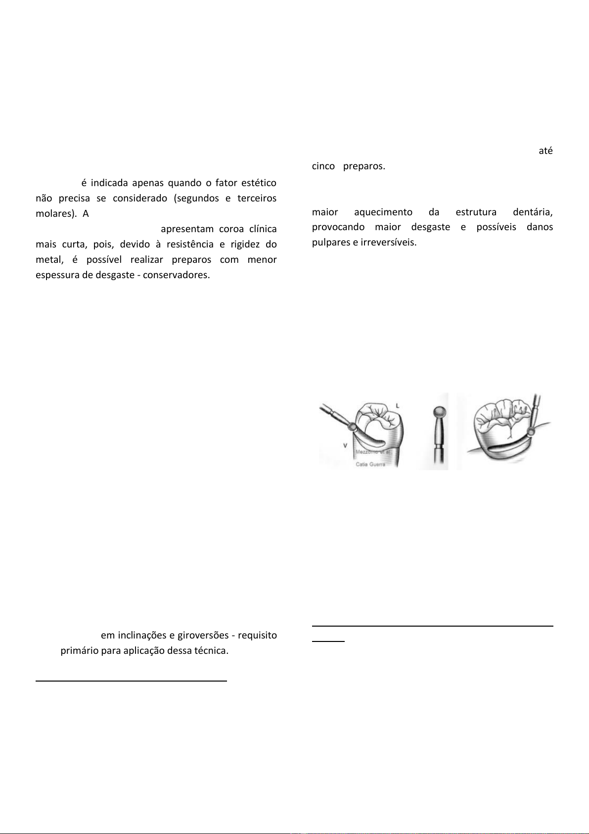 Lívia Tavares |Prótese Fixa AULA 4 Preparo para Coroa Total Metálica A coroa total metálica, por não apresentar uma estética favorável e pela possibilidade de manchamento da estrutura dentária e da porção gengival, vem sendo cada vez menos utilizada. Portanto, é indicada apenas quando o fator estético não precisa se considerado (segundos e terceiros molares). A coroa total metálica pode ser indicada também para dentes que apresentam coroa clínica mais curta, pois, devido à resistência e rigidez do metal, é possível realizar preparos com menor espessura de desgaste - conservadores. Técnica da Silhueta - Essa técnica permite ao operador uma noção real da quantidade do dente desgastado, pois, executa-se inicialmente o preparo da metade do dente, preservando-se a outra metade para avaliação. Essa técnica pode ser utilizada em dentes anteriores e posteriores, no preparo de coroa total metálica e também coroa metal free. A partir do conhecimento do diâmetro ou da parte ativa das pontas diamantadas, é possível quantificar o desgaste. Matrizes de silicone - são confeccionadas quando o dente ainda está hígido (antes de se realizar o preparo), a partir da matriz, realiza-se um molde da área do dente. O molde deve ser reposicionado no dente durante o seu desgaste, para saber a quantidade de desgaste que está sendo efetuado. Normalmente, a técnica da silhueta é preconizada para ser realizada em dentes que estejam bem posicionados do ponto de vista oclusal, sem inclinações e giroversões - requisito primário para aplicação dessa técnica. 1º Passo - Sulco de Orientação Cervical: A função básica de iniciar o preparo pela confecção desse sulco é estabelecer, já no início do processo, o término cervical - determina o limite entre o dente e a coroa. Ponta n° 1014 - a partir da utilização da ponta diamantada esférica (diâmetro de 1,4 mm), o sulco é realizado nas faces vestibular e lingual/palatina até chegar próximo ao contato do dente vizinho. Na ausência de dentes vizinhos, o sulco também deverá estender-se para as faces proximais. Atenção! Para que haja um poder de corte eficiente, os diamantes presentes na ponta ativa da broca precisam estar preservados. Para que isso ocorra, a mesma broca só deve ser utilizada, no máximo, até cinco preparos. Se a ponta diamantada já não apresenta bom poder de corte, será necessário exercer maior pressão sobre ela, o que vai favorecer maior aquecimento da estrutura dentária, provocando maior desgaste e possíveis danos pulpares e irreversíveis. A confecção do sulco de orientação cervical deve ser realizada utilizando metade da ponta ativa da broca (aproximadamente 0,6 mm), para que o desgaste seja conservador. Se o dente apresenta dentes adjacentes que estejam em contato com ele, o preparo deve se restringir às faces vestibular e lingual/palatina. Se não houver dentes adjacentes, o sulco deve ser estendido às faces proximais. O sulco de orientação cervical deve ser confeccionado tanto em dentes superiores, quanto em dentes inferiores. Durante a confecção, a broca deve estar inclinada em uma angulação de 45° em relação ao longo eixo do dente. Além disso, apenas metade da ponta ativa deve ser inserida na confecção do sulco, para que ele tenha aproximadamente 0,6 mm de profundidade. 2º Passo - Sulco de Orientação Vestibular, Lingual e Oclusal: Na confecção desses sulcos nas paredes axiais, deve-se observar a diferença entre os planos inclinados para o elemento dentário superior e inferior. Pontas n° 3216 ou 2215 - pontas de extremidade ogival e profundidade de 1,2 mm (dependendo da situação, apenas metade do diâmetro da ponta deve ser utilizada - 0,6 mm). Lívia Tavares |Prótese Fixa Sulcos das Paredes Axiais - São confeccionados três sulcos nas paredes axiais (mesial, central e distal), que devem ser paralelos em relação ao longo eixo do dente e eqüidistantes entre si. Parede Vestibular: Dentes Inferiores: O desgaste ocorre em dois planos - 1,2 mm (médio-oclusal) e 0,6 mm (médio-cervical). Dentes Superiores: 0,6 mm (metade da ponta ativa). Parede Lingual: Dentes Inferiores: 0,6 mm. Parede Palatina: Dentes Superiores: 1,2 mm (médio-oclusal) e 0,6 mm (médio-cervical). Atenção! As cúspides de contenção cêntrica ou cúspides de trabalho (cúspides vestibulares dos dentes inferiores e palatinas dos dentes superiores) concentram maiores quantidades de cargas mastigatórias. Enquanto as cúspides de balanceio (cúspides vestibulares dos dentes superiores e linguais dos dentes inferiores) concentram menores quantidades de cargas mastigatórias. Sulco Oclusal - Na confecção desse sulco existe a possibilidade de modificar a técnica da silhueta. Podem-se fazer três orifícios com a broca esférica no sulco principal (porção mesial, central e distal) e depois unir os três orifícios em forma de canaleta. Os sulcos da superfície oclusal também são em número de três (mesial, central e distal) e o desgaste é medido através da profundidade da broca no elemento dentário. Dentes Inferiores e Superiores: 1,2 mm (toda profundidade da broca). OBS: Os sulcos da face oclusal devem apresentar inclinações de acordo com as vertentes das cúspides. 3º Passo - União dos Sulcos de Orientação: Seguindo a técnica da silhueta, a união dos sulcos é feita primeiramente na metade do dente - metade vestibular + metade lingual + metade oclusal + 1 proximal). Pontas n° 3216 ou 2215 - pontas de extremidade ogival, que devem ser utilizadas mantendo o paralelismo. Através dessa técnica, é possível quantificar o nível de desgaste e avaliar a possível realização de um sobre ou sub-desgaste. A união dos sulcos deve manter a mesma inclinação dos sulcos que foram previamente confeccionados, para facilitar a futura retenção do material restaurador. OBS: Ao realizar a união dos sulcos, a broca não deve ser posicionada no mesmo sentido em que foi realizado