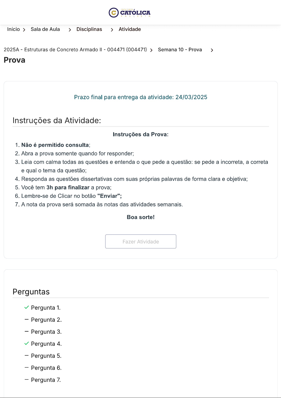 FACULDADE C CATOLICA Início > Sala de Aula > Disciplinas > Atividade 2025A - Estruturas de Concreto Armado - 004471 (004471) > Semana 10 - Prova > Prova Prazo final para entrega da atividade: 24/03/2025 Instruções da Atividade: Instruções da Prova: 1. Não é permitido consulta; 2. Abra a prova somente quando for responder; 3. Leia com calma todas as questões e entenda o que pede a questão: se pede a incorreta, a correta e qual o tema da questão; 4. Responda as questões dissertativas com suas próprias palavras de forma clara e objetiva; 5. Você tem 3h para finalizar a prova; 6. Lembre-se de Clicar no botão "Enviar"; 7. A nota da prova será somada às notas das atividades semanais. Boa sorte! Fazer Atividade Perguntas Pergunta 1. - Pergunta 2. - Pergunta 3. Pergunta 4. Pergunta 5. - Pergunta 6. - Pergunta 7.CATOLICA U L - Pergunta 10. Pergunta 11. Pergunta 12. Esta atividade têm tempo limite de 3 horas Restam 2 horas e 1 minuto Pergunta 1. pontos: 0,200 O projetista precisa ter em mente que o projeto de um sistema de protensao é complicado, pois tem diversas variáveis envolvidas, de modo que o melhor projeto é obtido de forma iterativa. Podem ser descritos três diferentes procedimentos para o projeto de peças protendidas à flexão, são eles Múltipla Escolha: A. Temos a determinação da seção transversal, seguida pela determinação das forças de protensão e o perfil da armadura ativa, ao final podemos realizar modificações de forma a atender as tensões atuantes. B. Para os problemas de verificação, é necessário conhecer somente os carregamentos atuantes e as tensões admissíveis, pois com esses fatores podemos verificar o C. Para a condição de grandes vãos, a peça mais eficiente pode resultar tomando como base as tensões admissíveis do concreto na escolha da seção transversal, fazendo as tensões atuantes serem maiores que as tensões admissíveis. D. Podemos adotar a seção transversal e calcular o valor de excentricidade da força de protensão, considerando os carregamentos atuantes ou fase mais importante, verificando na sequência as tensões atuantes no concreto para diferentes estágios de carregamentos, fazendo as tensões atuantes serem maiores ou iguais às tensões admissíveis.FACULDADE CATOLICA tensões atuantes no concreto para diferentes estágios de carregamentos, fazendo as tensões atuantes serem menores ou iguais às tensões admissíveis. Pergunta 2. pontos: 0,200 No dimensionamento de muro de arrimo deve-se levar em consideração as dimensões, ou seja, a realização do pré-dimensionamento é fundamental para início das verificações técnicas e posteriormente a realização do dimensionamento. De tal forma, determine as armaduras principais, levando em consideração o diagrama de momento fletor (característico) da figura baixo. Concreto (C25), aço CA50, cobrimento de 3 cm. 20 cm o o 100 1,9 200 cm 11,1 kN.m/m 34,3 35cm 30 cm Múltipla Escolha: As(min.) = H 3:As : 3 H 3,2:As : 9,01 B. As(min.) = 3 2 H 3:As = 6,77 3FACULDADE CATOLICA Pergunta 3. pontos: 0,200 A sapata tem a função de distribuir a carga de parte de uma edificação ao solo, de forma que, quanto mais carga sobre a mesma maior será a transferência entre sapata-solo necessitando assim verificar as dimensões em planta da sapata. Sabendo da importância da análise das dimensões em planta da sapata, pergunta-se: Qual o motivo de fazer balanços iguais nas sapatas isoladas? Múltipla Escolha: A. A sapata com balanços iguais (cA = cB), gera uma sapata com maior proporcionalidade entre os lados (A) e (B), bem como, forças de tração iguais em valores, não é indicada por ser deseconomia. B. A sapata com balanços iguais (cA cB), gera uma sapata com maior proporcionalidade entre os lados (A) e (B), bem como, forças de tração mais próximas em valores, além de ser indicada pela economia. C. A sapata com balanços iguais (cA = cB), gera uma sapata com maior proporcionalidade entre os lados (A) e (B), bem como, forças de tração iguais em valores, além de ser indicada pela economia. D. A sapata com balanços iguais gera uma sapata com maior proporcionalidade entre os lados (A) e (B), bem como, forças de tração mais próximas em valores, além de ser indicada pela economia. E. A sapata com balanços iguais (cA = cB), gera uma sapata com desproporcionalidade entre os lados (A) e (B), além de ser deseconomia.FACULDADE CATOLICA Dimensionar a área de armadura transversal de uma viga protendida seção I, biapoiada sob flexão, considerando: Composta por estribos verticais; Concreto C35, aço CA-50; Coeficientes de ponderação: = 0,9; Largura da alma bw = 14 cm, altura útil da armadura de protensão dp = 89 cm; Força cortante resistida pela armadura VSw = 75,29 kN. Múltipla Escolha: A. Armadura calculada de 2,88 B. Armadura calculada de 2,15 C. Armadura calculada de 1,15 D. Armadura calculada de 3,26 m. E. Armadura calculada de 1,54 Pergunta 5. pontos: 0,200 Podemos observar que as perdas de protensão estão vinculadas ao concreto protendido e ao aço, e são instantâneas ou dependentes do tempo, considerando a ocorrências de perdas no elemento estrutural, ilustre quais sãos as perdas instantâneas e as que dependentes do tempo. Múltipla Escolha: A. Dentro do grupo das perdas instantâneas, temos: Encurtamento elástico inicial; atrito; Escorregamento na ancoragem. Para o grupo das perdas que dependem do tempo, temos: Retração; Fluência; Relaxação do aço. B.FACULDADE CATOLICA C. Dentro do grupo das perdas instantâneas, temos: Encurtamento elástico inicial; atrito; Escorregamento na ancoragem. Para o grupo das perdas que dependem do tempo, temos: Retração; Fluência; Relaxação do aço; Encurtamento elástico final. D. Dentro do grupo das perdas instantâneas, temos: Encurtamento elástico inicial; Fluência; atrito; Escorregamento na ancoragem. Para o grupo das perdas que dependem do tempo, temos: Retração; Relaxação do aço