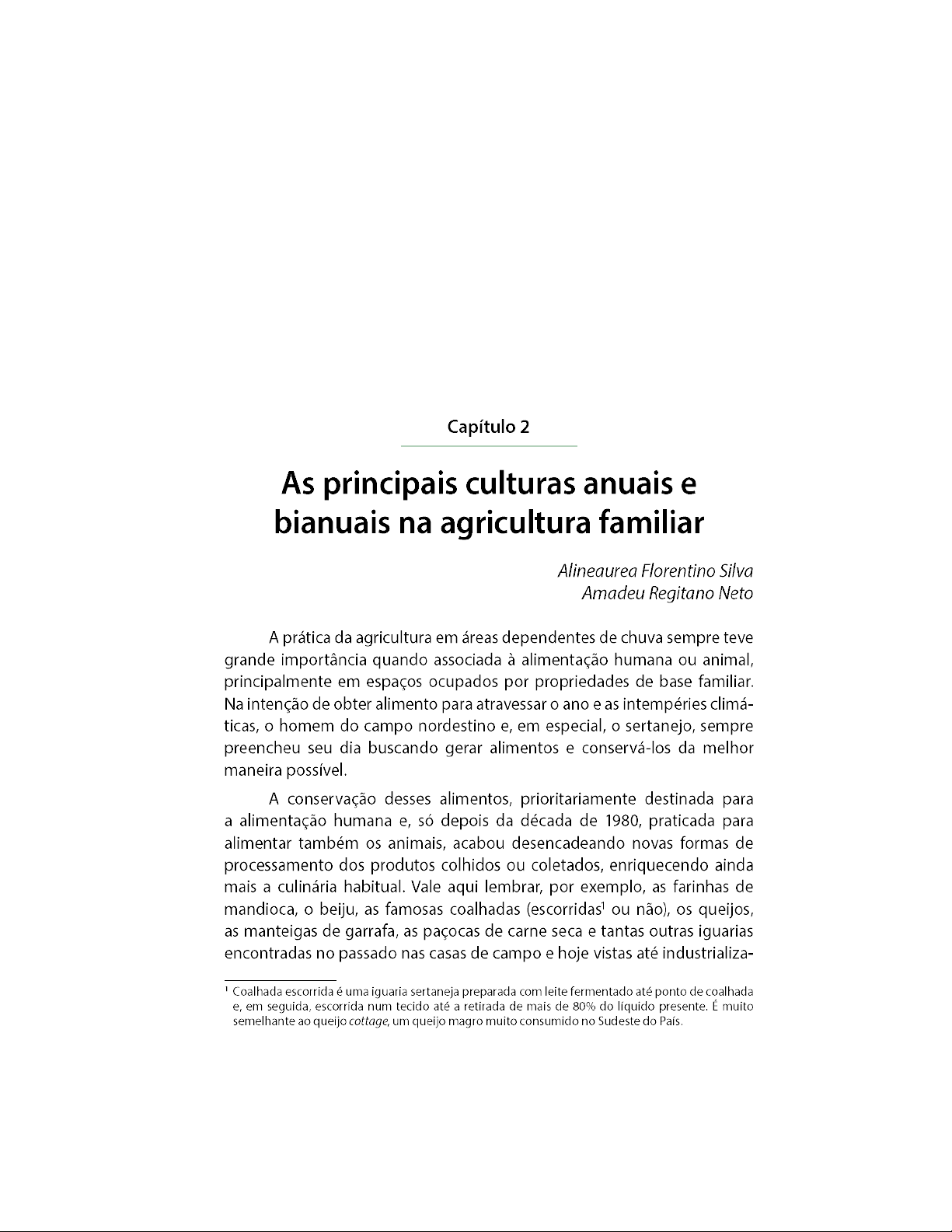Capítulo 2 As principais culturas anuais e bianuais na agricultura familiar Alineaurea Florentino Silva Amadeu Regitano Neto A prática da agricultura em áreas dependentes de chuva sempre teve grande importância quando associada à alimentação humana ou animal, principalmente em espaços ocupados por propriedades de base familiar. Na intenção de obter alimento para atravessar ano e as intempéries climá- ticas, homem do campo nordestino e, em especial, sertanejo, sempre preencheu seu dia buscando gerar alimentos e conservá-los da melhor maneira possível. A conservação desses alimentos, prioritariamente destinada para a alimentação humana e, só depois da década de 1980, praticada para alimentar também os animais, acabou desencadeando novas formas de processamento dos produtos colhidos ou coletados, enriquecendo ainda mais a culinária habitual. Vale aqui lembrar, por exemplo, as farinhas de mandioca, beiju, as famosas coalhadas ou não), os queijos, as manteigas de garrafa, as paçocas de carne seca e tantas outras iguarias encontradas no passado nas casas de campo e hoje vistas até industrializa- 1 Coalhada escorrida é uma iguaria sertaneja preparada com leite fermentado até ponto de coalhada e, em seguida, escorrida num tecido até a retirada de mais de 80% do líquido presente. É muito semelhante ao queijo cottage um queijo magro muito consumido no Sudeste do46 Agricultura familiar dependente de no Semiárido das, transformadas em mercadoria no atual sistema econômico brasileiro, ou inseridas ainda timidamente nos ambientes caracterizados por uma gastronomia gourmet. As principais culturas historicamente cultivadas nas áreas dependen- tes de chuva são, sem dúvida, feijão (Phaseolus vulgaris), (Manihot esculenta Crantz), milho (Zea mays), (Saccharum officinarum) (em áreas restritas a baixios, espaços úmidos ou em barragens neas), amendoim (Arachis hypogaea), sorgo (Sorghum bicolor) e algodão (Gossypium hirsutum L.). Essas espécies normalmente ocupam a maior parte das terras agricultáveis nas áreas dependentes de chuva, variando sua dimensão em área de acordo com a disponibilidade de sementes, a necessidade do produto, o valor econômico vigente ou mesmo a vocação do agricultor. Outras espécies, como a fava (Phaseolus lunatus) e inhame (Dioscorea sp.), são historicamente cultivadas em áreas do Semiárido brasi- leiro mais úmidas, próximas à Zona da Mata, ou mesmo no Agreste, em espaços de solo que provê uma condição melhor para o desenvolvimento dessas espécies. A fava, por exemplo, é plantada, muitas vezes, junto com milho, que, ao ser colhido, serve de tutor para essa planta. Ainda que de forma discreta, técnicos e pesquisadores que trabalham no Semiárido, por vezes, demonstram certa resistência em recomendar ou incentivar o cultivo de espécies anuais para áreas depen- dentes de chuva. Diversas razões levam ao descrédito desses profissionais em relação às culturas de ciclo anual, principalmente em áreas de agricul- tura de base familiar. As condições climáticas em vigor na região semiárida impõem às safras esperadas risco maior do que várias operações financei- ras no sistema bancário. As chuvas irregulares, as estiagens prolongadas, a insolação alta, os baixos preços de venda, etc.: todos esses são aspectos que fogem do controle do agropecuarista e impõem a certeza do risco iminente da atividade. Os altos custos de horas-máquina, insumos, mão de obra (caso seja contratada) e processamento colocam a produção dessas áreas em claro 2 Mandioca-de-mesa, mandioca-mansa, macaxeira (nome popular pelo qual é conhecida no Nordeste) ou aipim são nomes comuns para as variedades que têm teores menores do que 100 mg de ácido cianídrico, indicando que podem ser consumidas cozidas ou fritas com segurança. Já mandioca- -brava é o nome comum para variedades de mandioca que têm teores de 100 mg de ácido cianídrico ou mais.Capítulo 2 As principais culturas anuais na agricultura familiar 47 prejuízo quando comparadas com as produções das amplas áreas empre- sariais do Sul e Sudeste do País, onde a busca por preços baixos na compra, geralmente coletiva, de insumos e altos na revenda contam a favor do resultado positivo para os produtores dessas regiões. O feijão produzido pela agricultura familiar, mesmo atendendo a todas as recomendações técnicas agronômicas possíveis, muitas vezes, já sai da propriedade com custo mais elevado do que dos importados que chegam ao Sudeste do País (Conab, 2019). Quando comparado com outros ambientes, Semiárido brasileiro é um espaço geográfico cuja maior expressão fisiográfica é a escassez hídrica intensa ao longo do ano, que se materializa e se veicula sob a forma de fenômeno da seca e precede todas as características pedológicas e fitogeográficas, apresentando-as como resultado dessa condição climá- tica severa. A pluviosidade média anual do Semiárido não ultrapassa os 800 mm, enquanto a evaporação atinge patamares de mais de 2.000 mm no mesmo período, que constitui um balanço hídrico negativo. A situ- ação agrava-se quando incide sobre a área uma insolação anual média em torno de 2.800 h. As temperaturas médias anuais oscilam entre 23 °C e 27 °C, e a umidade relativa média anual chega a 50% (Moura et al., 2018). Essas condições fazem do Semiárido brasileiro um espaço geográfico de extremos, onde a convivência com a escassez hídrica é mais do que uma necessidade, é a chance da sobrevivência. A Caatinga, bioma inserido no Semiárido, tem características próprias, grande biodiversidade e um conjunto de espécies vegetais e animais não visto em nenhuma outra parte do mundo. Espécies nativas vegetais adaptadas, com variadas formas de tolerância ao deficit hídrico e a altas temperaturas, como mandacaru (Cereus jamacaru), facheiro (Pilosocereus pachycladus) e xique-xique (Pilosocereus gounellei), dividem espaço com uma faun
