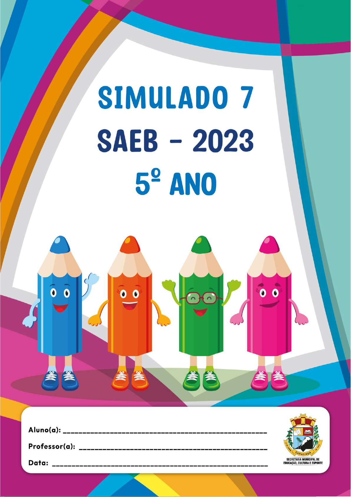1 2 Prefeitura Muninicipal de Caratinga Secretaria Municipal de Educação, Cultura e Esporte Simulado 7- Saeb 2023 – 5º Ano Língua Portuguesa e Matemática Apresentação Caro (a) Aluno (a), Educação Básica, como uma maneira de acompanhar o seu progresso, contribuir com a aquisição segurança e autoconfiança, oferecendo a mesma dinâmica da avaliação oficial. Teremos um conjunto de 50 questões de múltipla escolha, sendo as 20 primeiras de Língua Portuguesa e as demais (30) de Matemática. Leia cada questão com bastante atenção antes de responder e marque suas respostas neste caderno; Use lápis preto para marcar as respostas. Se você quiser alterá-las, pode apagar e marcar novamente; Não deixe questões sem respostas; Cada questão tem uma única resposta correta. Faça um X na questão que você escolher como certa; Ao terminar o simulado confira se não esqueceu alguma questão sem marcação. Terminada a conferência, passe suas respostas para o Gabarito – Folha de Respostas. É momento de ter muita atenção! Marque, com caneta (azul ou preta), as alternativas escolhidas na folha de respostas. Marque apenas uma opção, como no exemplo a seguir: Faça tudo com bastante atenção. 3 BLOCO I – LÍNGUA PORTUGUESA Questão 1 Leia a notícia a seguir. Honestidade: criança devolve dinheiro que achou em livro [...] ―Apesar do senso comum dizer que é preciso levar vantagem em tudo, a honestidade ainda vale a pena‖. Com esse desabafo, o professor de História de uma escola municipal, F. Duarte, contou a história de uma criança que mostrou a essência da palavra honestidade em ações. Emoções à parte, o professor informou que durante a aula de História do 6º ano de manhã, nessa terça-feira (26), a aluna Ana K. de L. M., de apenas 10 anos, pegou um livro da sala de leitura, quando se surpreendeu com a quantia de R$ 300,00 ao folheá-lo. Ao ver o dinheiro, a menina logo anunciou ao professor sobre o que tinha achado. Segundo Duarte, um colega de classe perguntou o porquê de ela ter falado e não ter colocado dentro do bolso. A resposta de Ana K. foi dura: ―Eu não quero ficar com nada de ninguém‖. A criança, então, foi levada de sala em sala, sendo apontada como um exemplo de honestidade a ser seguido pelos demais. [...] NARLLA, H. Tribuna do Ceará, 27 mar. 2013.Disponível em: . Acesso em: 14 dez. 2017. (Fragmento) Nessa notícia, há uma opinião que está expressa em: (A) ―Apesar do senso comum dizer que é preciso levar vantagem em tudo, a honestidade ainda vale a pena.‖ (B) ―[...] a aluna Ana K. de L. M., de apenas 10 anos, pegou um livro da sala de leitura.‖ (C) ―Ao ver o dinheiro, a menina logo anunciou ao professor sobre o que tinha achado.‖ (D) ―[...] um colega de classe perguntou o porquê de ela ter falado e não ter colocado dentro do bolso. -------------------------------------------------------------- Questão 02 Leia o seguinte trecho do conto de Clarice Lispector. Peço a você o favor de gostar logo de Laura porque ela é a galinha mais simpática que já vi. Vive no quintal de Dona Luísa com as outras aves. É casada com um galo chamado Luís. Luís gosta muito de Laura, embora às vezes brigue com ela. Mas briguinha à toa. Acho que vou ter que contar uma verdade. A verdade é que Laura tem o pescoço mais feio que já vi no mundo. Mas você não se importa, não é? Porque o que vale mesmo é ser bonito por dentro. Você tem beleza por dentro? Aposto que tem. Como é que sei? É que estou adivinhando você. LISPECTOR, C. A vida íntima de Laura. In: O mistério do coelho pensante e outros contos. Rio de Janeiro: Rocco Jovens Leitores, 2010. p. 8. (Fragmento) 4 O texto trata de uma galinha chamada Laura. Uma característica de Laura é: (A) valorizar a beleza interior. (B) ter um pescoço muito bonito. (C) ser uma galinha muito simpática. (D) ser casada com um galo. ------------------------------------------------------------ Questão 3 Leia este trecho de um conto de Hans Christian Andersen: O patinho feio A mamãe pata tinha escolhido um lugar ideal para fazer seu ninho: um cantinho bem protegido no meio da folhagem, perto do rio que contornava o velho castelo. Mais adiante estendia-se o bosque e um lindo jardim florido. Naquele lugar sossegado, a pata agora aquecia pacientemente seus ovos. Por fim, após a longa espera, os ovos se abriram um após o outro, e das cascas rompidas surgiram engraçadinhos e miúdos, os patinhos amarelos, que, imediatamente, saltaram do ninho. Porém um dos ovos ainda não se abrira; era um ovo grande, e a pata pensou que não o chocara o suficiente. Impaciente, deu umas bicadas no ovão e ele começou a se romper. No entanto, em vez de um patinho amarelinho saiu uma ave cinzenta e desajeitada. Nem parecia um patinho. [...] (In: Ana Rosa Abrem et al. Alfabetização: livro do aluno. Brasília: Fundescola/SEF-MEC, 2000. p. 69.). A apresentação do ambiente constitui uma parte importante das narrativas. Na história, essa parte ocorre, principalmente, no: (A) primeiro parágrafo. (B) segundo parágrafo. (C) terceiro parágrafo. (D) quarto parágrafo -------------------------------------------------------------- Questão 4 Leia o trecho do texto a seguir: Segundo o biólogo do Museu de Ciências Naturais da Fundação Zoobotânica Glayson Benke, os pombos domésticos, que estão nas ruas e nas praças, representam riscos reais para a saúde dos estudantes. Uma série de doenças é transmitida, principalmente a partir das fezes, de restos de ninho e de penas em decomposição. [...] Disponível em: . Acesso em: 29 jan. 2018. Qual é o assunto principal desse texto? (A) Saúde dos estudantes. (B) Pombos nas ruas e nas praças. (C) Extinção dos pombos da natureza. (D) Doenças transmitidas por pombos ----------------------------------------------------------------- Questão 5 Causos são narrativas orais conservadas e transmitidas pelas pessoas. Leia o fragmento de um causo. Toda a