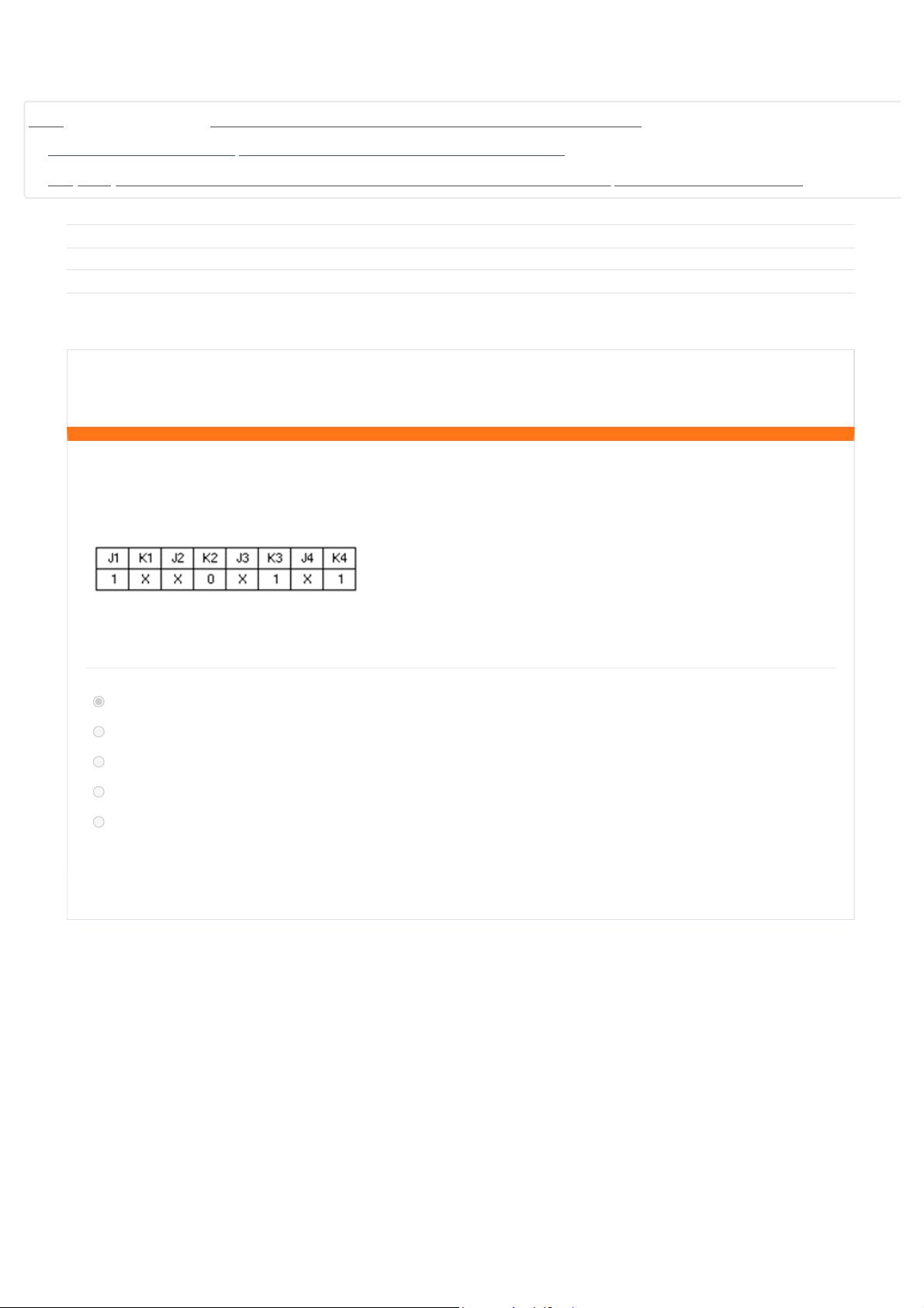 Iniciado em domingo, 9 jun 2024, 10:53 Estado Finalizada Concluída em domingo, 9 jun 2024, 11:59 Tempo empregado 1 hora 5 minutos Questão 1 Completo Vale 0,60 ponto(s). Sabendo que o número registrado pelo circuito contador de 4 bits é 7 (0111), e que os comandos de transição no circuito formado por 4 flip-flops JK são os seguintes Qual será o número a seguir? a. 12. b. 7. c. 2. d. 9. e. 3. Sua resposta está correta. Painel / Minhas Disciplinas / BACHARELADO EM ENGENHARIA ELÉTRICA-disc. 9- ELETRÔNICA DIGITAL / PROVA CURRICULAR - REALIZAÇÃO DIA 07/06/2024 A 09/06/2024 - VALOR 6,0 PONTOS / CLIQUE AQUI PARA REALIZAR A PROVA CURRICULAR - DIA 07/06/2024 A 09/06/2024 - VALOR 6,0 PONTOS - 1ª OPORTUNIDADE https://www.eadunifatecie.com.br/course/view.php?id=37054 https://www.eadunifatecie.com.br/course/view.php?id=37054 https://www.eadunifatecie.com.br/my/ https://www.eadunifatecie.com.br/course/view.php?id=37054 https://www.eadunifatecie.com.br/course/view.php?id=37054#section-12 https://www.eadunifatecie.com.br/mod/quiz/view.php?id=1257583 Questão 2 Completo Vale 0,60 ponto(s). Questão 3 Completo Vale 0,60 ponto(s). A soma de números hexadecimais e a subsequente conversão para binário são operações comuns em ciência da computação e engenharia elétrica. A conversão de hexadecimal para binário pode ser feita convertendo cada dígito hexadecimal em seu equivalente binário de quatro bits. Qual é o resultado EM BINÁRIO da operação de soma em hexadecimal dos números AB e 3F? a. 11101010. b. 10000011. c. 01010111. d. 01100100. e. 11011010. Sua resposta está correta. O sistema hexadecimal é frequentemente usado em programação e ciência da computação. Dado o número hexadecimal 2C, seu desafio é converter este número para o sistema decimal. Qual é o valor decimal correspondente ao número hexadecimal 2C? a. 34. b. 62. c. 30. d. 44. e. 76. Sua resposta está correta. Questão 4 Completo Vale 0,60 ponto(s). Questão 5 Completo Vale 0,60 ponto(s). A operação XOR (⊕) é uma operação lógica fundamental em ciência da computação e engenharia elétrica. Seguindo a sequência das variáveis de entrada (000, 001, 010, 011, 100, 101 …), qual o resultado de saída da expressão ( A+B ) * ( C ) ? a. 0 - 0 - 1 - 1 - 0 - 1 - 1 - 0. b. 1 - 0 - 0 - 1 - 0 - 0 - 1 - 0. c. 0 - 1 - 1 - 1 - 0 - 1 - 0 - 1. d. 0 - 0 -1 - 0 - 1 - 0 - 1 - 0. e. 1 - 0 - 0 - 1 - 1 - 0 - 1 - 1. Sua resposta está correta. Qual a saída da tabela abaixo? a. S=B+A’. b. S=B’+AB. c. Todas as formas estão corretas. d. S=B’+A. e. S=A+B’A’. Sua resposta está correta. Questão 6 Completo Vale 0,60 ponto(s). Questão 7 Completo Vale 0,60 ponto(s). O que são portas lógicas? a. Interfaces gráficas que permitem aos usuários controlar e manipular dados em um computador. b. Dispositivos que permitem a comunicação entre dois ou mais computadores em uma rede local. c. Sistemas que gerenciam a entrada e saída de dados em dispositivos de armazenamento externos. d. Circuitos eletrônicos que fornecem energia elétrica para componentes em um sistema. e. Componentes eletrônicos que recebem um ou mais sinais de entrada e produzem um sinal de saída. Sua resposta está correta. Qual a saída da tabela abaixo? a. S=AB’+A’B. b. S= A+B’. c. S=AB. d. S=A’B’+BA. e. S=(A’+B’)*(B+A). Sua resposta está correta. Questão 8 Completo Vale 0,60 ponto(s). Questão 9 Completo Vale 0,60 ponto(s). Em sistemas de computação e eletrônica digital, a conversão entre diferentes sistemas numéricos, como binário e decimal, é uma habilidade fundamental. Dado isso, considere o número binário 1011. Seu desafio é converter este número binário para o sistema decimal. Qual é o valor decimal correspondente ao número binário 1011? a. 11. b. 14. c. 4. d. 8. e. 13. Sua resposta está correta. Sabendo que o período inicial do sinal de clock é de 1 segundo, qual será o período na saída do circuito? a. 16 segundos. b. 32 segundos. c. 4 segundos. d. 2 segundos. e. 8 segundos. Sua resposta está incorreta. Questão 10 Completo Vale 0,60 ponto(s). Qual é a função principal dos circuitos sequenciais? a. Gerar sinais analógicos a partir de um sinal digital. b. Converter dados analógicos em digitais. c. Conectar dispositivos periféricos a um sistema computacional. d. Os circuitos sequenciais são compostos por um circuito combinacional e elementos de memória que são capazes de armazenar informação binária. e. Controlar o fluxo de energia elétrica em um circuito. Sua resposta está correta. ◄ ENQUETE DE SATISFAÇÃO - EAD UNIFATECIE Seguir para... CLIQUE AQUI PARA REALIZAR A PROVA CURRICULAR - DIA 17/06/2024 A 19/06/2024 - VALOR 6,0 PONTOS - 2ª OPORTUNIDADE ► https://www.eadunifatecie.com.br/mod/feedback/view.php?id=1257582&forceview=1 https://www.eadunifatecie.com.br/mod/quiz/view.php?id=1257584&forceview=1