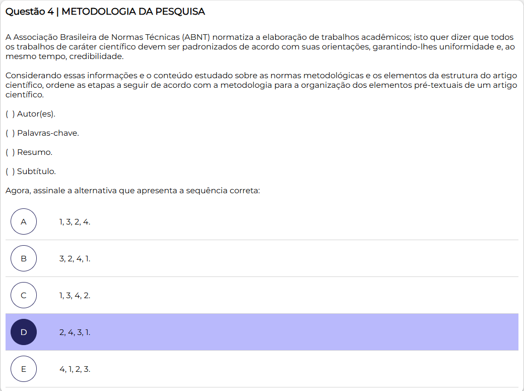 Questão 4 METODOLOGIA DA PESQUISA A Associação Brasileira de Normas Técnicas (ABNT) normatiza a elaboração de trabalhos acadêmicos; isto quer dizer que todos os trabalhos de caráter científico devem ser padronizados de acordo com suas orientações, garantindo-lhes uniformidade e, ao mesmo tempo, credibilidade. Considerando essas informações e conteúdo estudado sobre as normas metodológicas e os elementos da estrutura do artigo ordene as etapas a seguir de acordo com a metodologia para a organização dos elementos pré-textuais de um artigo ( ) Autor(es). ( ) Palavras-chave ( ) Resumo. ( ) Agora, assinale a alternativa que apresenta a sequência correta: A B 3,2,4, 1. 1,3,4, 2. D 2, 3. 1. E