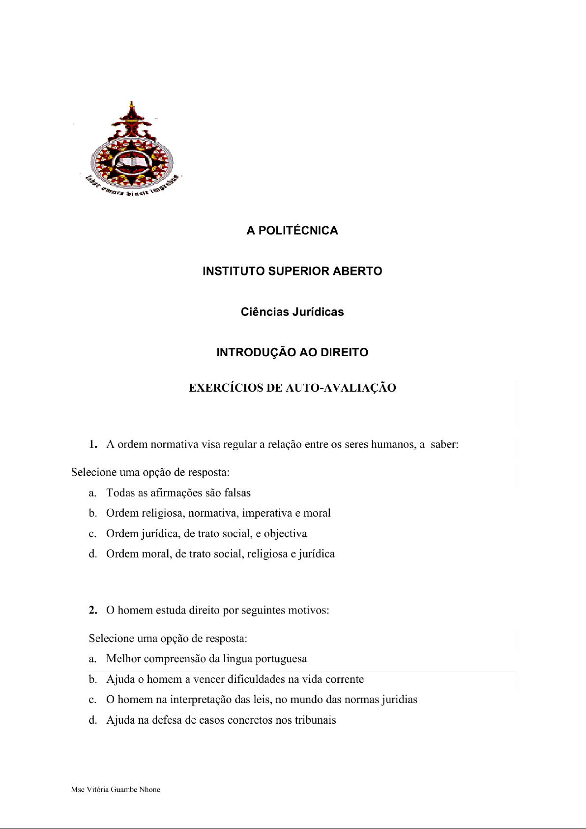 A POLITÉCNICA INSTITUTO SUPERIOR ABERTO Ciências Jurídicas INTRODUÇÃO AO DIREITO EXERCÍCIOS DE AUTO-AVALIAÇÃO 1. A ordem normativa visa regular a relação entre os seres humanos, a saber: Selecione uma opção de resposta: a. Todas as afirmações são falsas b. Ordem religiosa, normativa, imperativa e moral Ordem jurídica, de trato social, e objectiva d. Ordem moral, de trato social, religiosa e jurídica 2. O homem estuda direito por seguintes motivos: Selecione uma opção de resposta: a. Melhor compreensão da lingua portuguesa b. Ajuda o homem a vencer dificuldades na vida corrente O homem na interpretação das leis, no mundo das normas juridias d. Ajuda na defesa de casos concretos nos tribunais Msc Vitória Guambe Nhone3. Sobre a natureza social do homem "O homem é um animal social", Selecione uma opção de resposta: a. homem foi feito para viver em sociedade b. homem foi feito para viver isolado homem não é um animal social é de sua natureza viver isolado d. o homem nunca viveu em comunidade com os seus semelhantes 4. Diga qual é a função da ordem religiosa. 5. A tese Naturalista baseia-se na Ordem e defende que o Homem é um ser "naturalmente social", dizendo que ao Homem dada a sua natureza não lhe é possível desenvolver totalmente as suas capacidades se não se envolver em relação com os outros Homens. Os Naturalistas acreditam que onde existe o Homem, existe sociedade Ubi homo, ibi societas. Selecione uma opção: a. Verdadeiro b. Falso 6. Direito subjectivo é o conjunto de regras gerais, abstractas e imperativas, vigentes num determinado momento, para reger as relações humanas, e impostas, coactivamente, à obediência de todos. Os Códigos Penal, de Processo, Civil etc., bem como qualquer uma de suas regras, são exemplos de direito subjectivo. Selecione uma opção: a. Verdadeiro b. Falso 7. Direito objectivo é constituído pelos poderes, posições de privilégio ou faculdades que as normas de direito subjectivo atribuem às pessoas de modo a que estas possam salvaguardar os seus legítimos interesses: direito à vida, direito à integridade física, direito ao bom nome e à privacidade, direito ao casamento, etc. Selecione uma opção: a. Verdadeiro b. Falso Msc Vitória Guambe Nhone8. Etimologicamente, o termo Direito vem do. Selecione uma opção de resposta: a. Grécia b. Latim Grego d. Espanhol 9. As normas morais só tem relevância para a consciência de cada um, enquanto as normas jurídica impõem ao indivíduo na medida em que são coersivas: Selecione uma opção de resposta: a. Critério do objecto b. Critério da coercibilidade Critério da exterioridade d. Critério do mínimo e ético 10. As sanções aplicadas a indivíduos pelas violações de normas que disciplinam a conduta no seio das igrejas são: Selecione uma opção de resposta: a. Sanções disciplinares b. Sanções civis Sanções criminais d. Sanções religiosas 11. Quais são as características das ordens jurídicas? Selecione uma opção de resposta: a. Imperatividade, previsão e generalidade b. Abstração, previsão, generalidade e coercibilidade necessidade, exterioridade, imperatividade, coercibilidade d. Genialidade, imperatividade, previsão e coercibilidade Msc Vitória Guambe Nhone12. A norma jurídica, na sua forma primária é composta de previsão estatuição e sanção. Selecione uma opção: a. Verdadeiro b. Falso 13. Previsão - é o estabelecimento, como consequência da necessidade de uma conduta. Selecione uma opção: a. Verdadeiro b. Falso 14. Estatuição - é a representação futura do evento ou situação da Vida. Selecione uma opção: a. Verdadeiro b. Falso 15. As funções gerais do direito são: Selecione uma opção de resposta: a. Protectora b. Todas as alternativas estão corretas Organizadora d. Moderadora e politica 16. A justiça e a segurança são dois fins do Direito, refira-se pormenorizadamente a cada um deles. 17. Diferencie Civil Law e Common Law. 18. que foi o código de hamurabi, quais as suas características e qual foi sua importância? 19. No Direito Romano, como era feita a divisão da sociedade? Msc Vitória Guambe Nhone20. Quais eram as características do direito grego? 21. Para o jurista, Porque é importante o estudo da história do direito? Msc Vitória Guambe Nhone