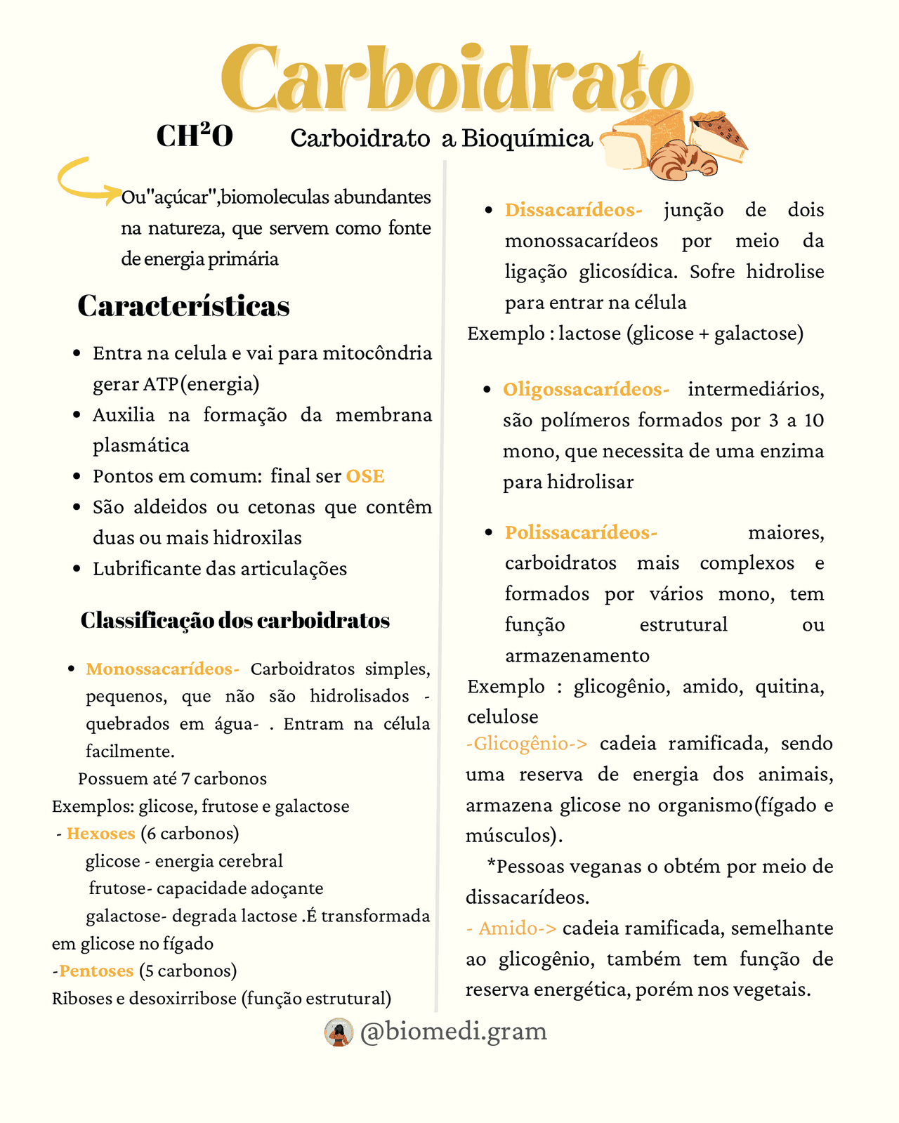 Carboidrato CH20 Carboidrato a Bioquímica abundantes Dissacarídeos- junção de dois na natureza, que servem como fonte monossacarídeos por meio da de energia primária ligação glicosídica. Sofre hidrolise Características para entrar na célula Exemplo : lactose (glicose + galactose) Entra na celula e vai para mitocôndria gerar ATP (energia) intermediários, Auxilia na formação da membrana são polímeros formados por 3 a 10 plasmática mono, que necessita de uma enzima Pontos em comum: final ser OSE para hidrolisar São aldeidos ou cetonas que contêm duas ou mais hidroxilas Polissacarídeos- maiores, Lubrificante das articulações carboidratos mais complexos e formados por vários mono, tem Classificação dos carboidratos função estrutural ou armazenamento Carboidratos simples, pequenos, que não são hidrolisados Exemplo : glicogênio, amido, quitina, quebrados em água- Entram na célula celulose facilmente. -Glicogênio-> cadeia ramificada, sendo Possuem até 7 carbonos uma reserva de energia dos animais, Exemplos: glicose, frutose e galactose armazena glicose no organismo (fígado e Hexoses (6 carbonos) músculos). glicose - energia cerebral *Pessoas veganas o obtém por meio de frutose- capacidade adoçante dissacarídeos. galactose- degrada lactose transformada - Amido-> cadeia ramificada, semelhante em glicose no fígado ao glicogênio, também tem função de (5 carbonos) Riboses e desoxirribose (função estrutural) reserva energética, porém nos vegetais. @biomedi.gram