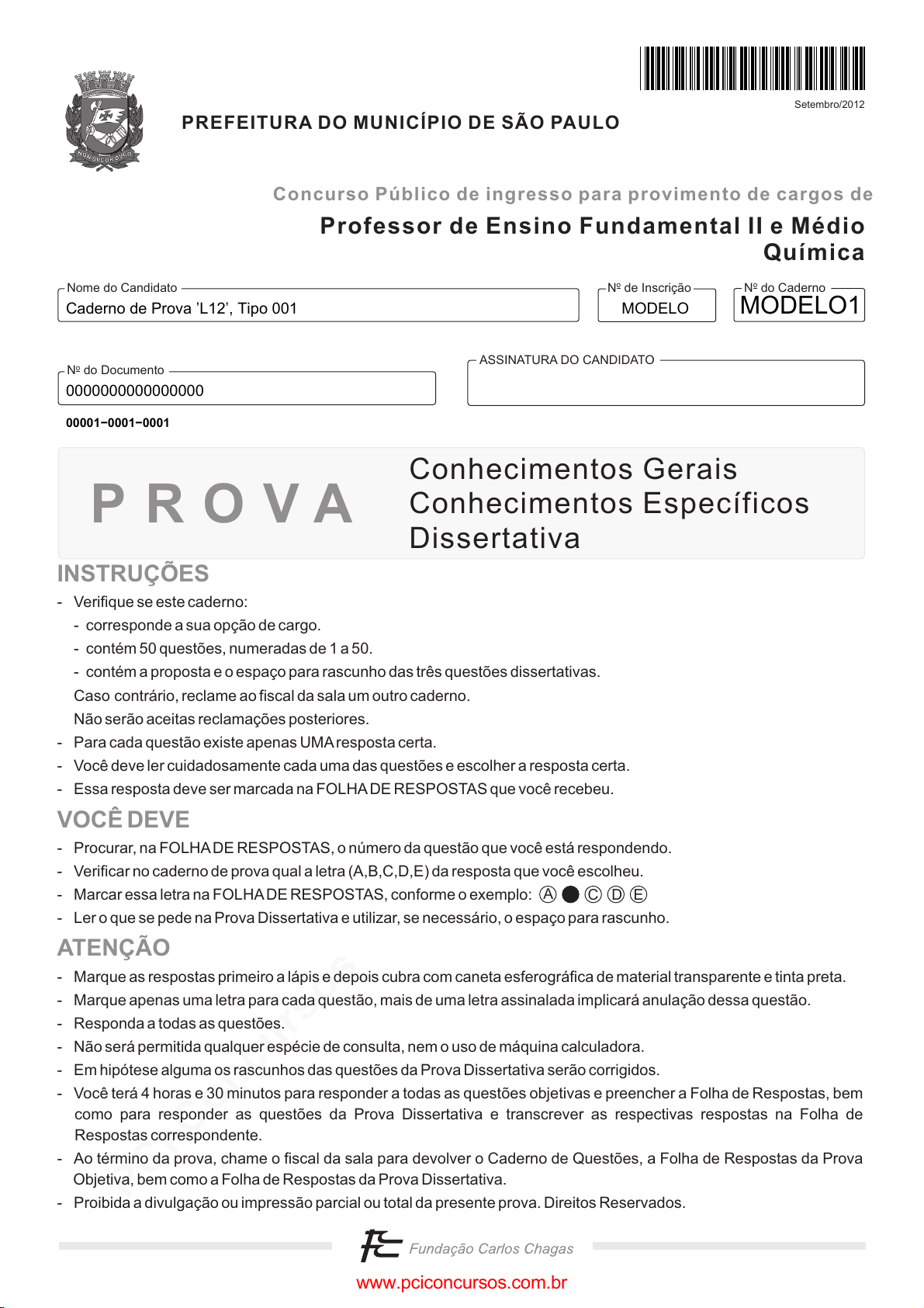 pcimarkpci MDAwMDowMDAwOjAwMDA6MDAwMDowMDAwOmZmZmY6MmQ4YzpjMWIx:U3VuLCAyMyBNYXIgMjAyNSAxODo1NDozMSAtMDMwMA== www.pciconcursos.com.br PREFEITURA DO MUNICÍPIO DE SÃO PAULO Professor de Ensino Fundamental II e Médio Química Concurso Público de ingresso para provimento de cargos de N do CadernooN de Inscriçãoo ASSINATURA DO CANDIDATO N do Documentoo Nome do Candidato Conhecimentos Gerais Conhecimentos Específicos Dissertativa P R O V A Setembro/2012 INSTRUÇÕES VOCÊ DEVE ATENÇÃO - Verifique se este caderno: - corresponde a sua opção de cargo. - contém 50 questões, numeradas de 1 a 50. - contém a proposta e o espaço para rascunho das três questões dissertativas. Caso contrário, reclame ao fiscal da sala um outro caderno. Não serão aceitas reclamações posteriores. - Para cada questão existe apenas UMAresposta certa. - Você deve ler cuidadosamente cada uma das questões e escolher a resposta certa. - Essa resposta deve ser marcada na FOLHADE RESPOSTAS que você recebeu. - Procurar, na FOLHADE RESPOSTAS, o número da questão que você está respondendo. - Verificar no caderno de prova qual a letra (A,B,C,D,E) da resposta que você escolheu. - Marcar essa letra na FOLHADE RESPOSTAS, conforme o exemplo: - Ler o que se pede na Prova Dissertativa e utilizar, se necessário, o espaço para rascunho. - Marque as respostas primeiro a lápis e depois cubra com caneta esferográfica de material transparente e tinta preta. - Marque apenas uma letra para cada questão, mais de uma letra assinalada implicará anulação dessa questão. - Responda a todas as questões. - Não será permitida qualquer espécie de consulta, nem o uso de máquina calculadora. - Em hipótese alguma os rascunhos das questões da Prova Dissertativa serão corrigidos. - Você terá 4 horas e 30 minutos para responder a todas as questões objetivas e preencher a Folha de Respostas, bem como para responder as questões da Prova Dissertativa e transcrever as respectivas respostas na Folha de Respostas correspondente. - Ao término da prova, chame o fiscal da sala para devolver o Caderno de Questões, a Folha de Respostas da Prova Objetiva, bem como a Folha de Respostas da Prova Dissertativa. - Proibida a divulgação ou impressão parcial ou total da presente prova. Direitos Reservados. A C D E Caderno de Prova ’L12’, Tipo 001 MODELO 0000000000000000 MODELO1 00001−0001−0001 www.pciconcursos.com.br pcimarkpci MDAwMDowMDAwOjAwMDA6MDAwMDowMDAwOmZmZmY6MmQ4YzpjMWIx:U3VuLCAyMyBNYXIgMjAyNSAxODo1NDozMSAtMDMwMA== www.pciconcursos.com.br 2 PMSPP-Conhecimentos Gerais1 CONHECIMENTOS GERAIS 1. Segundo Monica Thurler, culturas profissionais cooperativas emergem quando o sistema (A) equilibra os efeitos pouco previsíveis produzidos pelas culturas cooperativas e faz uso de estratégias sutis de controle dos eixos centrais da política educativa. (B) induz o desenvolvimento de projetos locais e a introdução de formas de ensino em comum, que exigem o trabalho colaborativo dos professores. (C) assume o código deontológico produzido pelos professores, conferindo aos estabelecimentos ampla liberdade para tomar decisões e avaliar resultados. (D) concede a autonomia necessária aos atores da situação para desenvolverem as soluções locais, adaptadas e coerentes às suas possibilidades e competências. (E) institucionaliza a colegiatura forçada por meio de mecanismos burocráticos e estruturais que levam naturalmente à pla- nificação e execução do trabalho. 2. Philippe Perrenoud estuda o trabalho sobre o habitus na formação de professores, afirmando que I. os saberes procedimentais evoluem à medida que se avança no ciclo de vida profissional e parte deles amplia o habitus e tornam-se conhecimentos-em-ação. II. nosso habitus é constituído pelo conjunto de nossos esquemas de percepção, de avaliação, de pensamento e de ação. III. a formação de professores não comporta o desenvolvimento de habitus profissionais em razão de a ação docente ser refomulada de forma constante. IV. na urgência não reagimos ao acaso, mas em função de nosso habitus, na ilusão da espontaneidade e da liberdade. V. a transformação de um habitus é um trabalho de muito fôlego, porém com resultados estáveis, mesmo em momentos de risco ou de desestabilização. Estão corretas APENAS as afirmações (A) I, II e IV. (B) I, III e IV. (C) II, IV e V. (D) II, III, e V. (E) I, IV, e V. 3. Segundo Charles Hadji, a avaliação formadora envolve a auto avaliação dos alunos como meio de (A) privilegiar a autorregulação da aprendizagem pelo aluno. (B) ampliar os instrumentos de avaliação com a prática de autonotação. (C) desenvolver a necessidade de ações remediativas. (D) ampliar a aceitação da imposição de avaliações sistemáticas de elaboração centralizada. (E) aceitar e memorizar a correção do erro para não mais repeti-lo. 4. A questão central discutida por Jussara Hoffman, em “A escola quer alunos diferentes”, trata (A) da padronização dos parâmetros de julgamento e autonomia das práticas utilizadas na escola. (B) do dilema da objetividade na elaboração das avaliações da aprendizagem na escola. (C) da necessidade de revisão das práticas avaliativas no contexto próprio da diversidade. (D) da contradição inerente à avaliação da aprendizagem numa escola de massas. (E) da diversidade da clientela escolar: os que aprendem e os que não aprendem. 5. A educação inclusiva constitui uma proposta educacional que reconhece e garante o direito de todos os estudantes de compartilhar um mesmo espaço escolar, sem discriminações de qualquer natureza. As escolas inclusivas são escolas para todos, implicando um sistema educacional que reconheça e atenda as diferenças individuais, respeitando as necessidades de quaisquer dos estudantes. Considerando a inclusão de estudantes com deficiência intelectual e conforme as recomendações e estratégias para a gestão da sala de aula dos prof