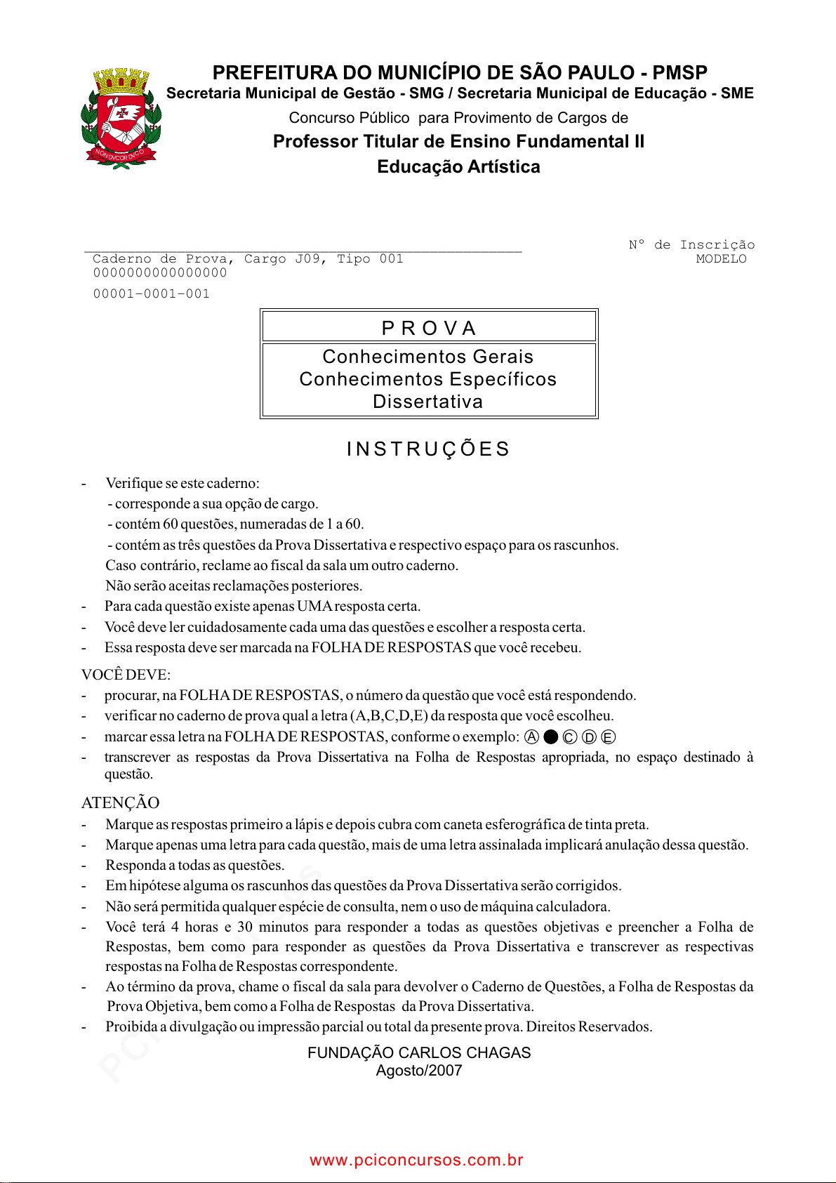 pcimarkpci MDAwMDowMDAwOjAwMDA6MDAwMDowMDAwOmZmZmY6MmQ4YzpjMWIx:U3VuLCAyMyBNYXIgMjAyNSAxODo1MTo1MCAtMDMwMA== www.pciconcursos.com.br I N S T R U Ç Õ E S FUNDAÇÃO CARLOS CHAGAS Agosto/2007 Professor Titular de Ensino Fundamental II Educação Artística Concurso Público para Provimento de Cargos de PREFEITURA DO MUNICÍPIO DE SÃO PAULO - PMSP Secretaria Municipal de Gestão - SMG / Secretaria Municipal de Educação - SME A C D E - Verifique se este caderno: - corresponde a sua opção de cargo. - contém 60 questões, numeradas de 1 a 60. - contém as três questões da Prova Dissertativa e respectivo espaço para os rascunhos. Caso contrário, reclame ao fiscal da sala um outro caderno. Não serão aceitas reclamações posteriores. - Para cada questão existe apenas UMAresposta certa. - Você deve ler cuidadosamente cada uma das questões e escolher a resposta certa. - Essa resposta deve ser marcada na FOLHADE RESPOSTAS que você recebeu. VOCÊ DEVE: - procurar, na FOLHADE RESPOSTAS, o número da questão que você está respondendo. - verificar no caderno de prova qual a letra (A,B,C,D,E) da resposta que você escolheu. - marcar essa letra na FOLHADE RESPOSTAS, conforme o exemplo: - transcrever as respostas da Prova Dissertativa na Folha de Respostas apropriada, no espaço destinado à questão. - Marque as respostas primeiro a lápis e depois cubra com caneta esferográfica de tinta preta. - Marque apenas uma letra para cada questão, mais de uma letra assinalada implicará anulação dessa questão. - Responda a todas as questões. - Em hipótese alguma os rascunhos das questões da Prova Dissertativa serão corrigidos. - Não será permitida qualquer espécie de consulta, nem o uso de máquina calculadora. - Você terá 4 horas e 30 minutos para responder a todas as questões objetivas e preencher a Folha de Respostas, bem como para responder as questões da Prova Dissertativa e transcrever as respectivas respostas na Folha de Respostas correspondente. - Ao término da prova, chame o fiscal da sala para devolver o Caderno de Questões, a Folha de Respostas da Prova Objetiva, bem como a Folha de Respostas da Prova Dissertativa. - Proibida a divulgação ou impressão parcial ou total da presente prova. Direitos Reservados. ATENÇÃO Conhecimentos Gerais Conhecimentos Específicos Dissertativa P R O V A ____________________________________________________ Caderno de Prova, Cargo J09, Tipo 001 0000000000000000 00001−0001−001 Nº de Inscrição MODELO www.pciconcursos.com.br pcimarkpci MDAwMDowMDAwOjAwMDA6MDAwMDowMDAwOmZmZmY6MmQ4YzpjMWIx:U3VuLCAyMyBNYXIgMjAyNSAxODo1MTo1MCAtMDMwMA== www.pciconcursos.com.br 2 PMSPP-Conh-Gerais1 CONHECIMENTOS GERAIS 1. A Constituição Federal de 1988 (art. 206) estabelece que o ensino será ministrado com base nos seguintes princípios: I. igualdade de condições para o acesso e permanência na escola; II. gratuidade do ensino fundamental em qualquer estabelecimento, para os alunos pobres; III. pluralismo de idéias e de concepções pedagógicas; IV. liberdade de aprender, ensinar e pesquisar; V. gestão democrática, dos ensinos público e privado; VI. garantia de padrão de qualidade. É correto o que se afirma APENAS em (A) I, II e V. (B) I, III e VI. (C) II, III, IV e V. (D) I, III, IV e VI. (E) II, IV, V e VI. _________________________________________________________ 2. Segundo o Estatuto da Criança e do Adolescente (ECA) − Lei no 8.069/90 − no seu art. 15, “a criança e o adolescente têm direito à liberdade, ao respeito e à dignidade como pessoas humanas em processo de desenvolvimento e como sujeitos de direitos civis, humanos e sociais garantidos na Constituição e nas leis”. Nos termos da lei, o direito à liberdade compreende, entre outros, os seguintes aspectos: (A) ir, vir e estar nos logradouros públicos e espaços comunitários, ressalvadas as restrições legais; opinar e expressar-se e buscar refúgio, auxílio e orientação. (B) ter uma crença e participar de culto religioso, acompanhada de pais ou responsáveis, quando menor de doze anos e participar da vida política, a partir dos dezoito anos. (C) ter acesso aos bens culturais, cabendo a censura a seus responsáveis, conforme legislação complementar, e ser matriculado na rede regular de ensino. (D) participar da vida familiar e comunitária desde que em ambiente livre da presença de pessoas dependentes de substâncias entorpecentes. (E) participar nos estabelecimentos públicos de ensino, da definição de critérios avaliativos praticados pela escola e recorrer ao Conselho de Escola e órgãos superiores quando se sentir prejudicado. 3. 'Aprender a aprender' (noção vinculada a 'auto- aprendizagem', 'educação permanente', 'autodidatismo') é um lema corrente no discurso educativo. Porém, segundo Rosa Maria Torres, pouco tem sido feito concretamente, nesse terreno, visando assumir esse objetivo porque parte substancial do aprender e da possibilidade de aprimorar a própria aprendizagem exige, por parte do professor, as seguintes ações: I. refletir sobre a própria aprendizagem; II. tomar consciência das estratégias e dos estilos cognitivos individuais; III. reconstruir os itinerários seguidos; IV. identificar as dificuldades encontradas e os pontos de apoio que permitem avançar. V. propor atividades dinâmicas para casa, como a pesquisa via Internet. É correto o que se afirma APENAS em (A) I, II e V. (B) I, III e IV. (C) I, II, III e IV. (D) II, III, IV e V. (E) II, IV e V. _________________________________________________________ 4. Para Antoni Zabala, aprender significa (A) assimilar um determinado conhecimento ensinado, de forma a conseguir reproduzi-lo nas várias situações de avaliação. (B) obter conteúdos novos que devem ser trabalhados sistematicamente para possibilitar a assimilação destes pelo aluno. (C) adquirir conhecimentos e habilidades que permitam a construção de novos conhecimentos. (D) construir o seu próprio conhecim